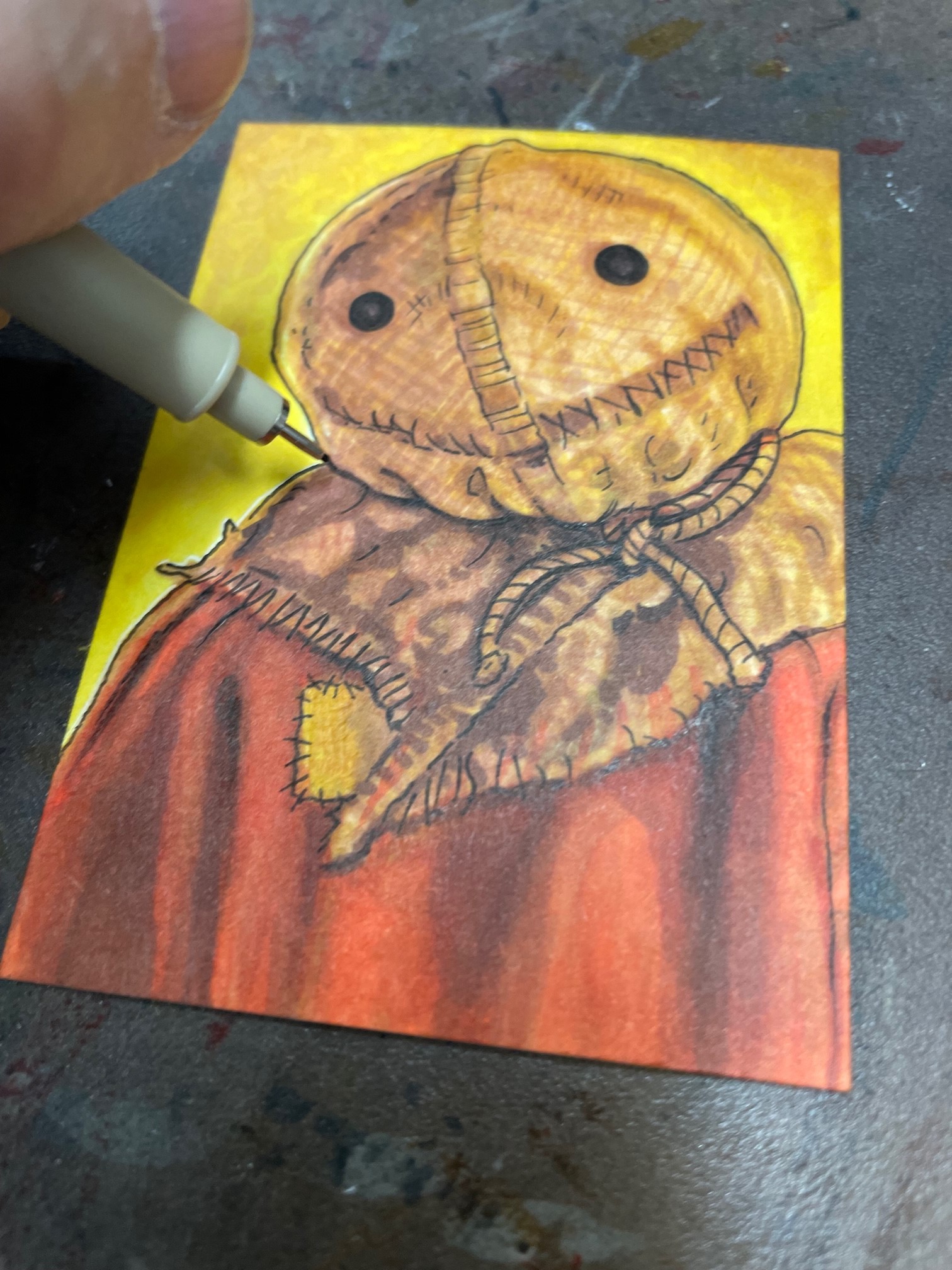 Like the other Sam sketchcard, for this one I started off with a Bic click pencil. I usually use the click pencils or a yellow #2 one. Once penciled I started with some browns and orange design markers.