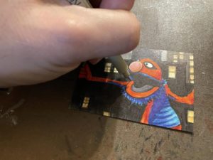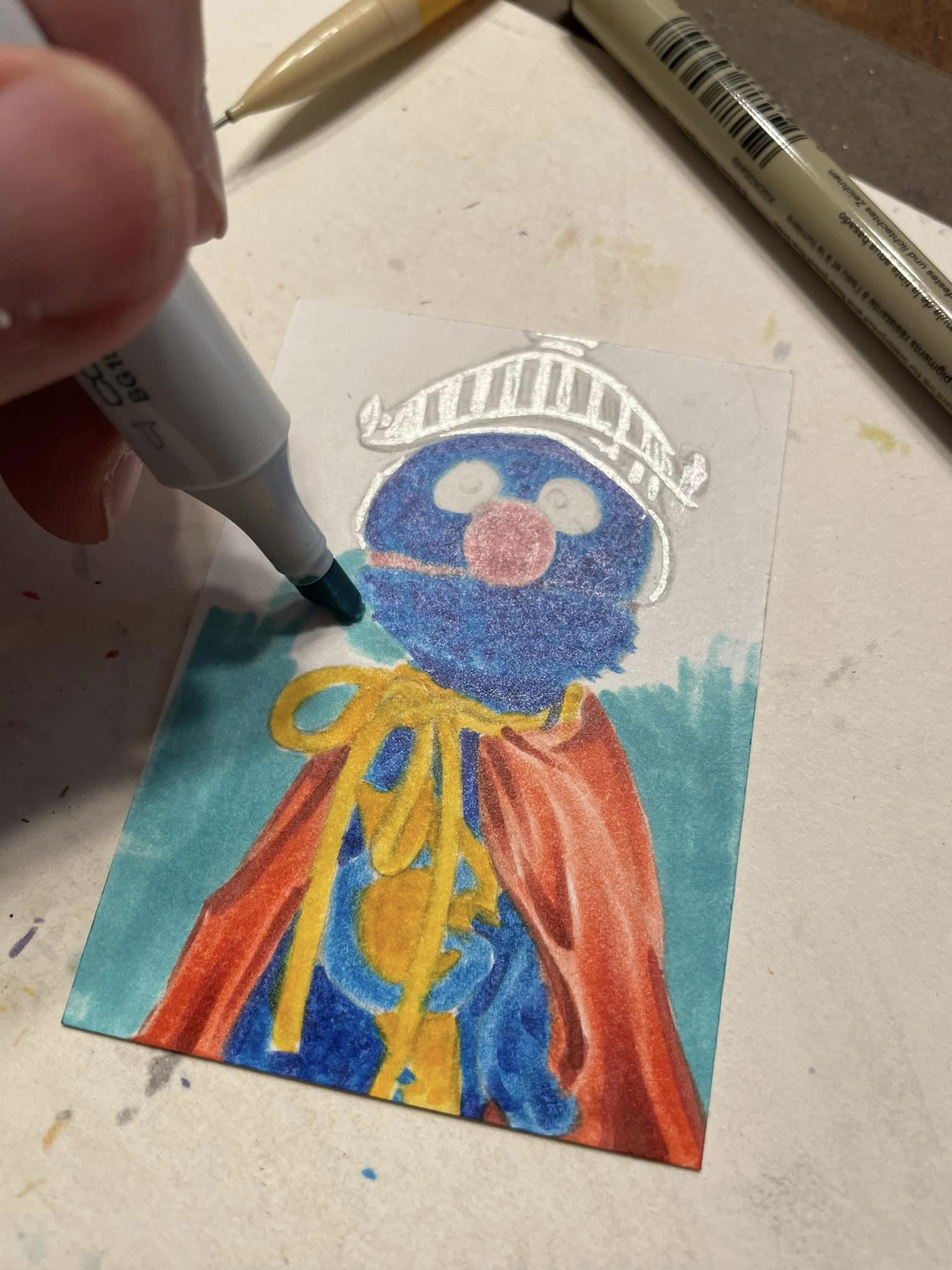 I did the same steps for Super-Grover sketchcard, but added a bit of a metalic effect with a silver gel pen.