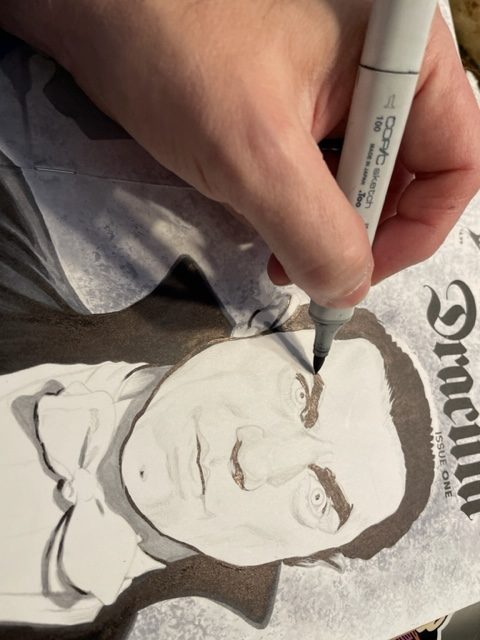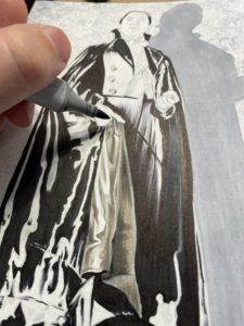 I started off on this comic by taking a couple Bela/Dracula photos into Photoshop and getting them to the proper sizes for the comic cover, printed it out, then transferred the images onto the comic by using graphite I had rubbed on the back of the printout. I traced the outlines and marked some of the details’ locations with a yellow #2 pencil. This technique is kind of like using carbon paper.