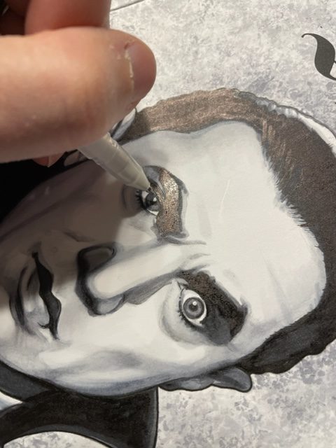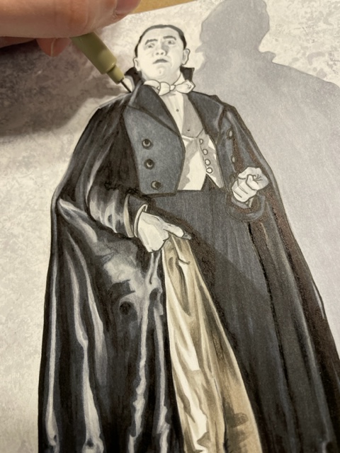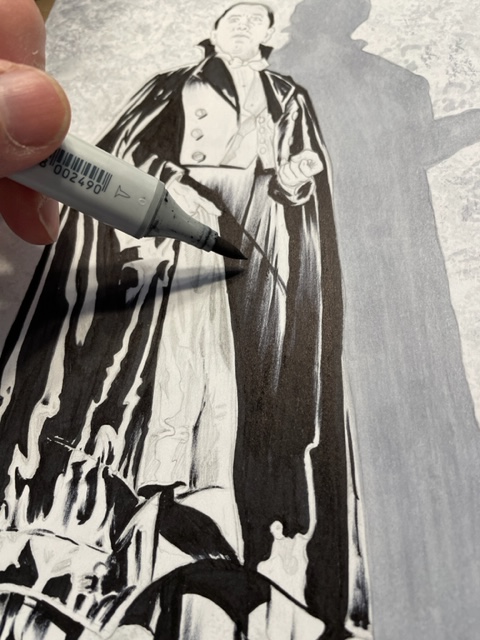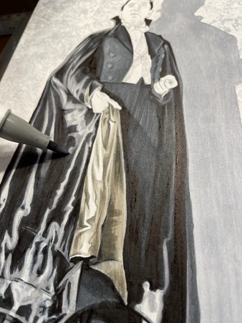 I used the brush tips on the markers for the details and blending, and the broad chisel points to fill in the larger solit areas. I used a comination of cool, warm, and neutral grey Copic makers, as well as some Weisbrandt ones, too. The “red” of his cape was done with warm markers.