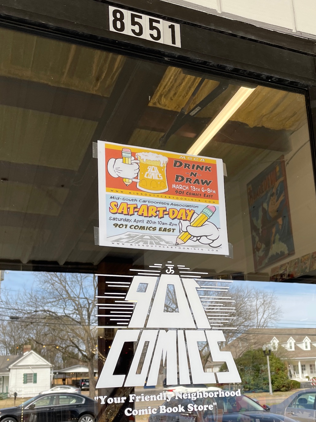 I’ll be at the shop for the next Mid-South Cartoonists Association’s Drink-N-Draw (March 13th, 6-8pm) and Sat-Art-Day (April 20, 10am-2pm), as well as this year’s Free Comic Book Day (May 4th). I’ll be set up in-store along with some of the other MSCA members.