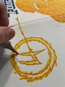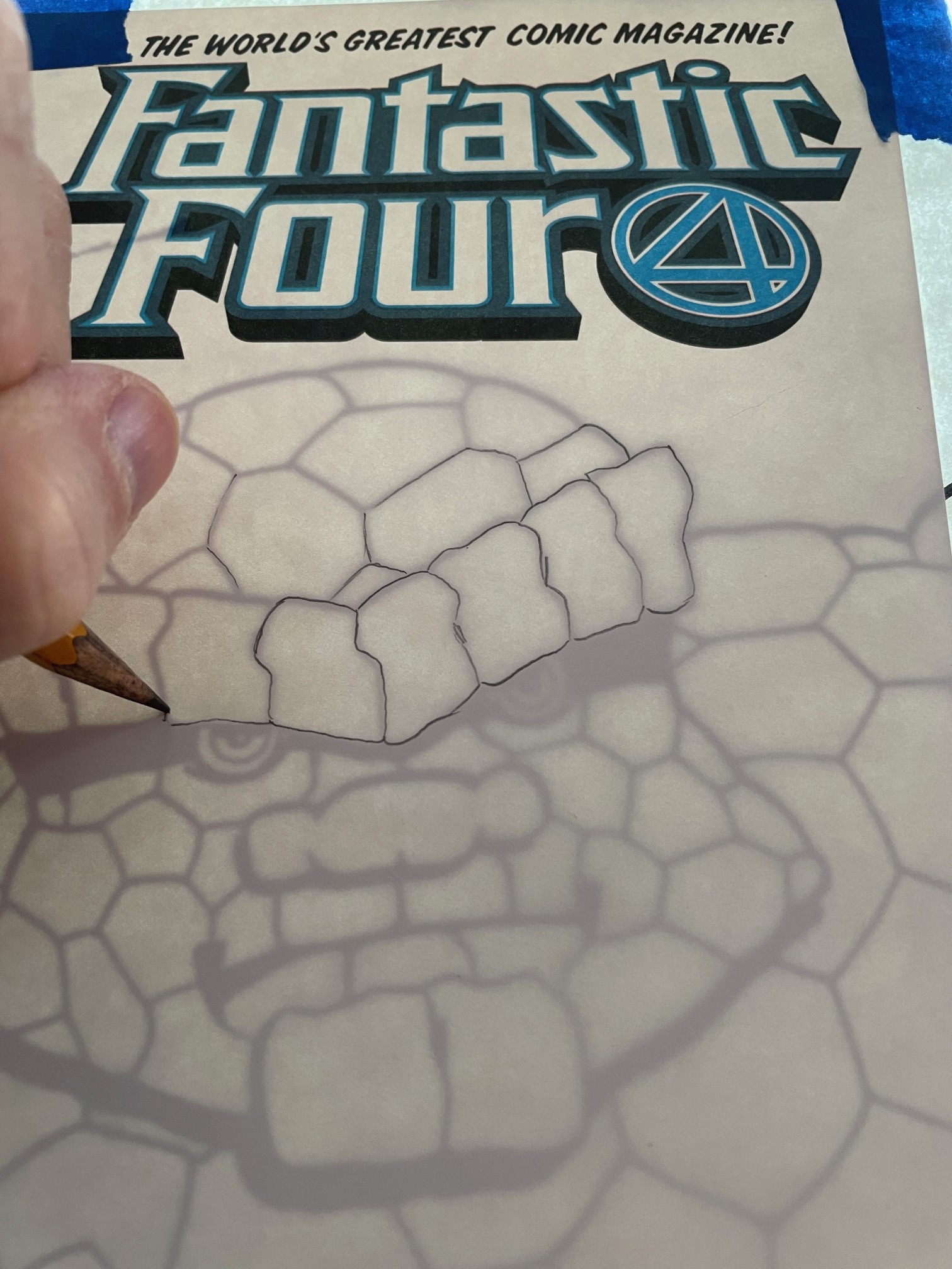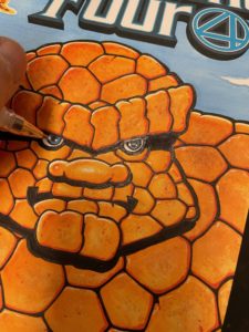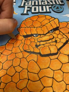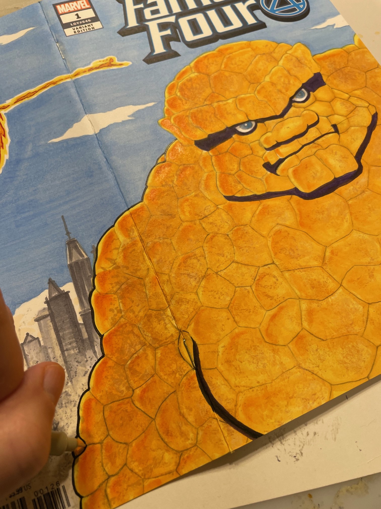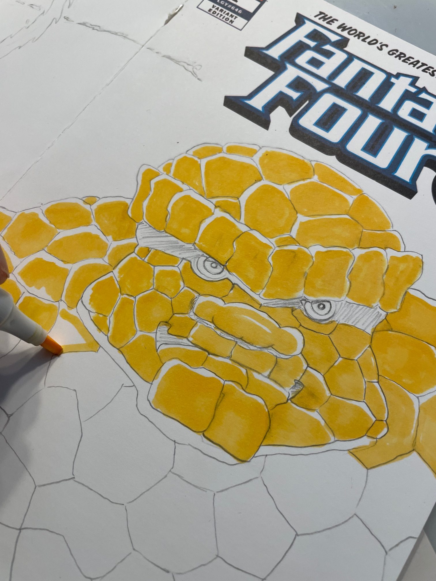I used a variety of markers on this comic- Copic, Ohuhu, Touch New, and Weisbrandt markers. I started off with a few different shades of orange and golden yellow on the Thing’s rocky hide.