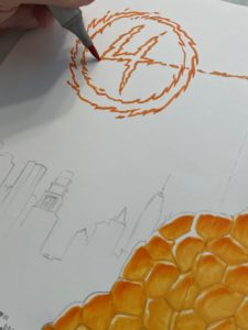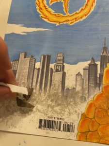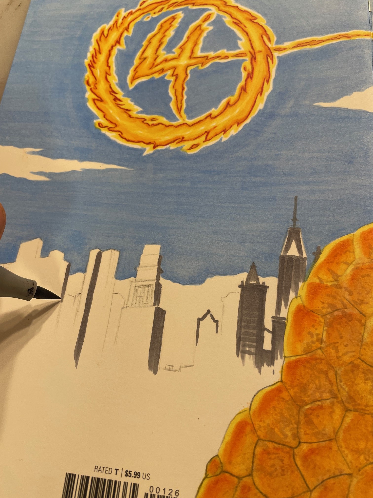 I then used a few shades of grey for the background buildings, and did some stippling with a tissue and a Copic refill to create . Aslo did a bit of that technique with a reddish orange on the Thing’s skin.