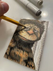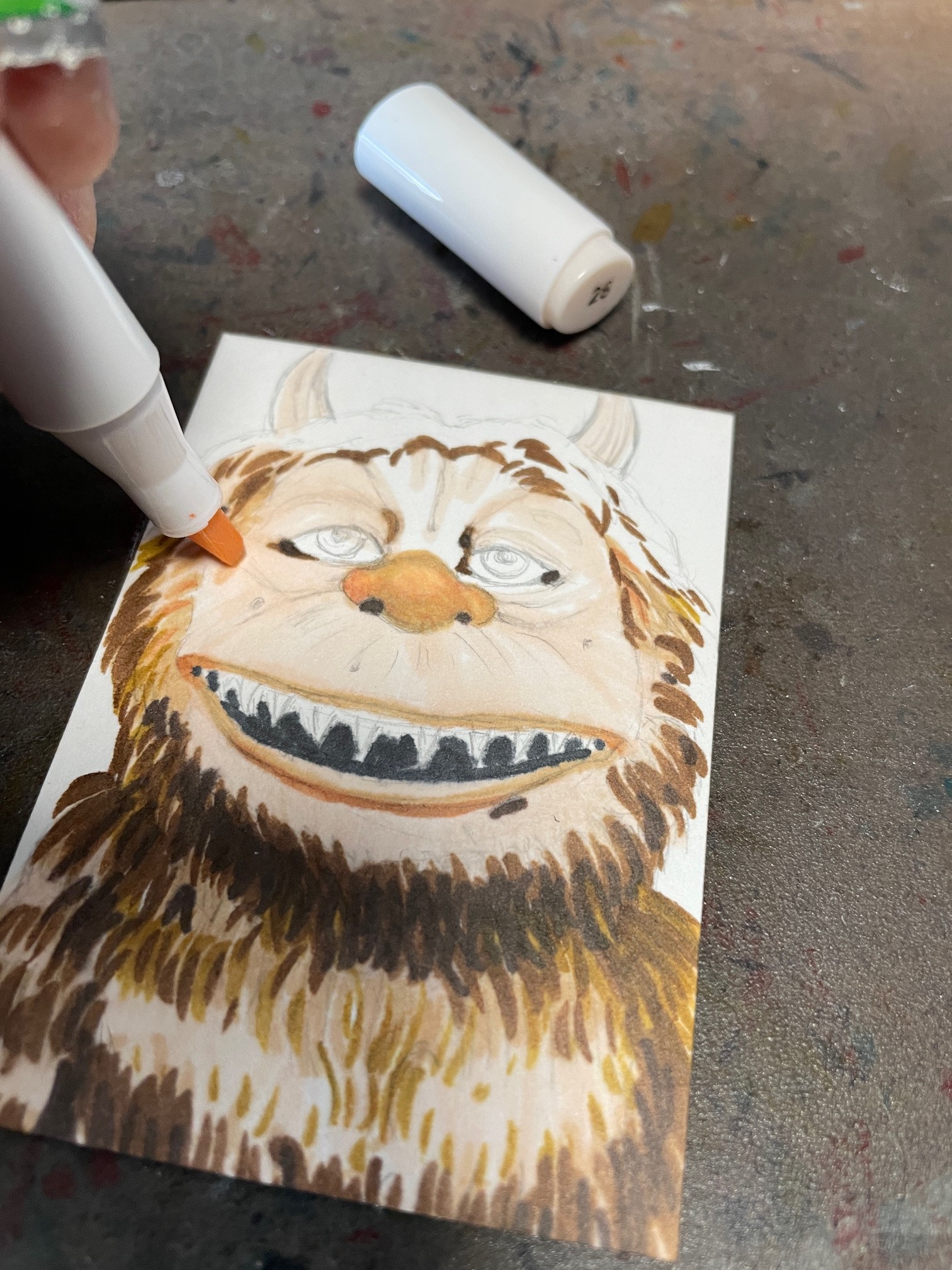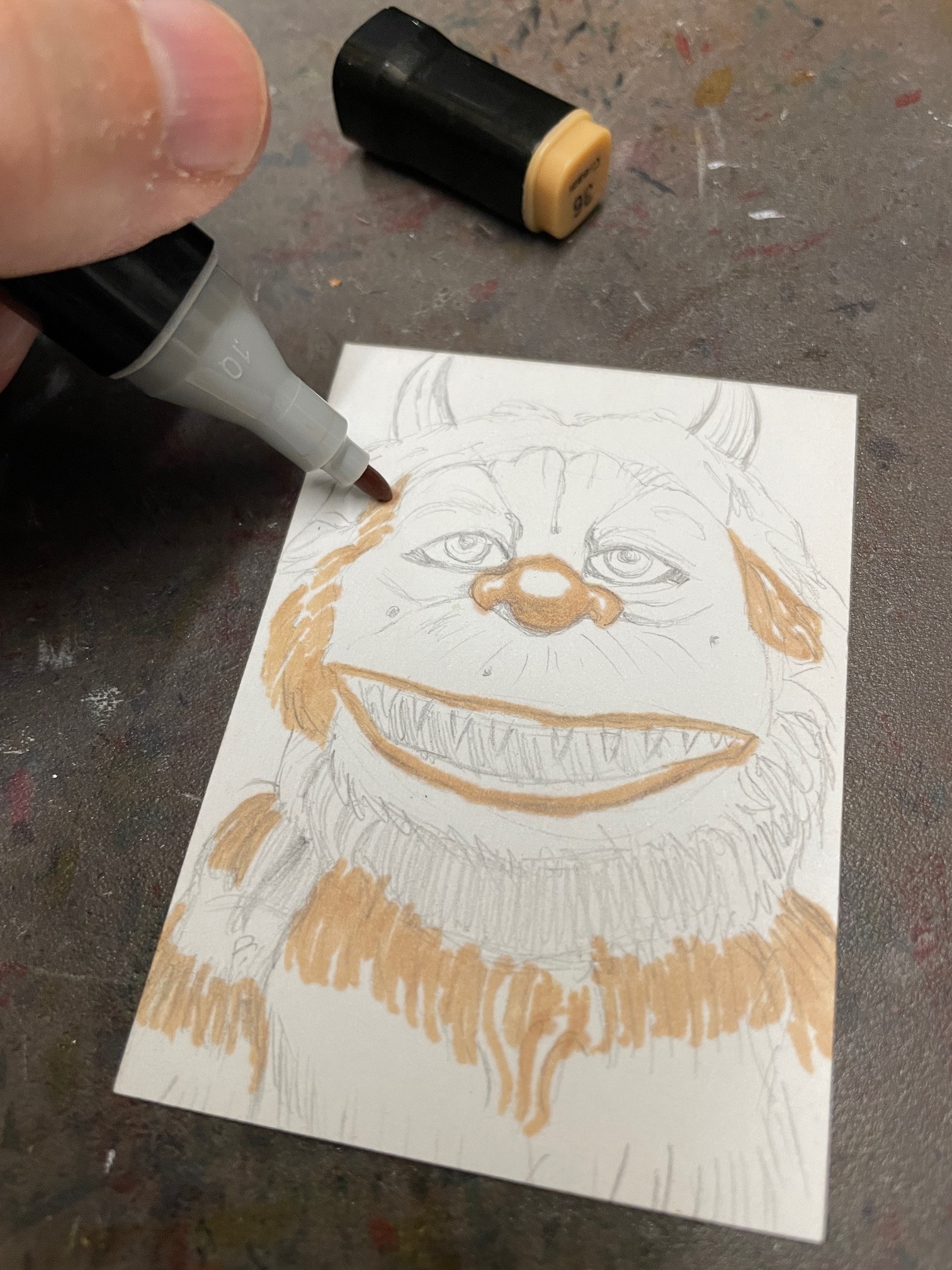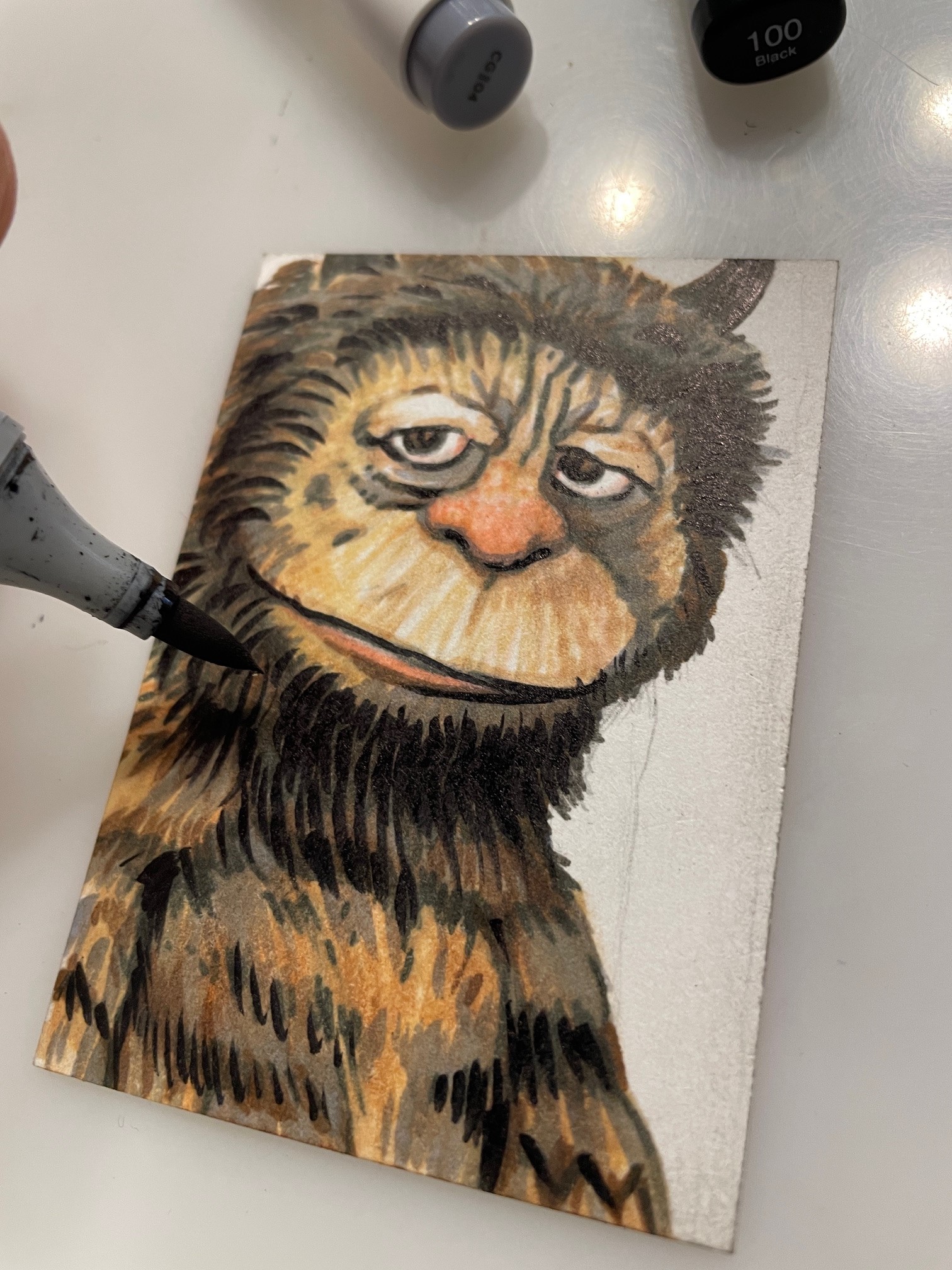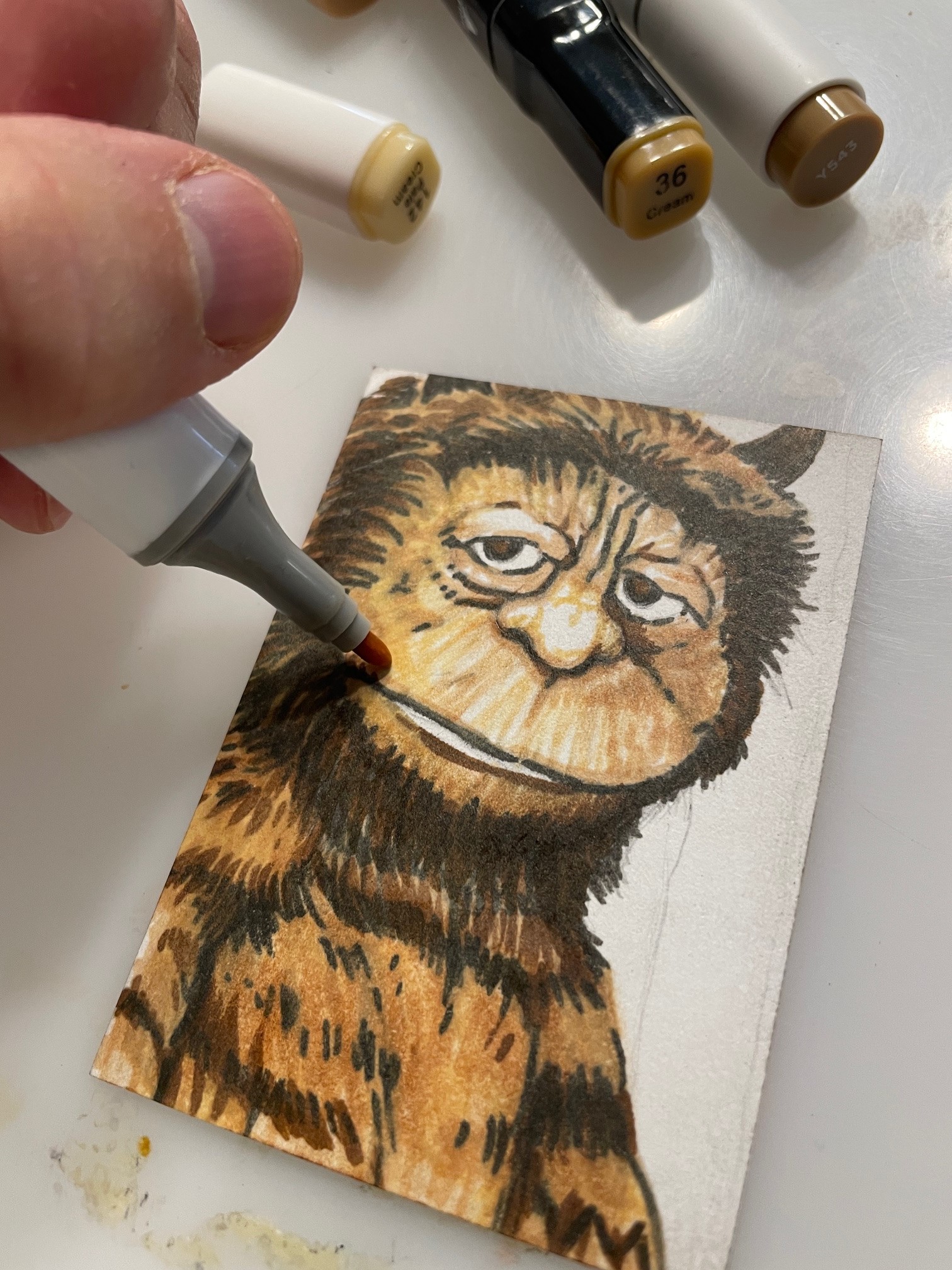 Then I broke out my bags of markers and used various shades of eathtones on his fur, and some pink on his lips and nose. Then added in the background in greys.