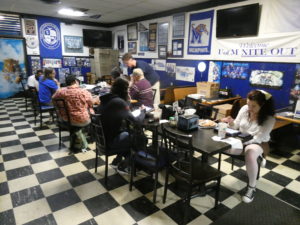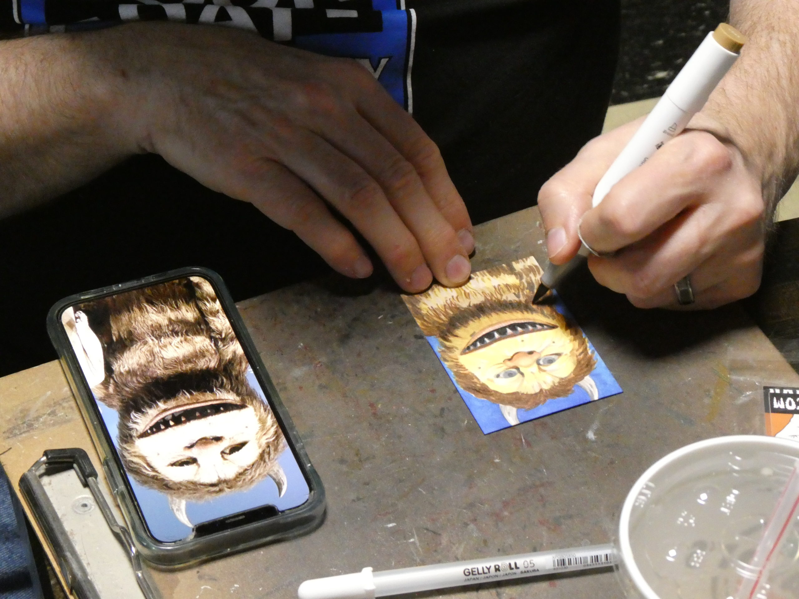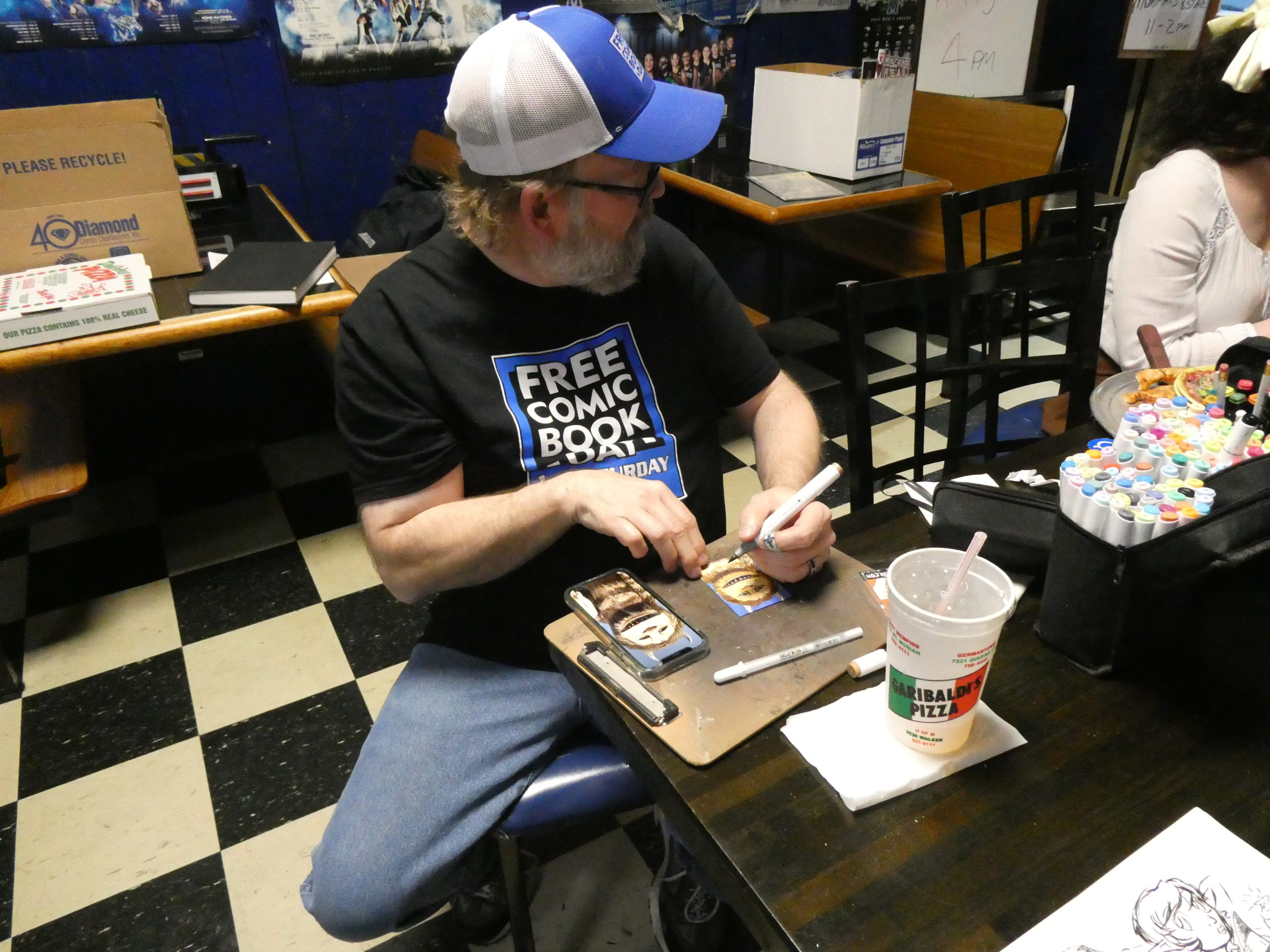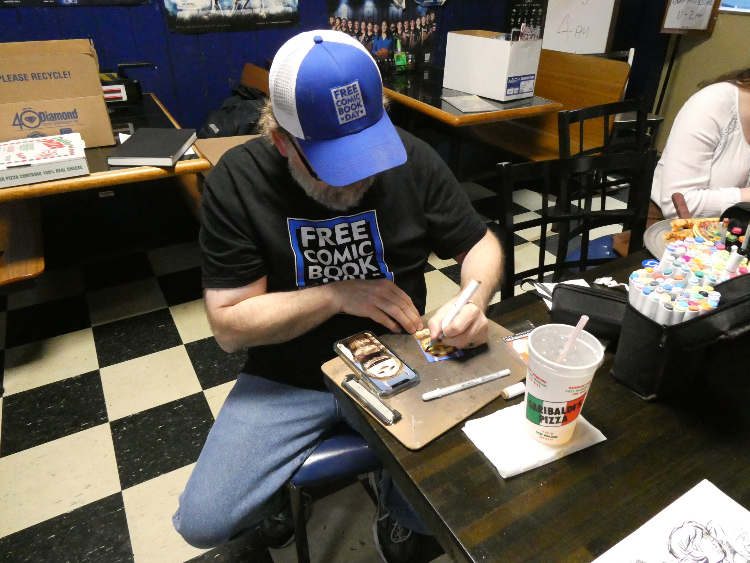 I started drawing the card at work at the comic shop, and later took it to the April monthly Mid-South Cartoonists Association dinner gathering at Garibaldi’s Pizza.