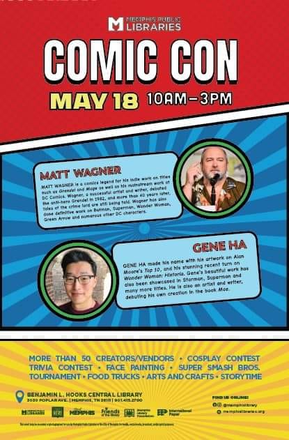 I’ll be set up out at 901 Comics East for Free Comic Book Day this Saturday (May the fourth be with you!) from 10am-2pm, and at the Memphis Public Libraries’ Comic Con on May 18th at the main library on Poplar Avenue from 10am-3pm. Both events are free to attend, and several of my fellow Mid-South Cartoonists Association members will be there, too.