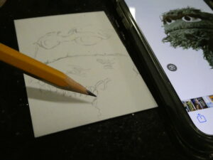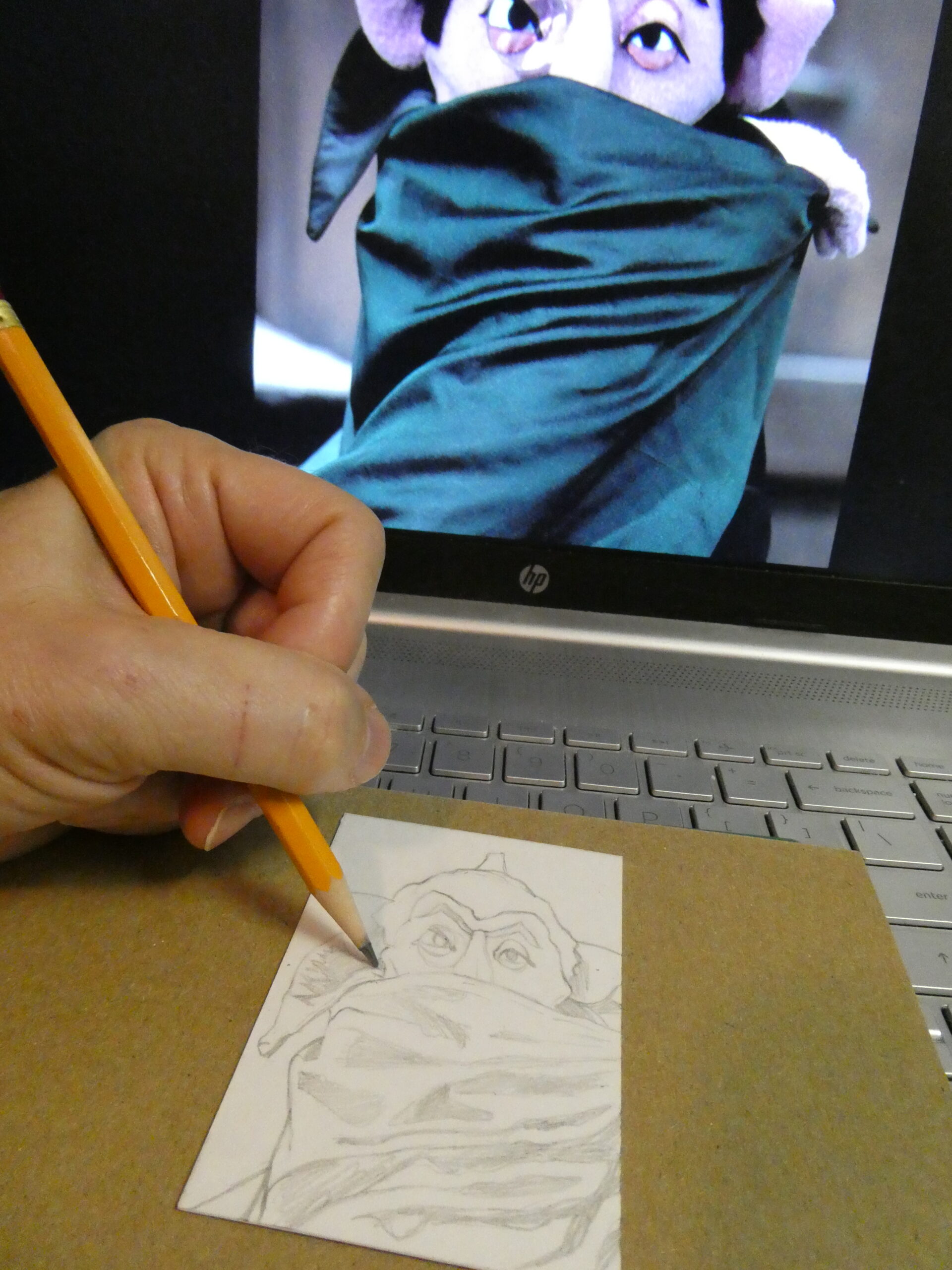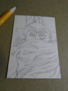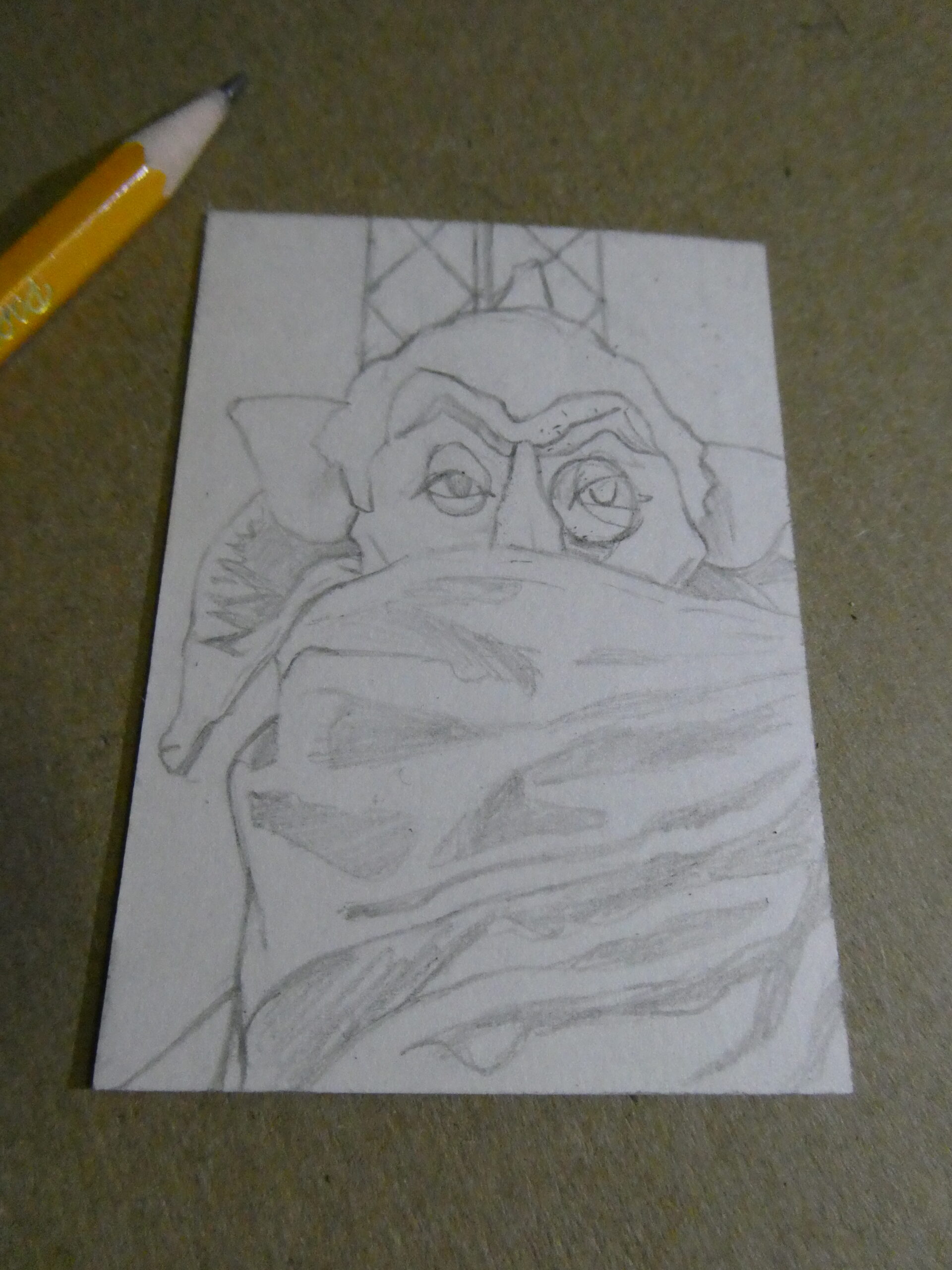 For my latest Oscar card I started off with another personal sketchcard blank and a #2 pencil. I love sketching with just a basic yellow pencil. I’ve got other drawing pencils or various leads, but the #2 HB is my favorite to use.