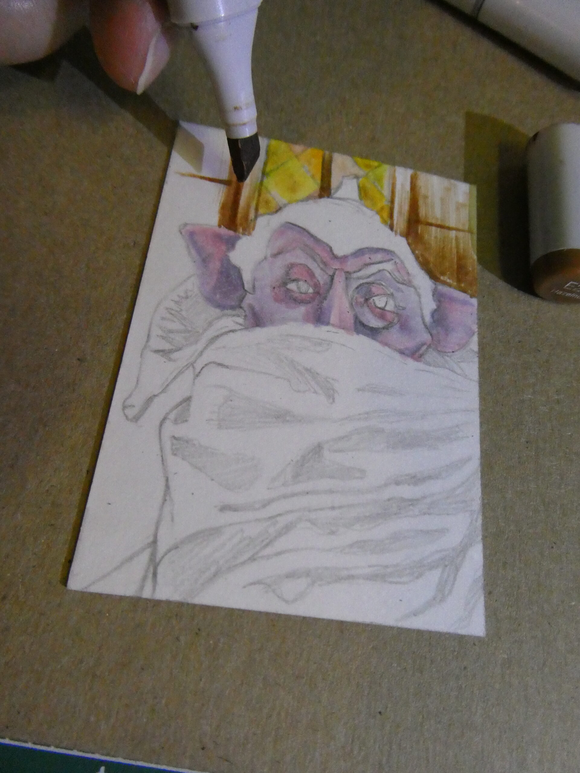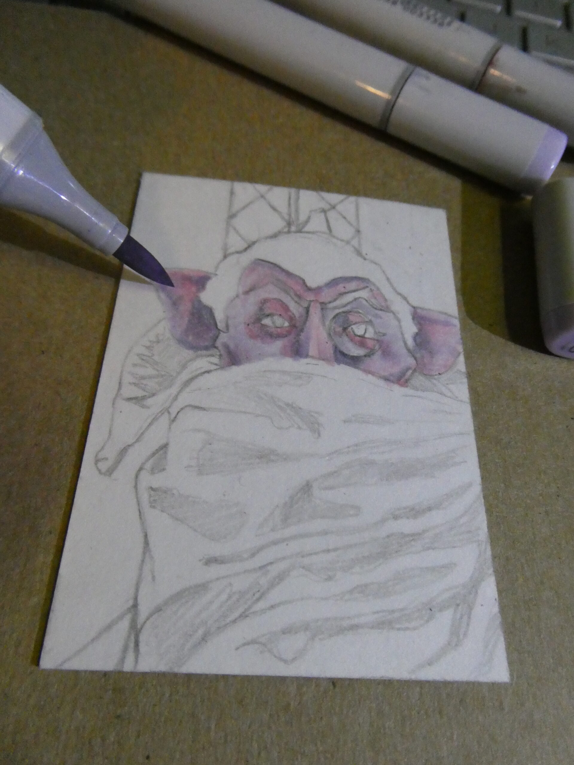 I then got out my Copic markers. I started off with some purpled for the face and cape, and some browns and yellows for the background.