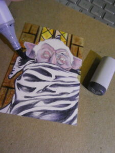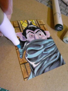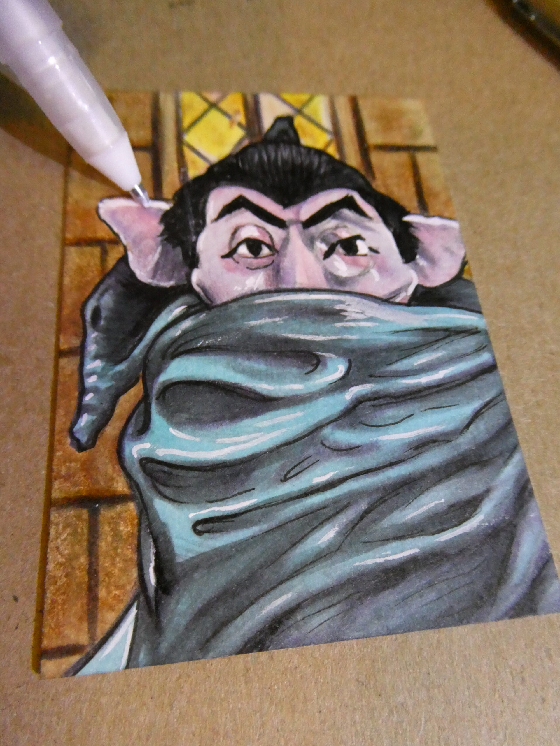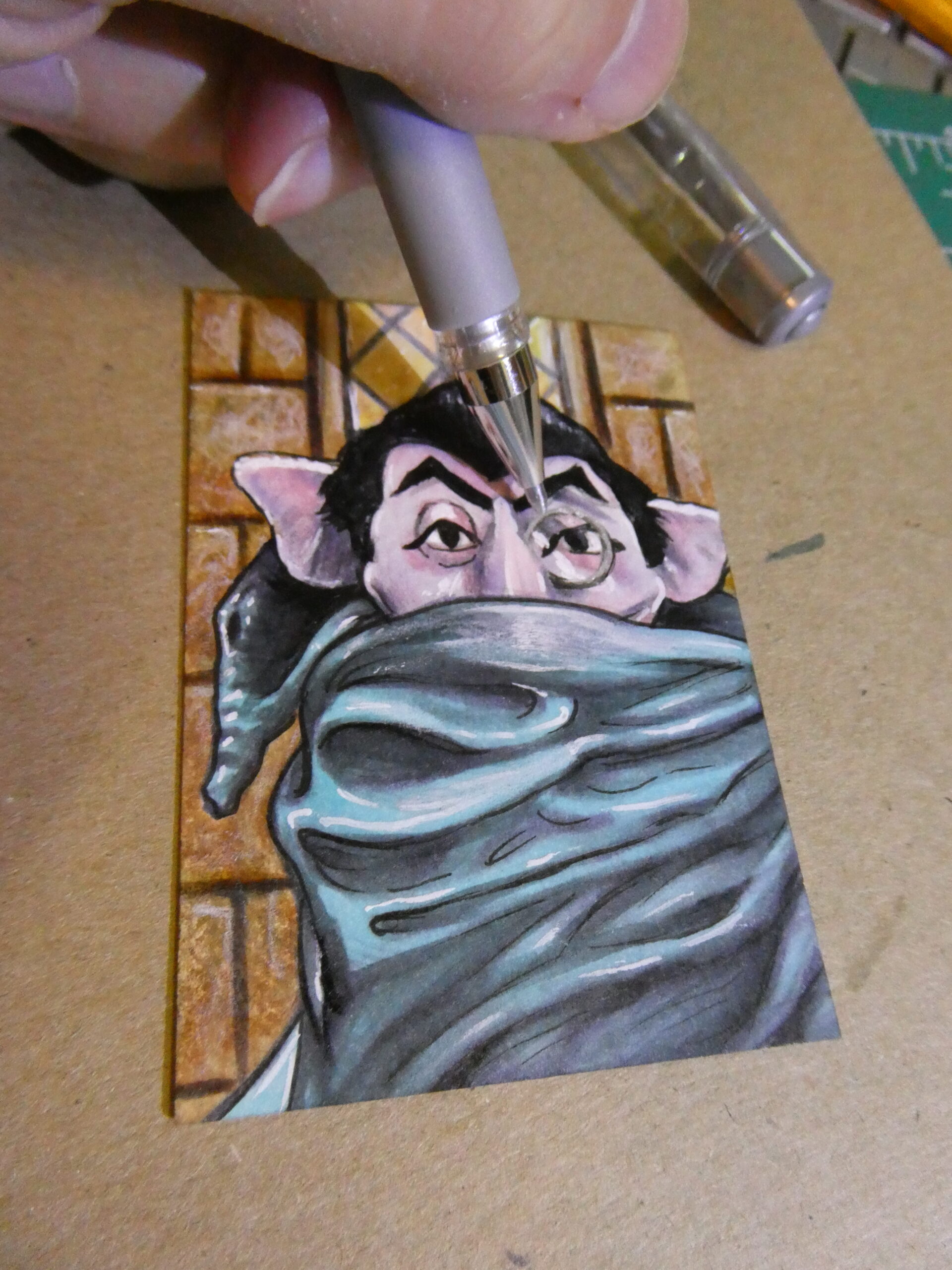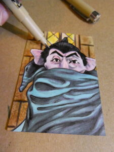 I used a white Gelly Roll pen and Prismacolor colored pencil for the highlights, and used a silver uni-ball Signo gel pen for the Count’s monocle, which gave it a bit of a special effect when the light hits it.