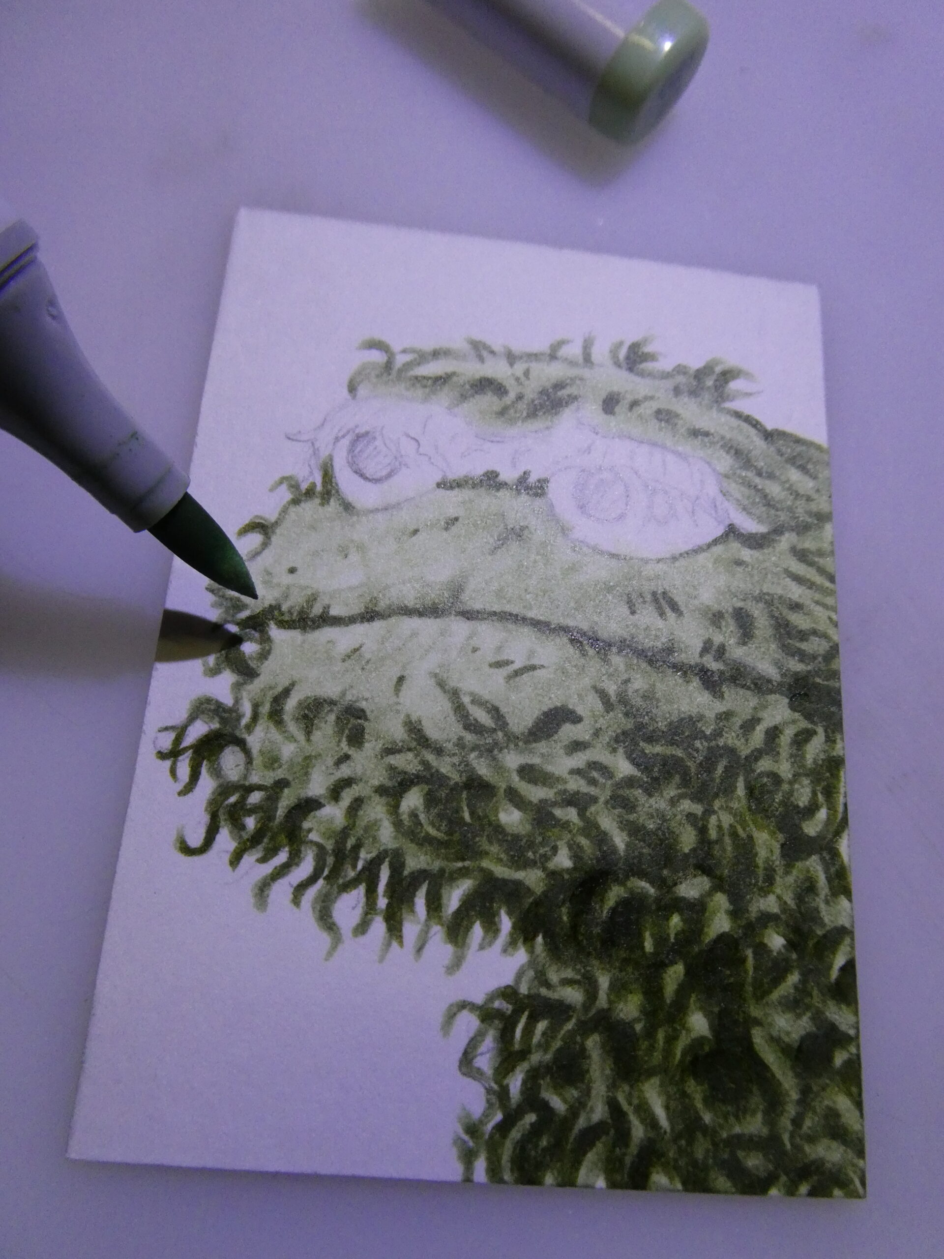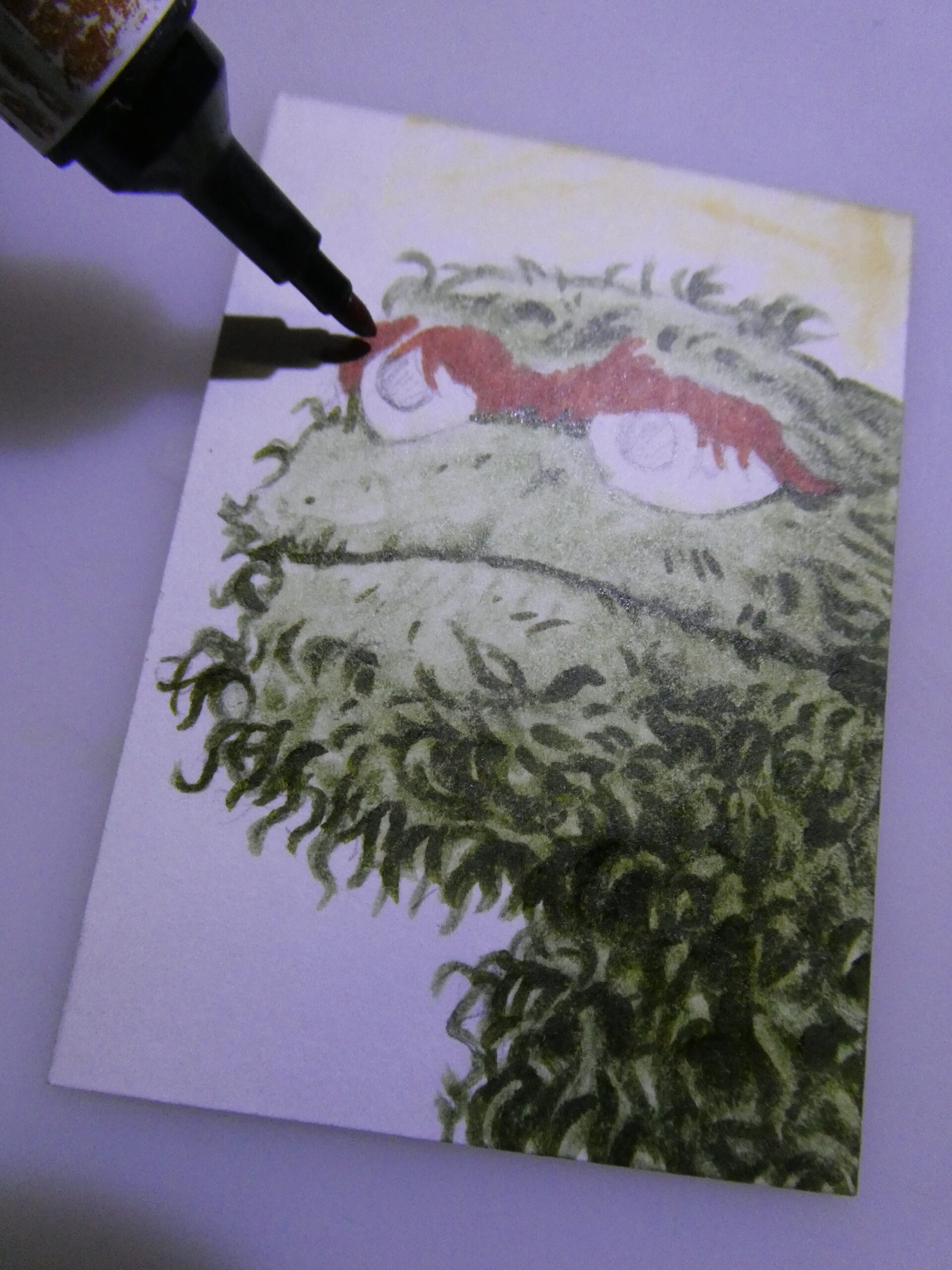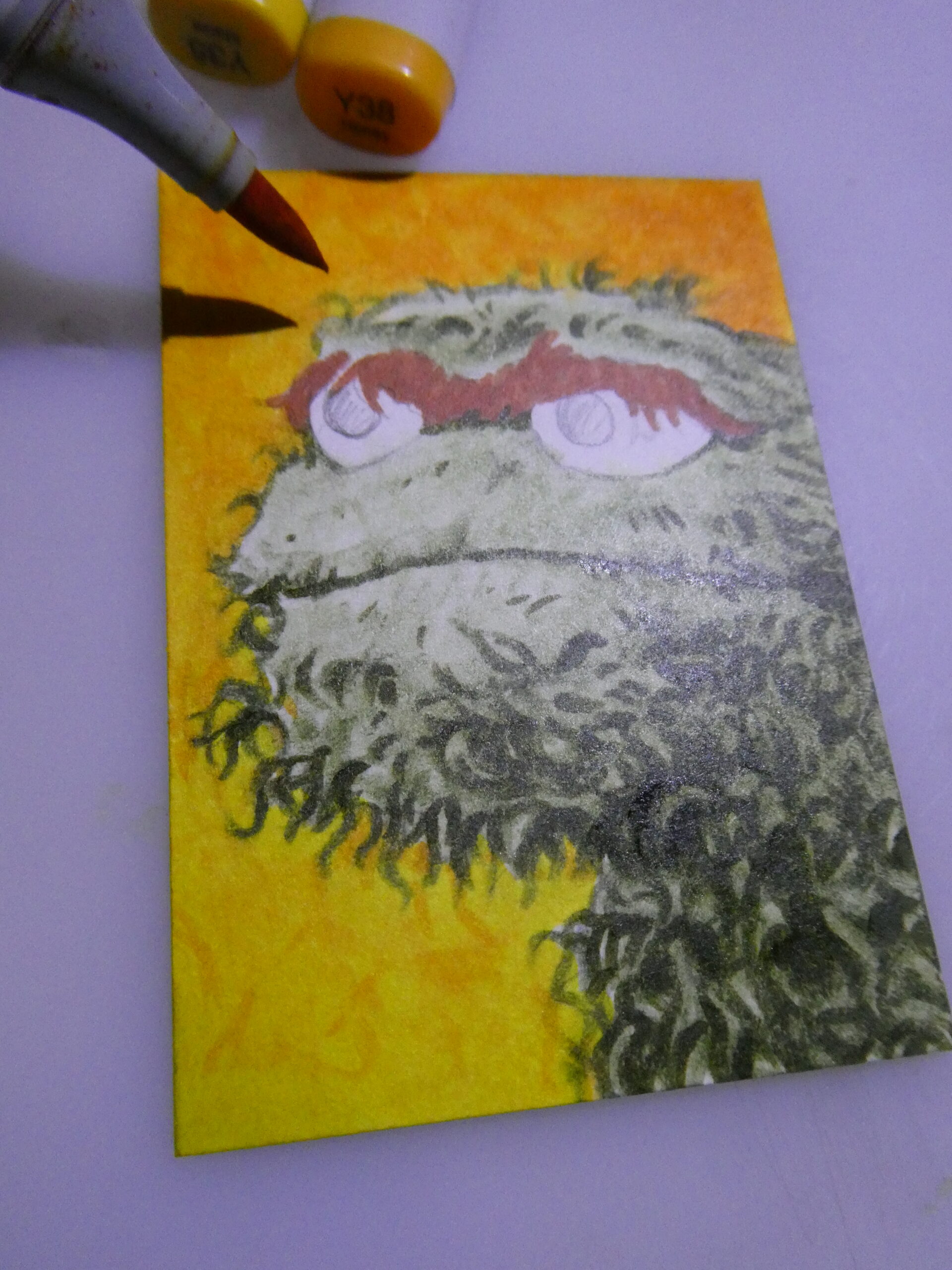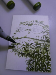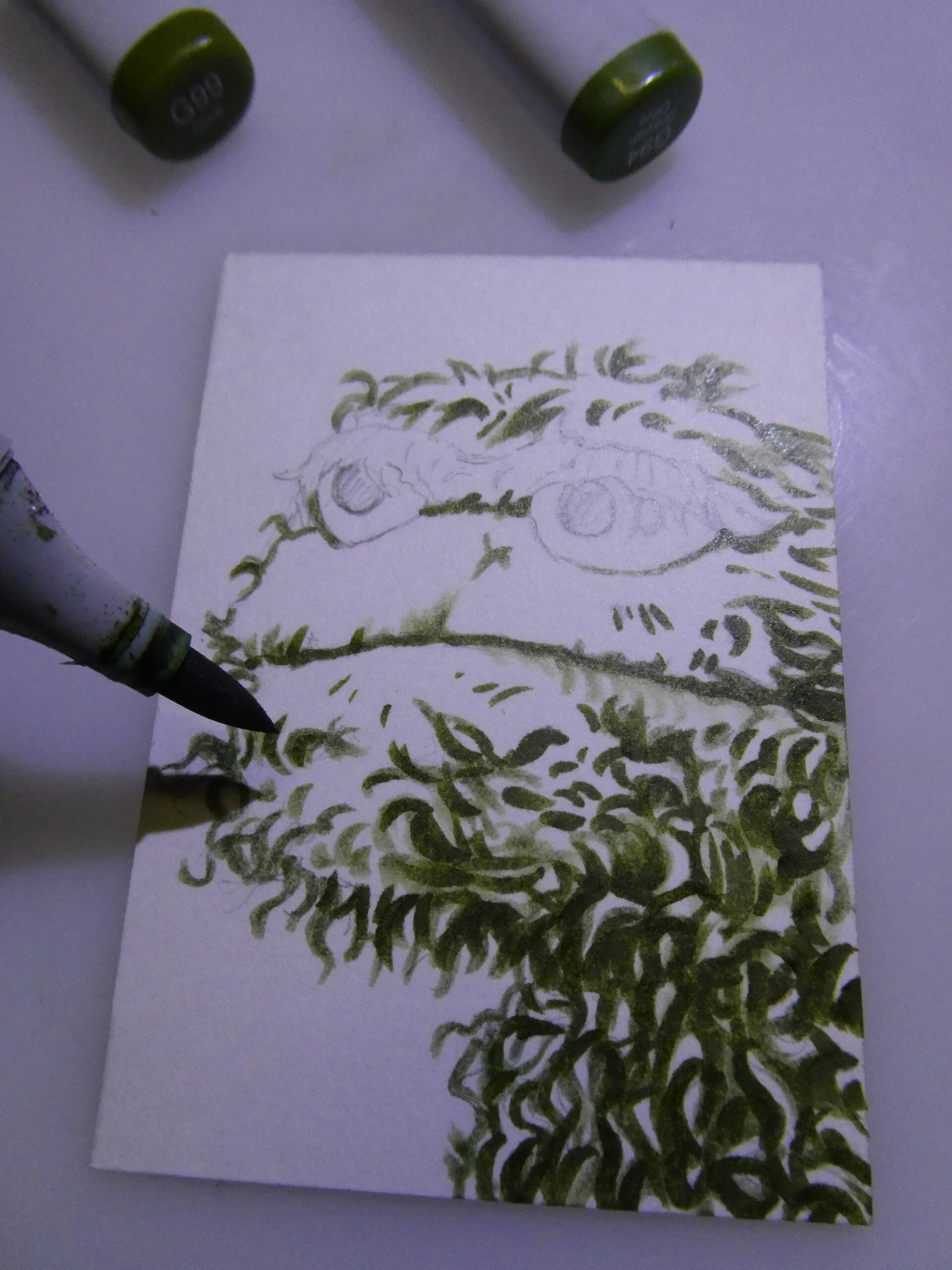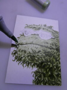 After I had Oscar sketched out, I used various green Copic markers to start coloring his mossy complection.