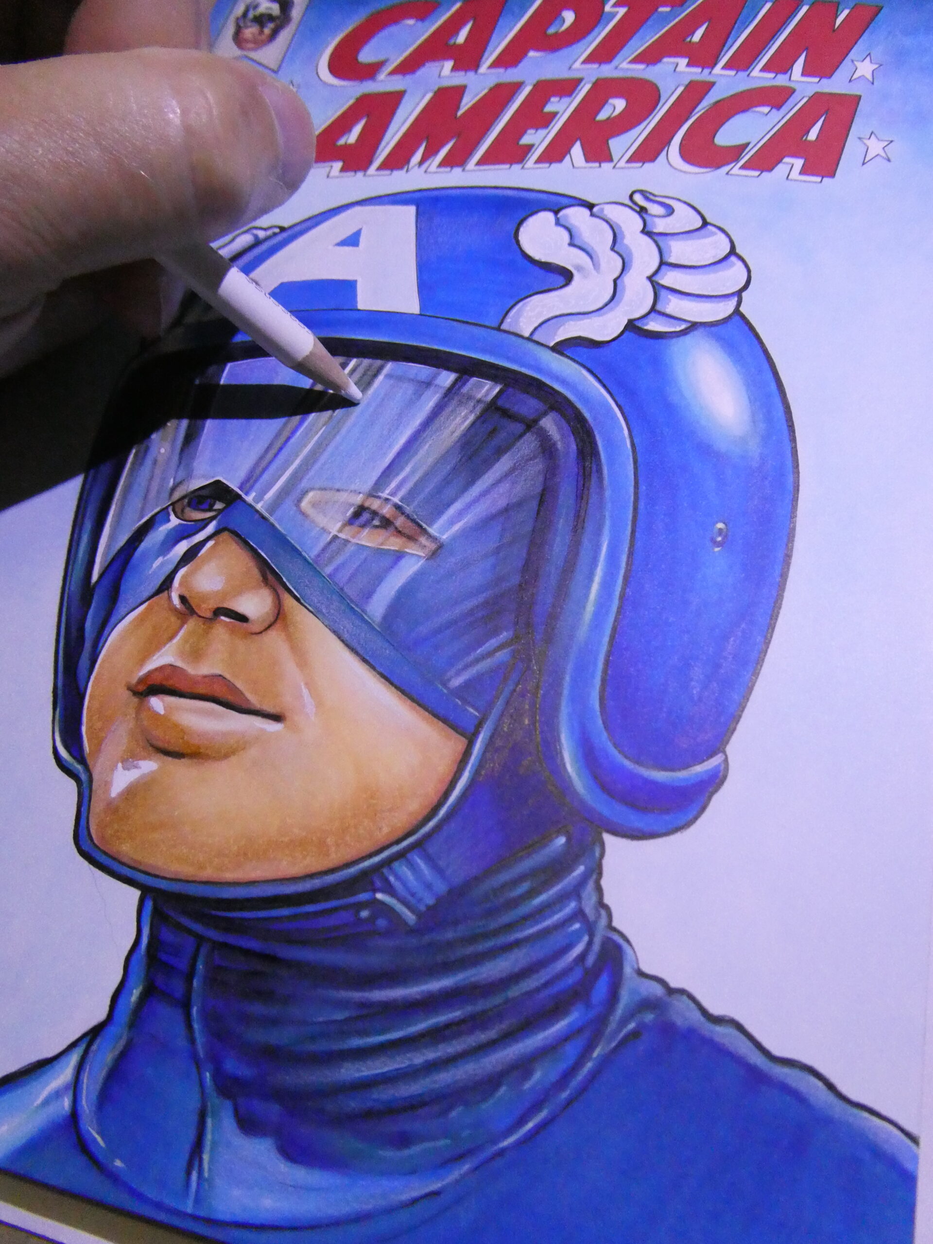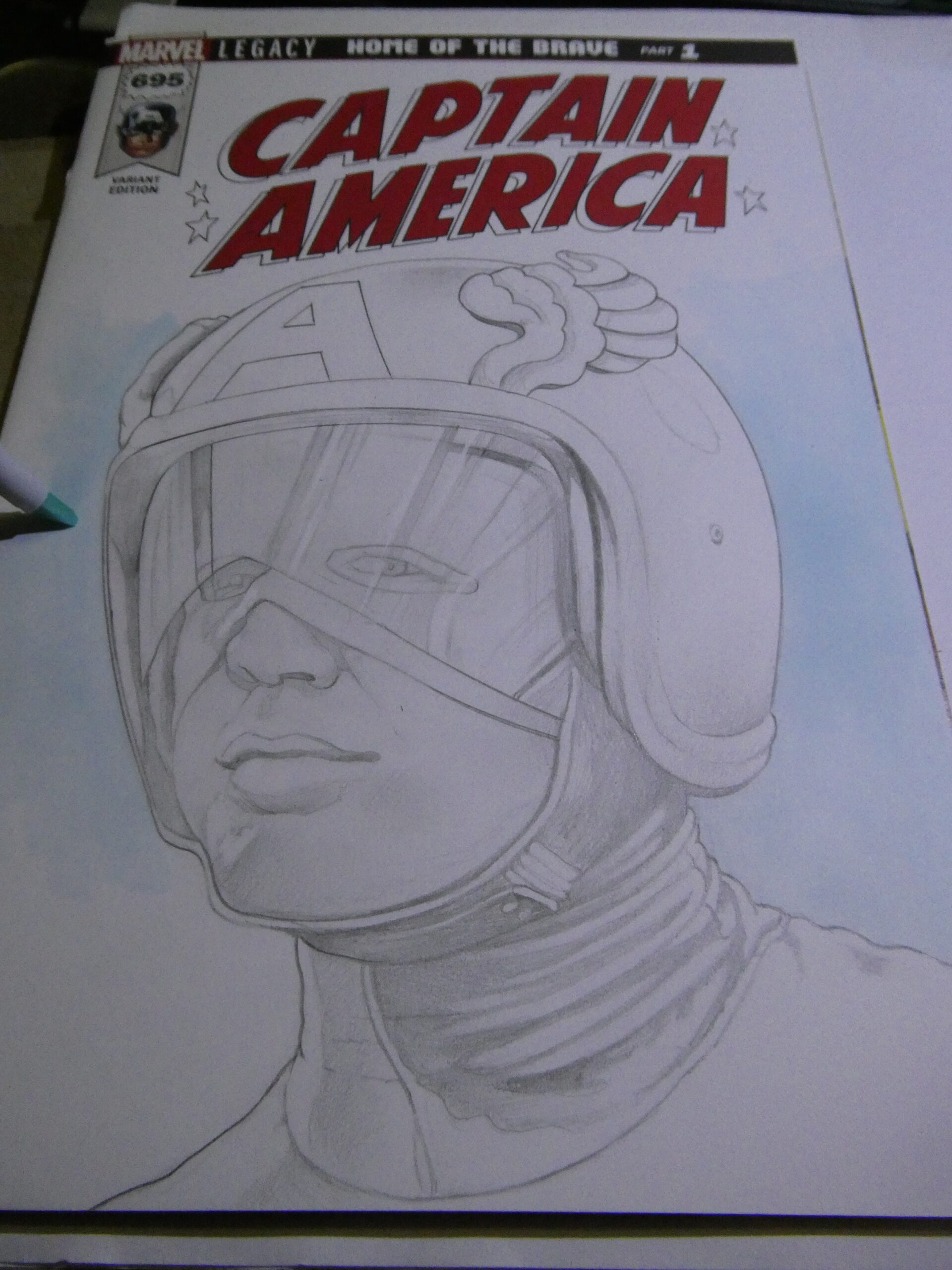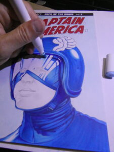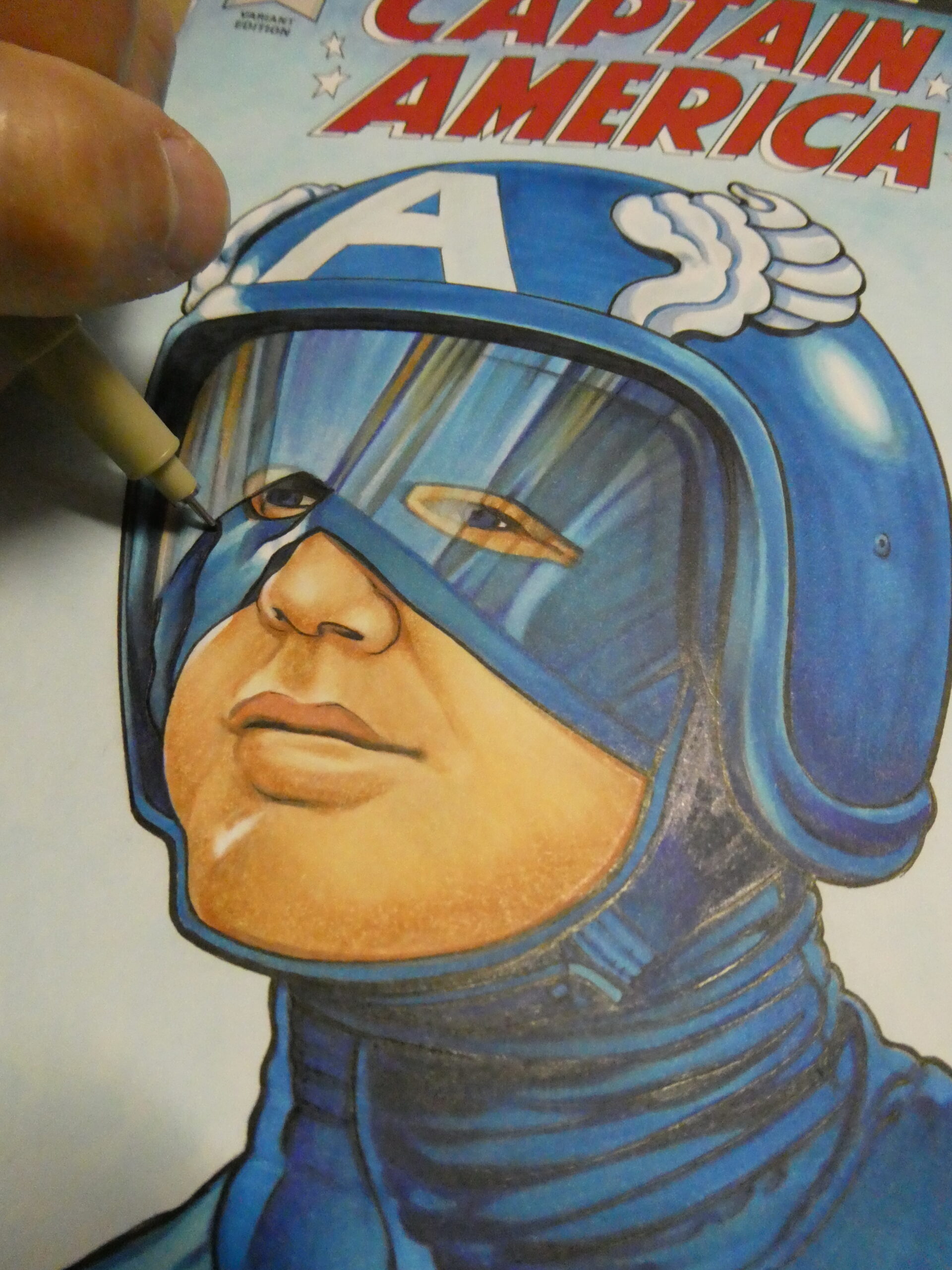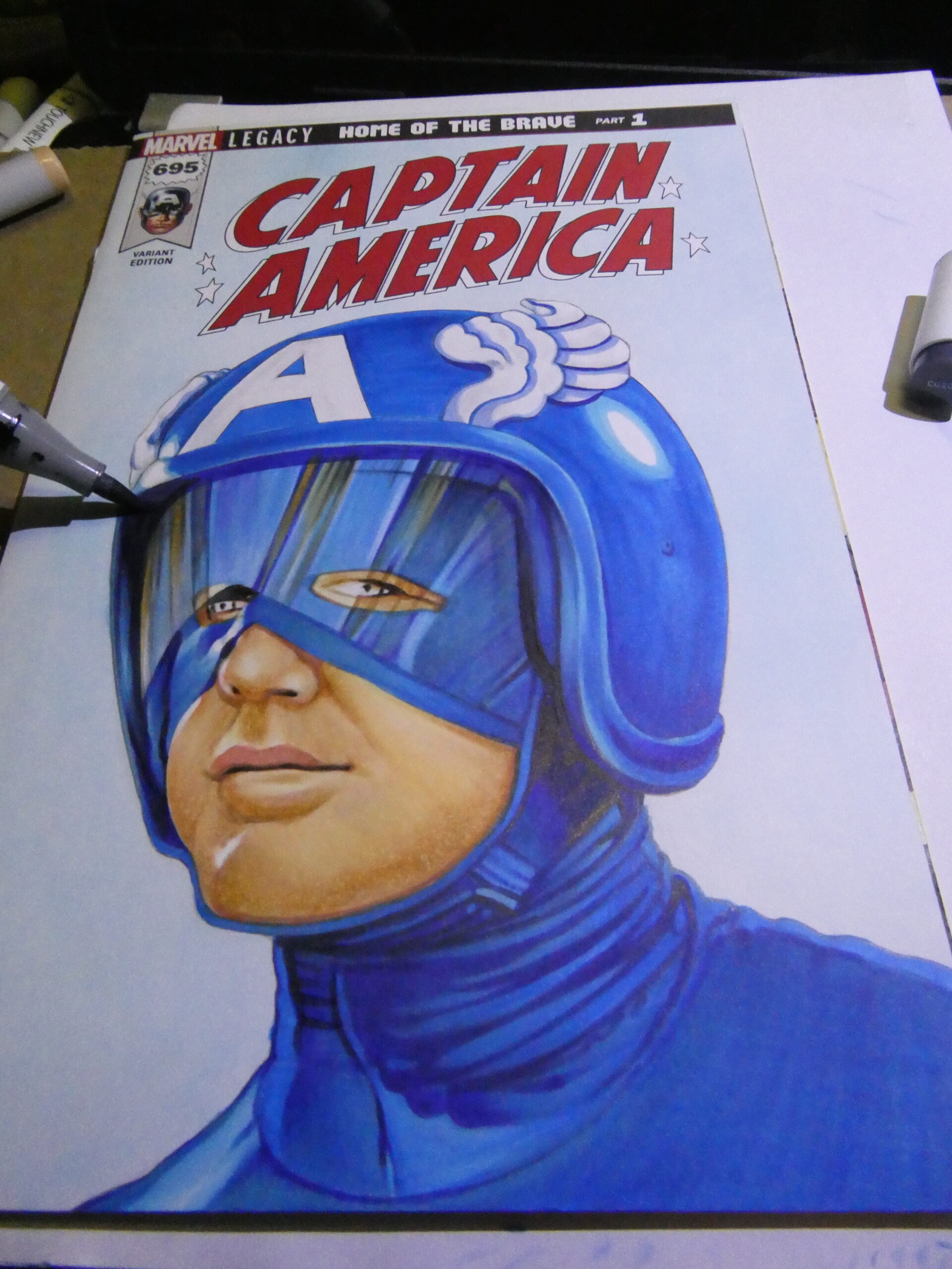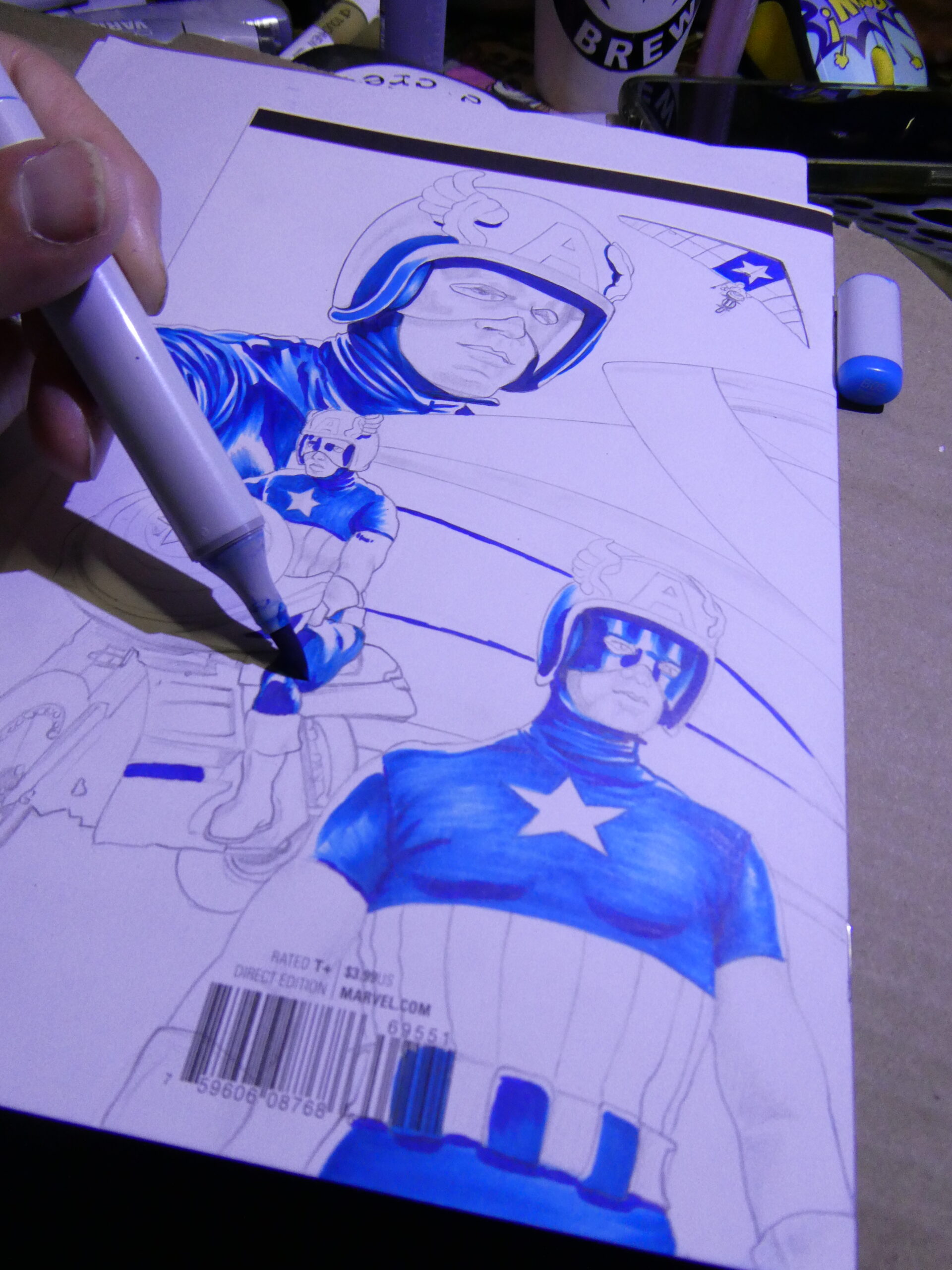 I started off in pencil on a blank variant Marvel Comics “Captain America” #695 sketchcover. I sized the image in Photoshop, printed it out, traced the basics of the face/helmet using an LED lightsheet, and then drew in the details freehand. I like to use either a click pencil or just a #2 yellow pencil. Once the pencil drawing was done I went in with a light blue marker to start filling in the background.