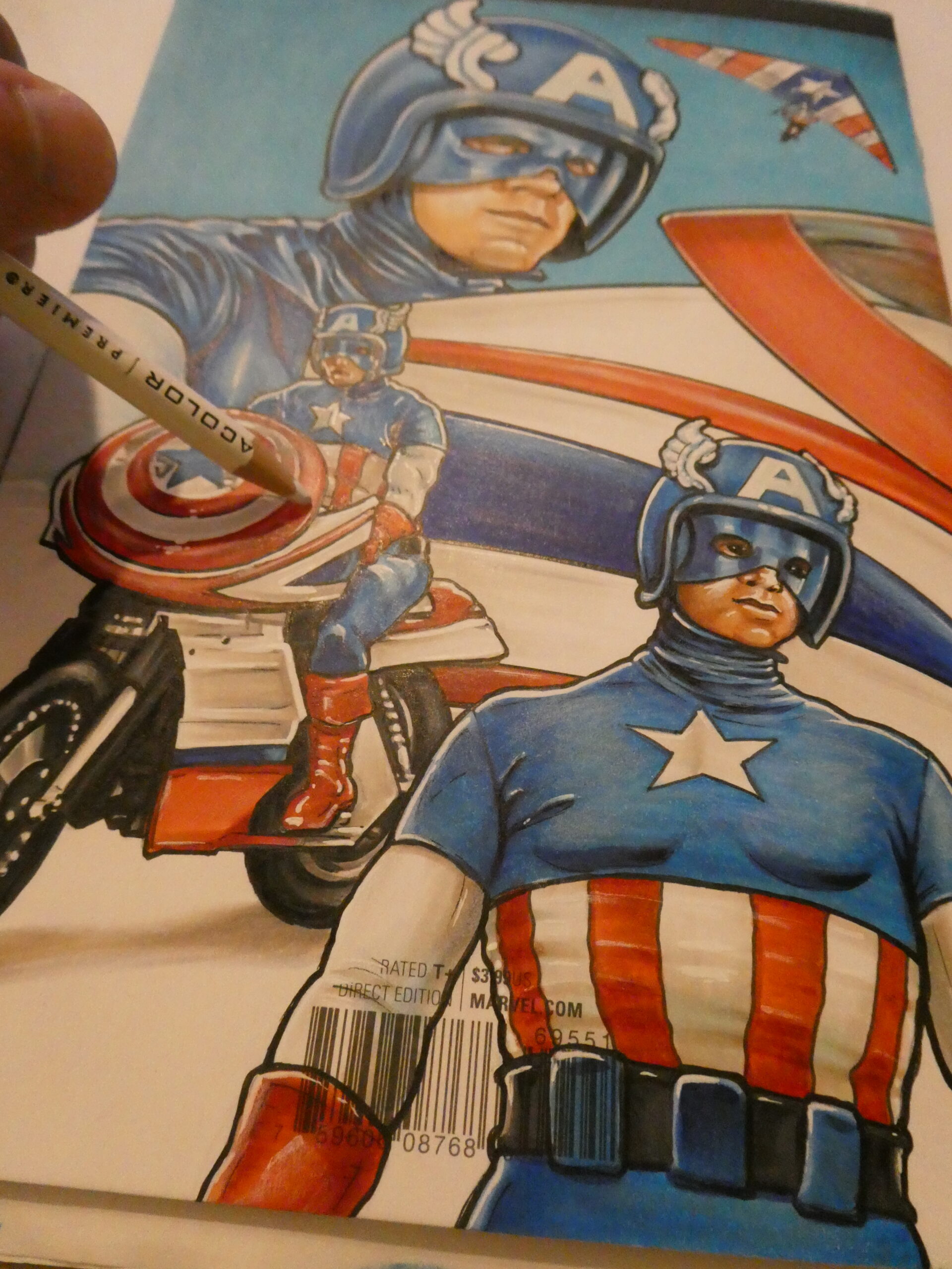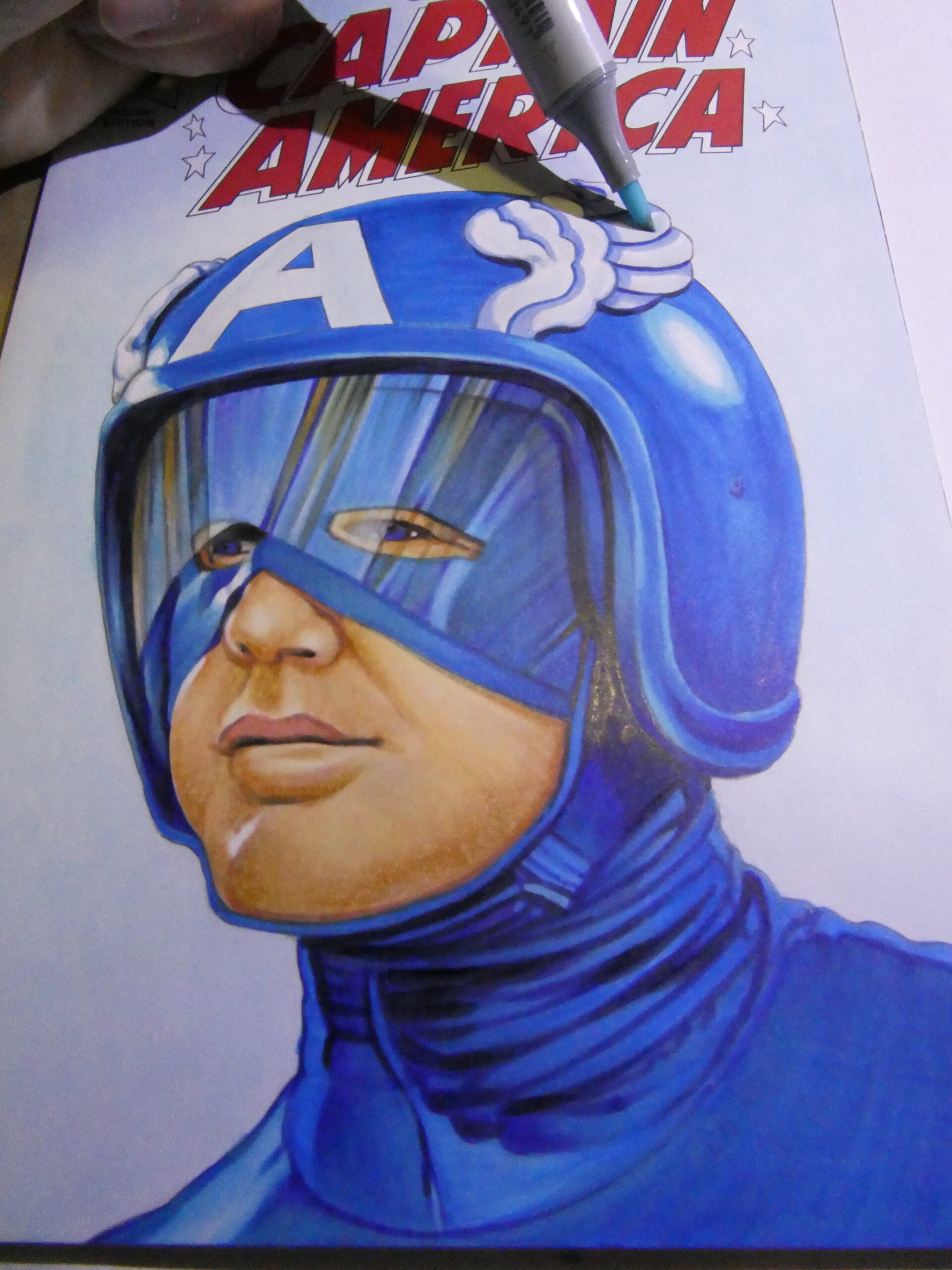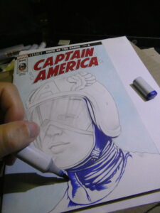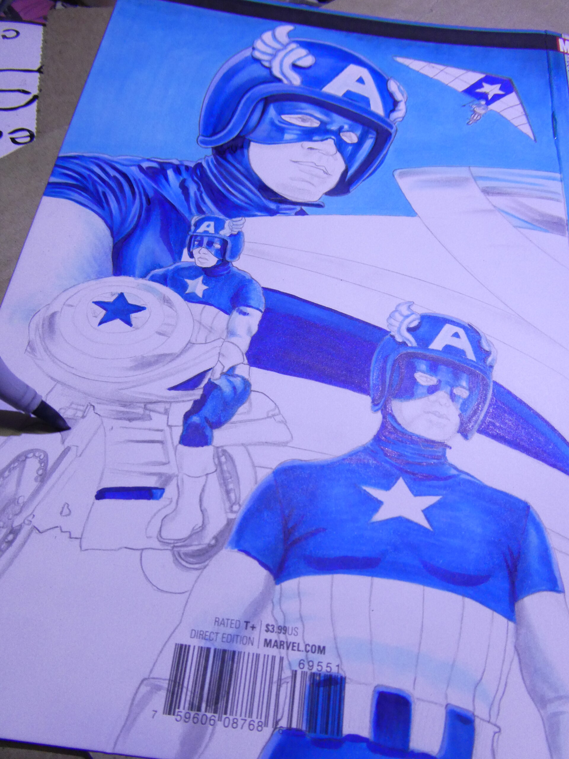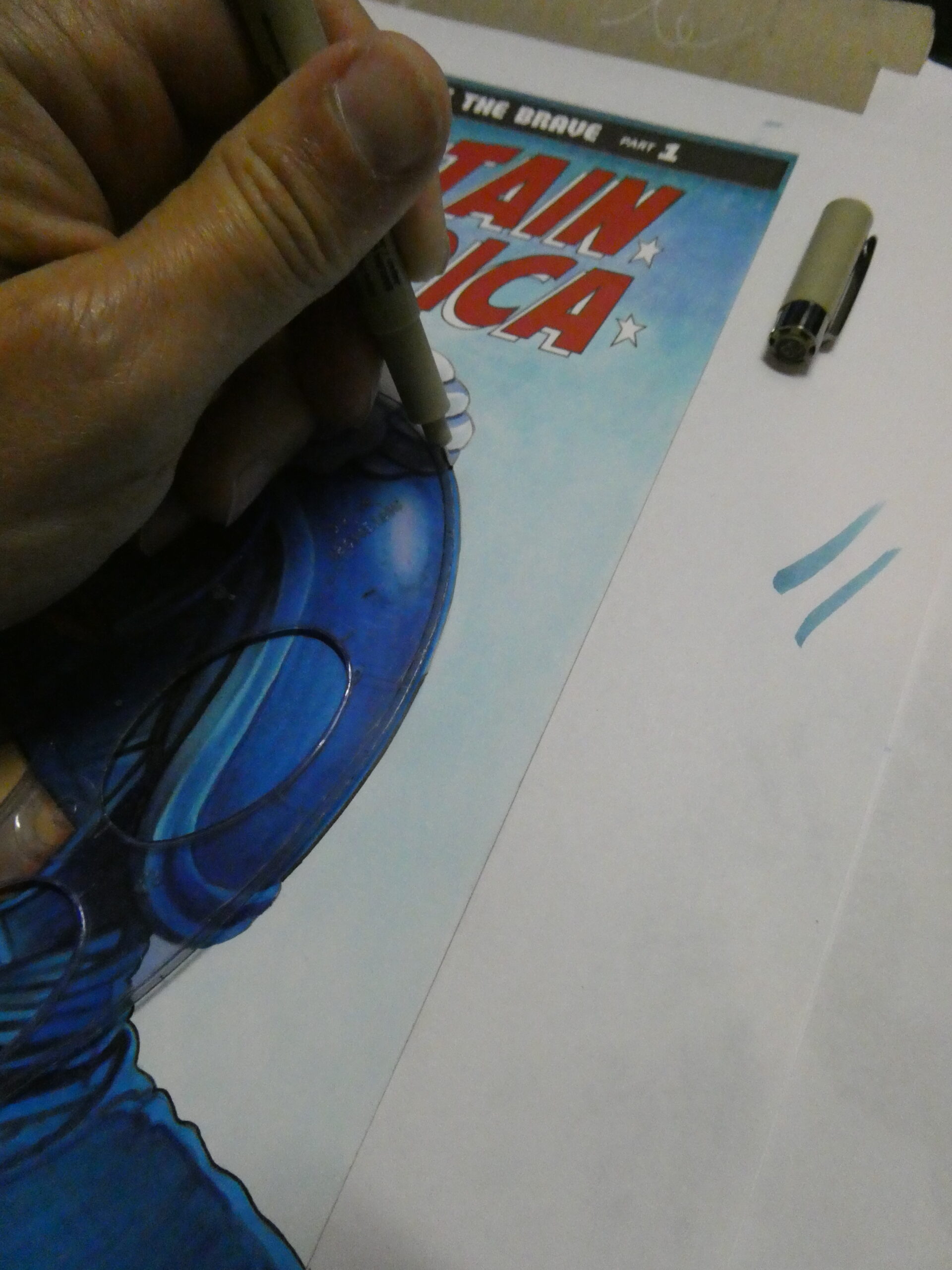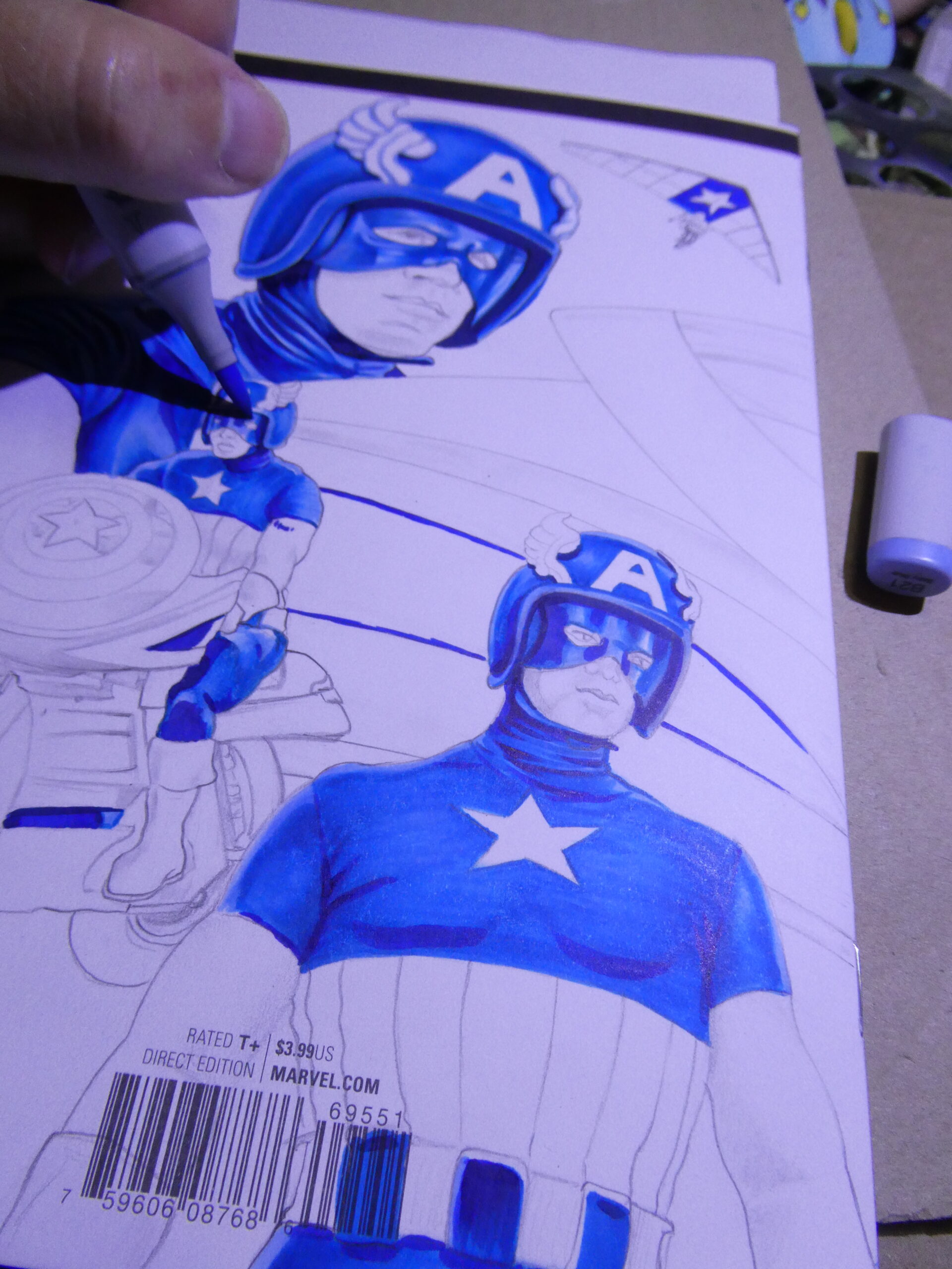 I started off in pencil on a blank variant Marvel Comics “Captain America” #695 sketchcover. I sized the image in Photoshop, printed it out, traced the basics of the face/helmet using an LED lightsheet, and then drew in the details freehand. I like to use either a click pencil or just a #2 yellow pencil. Once the pencil drawing was done I went in with a light blue marker to start filling in the background.