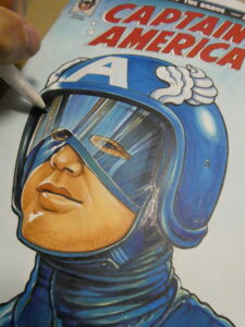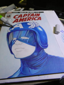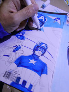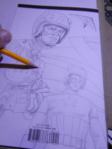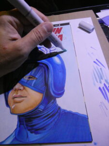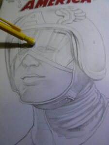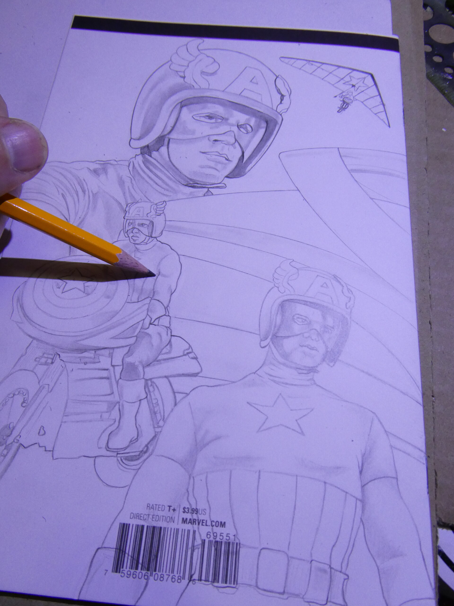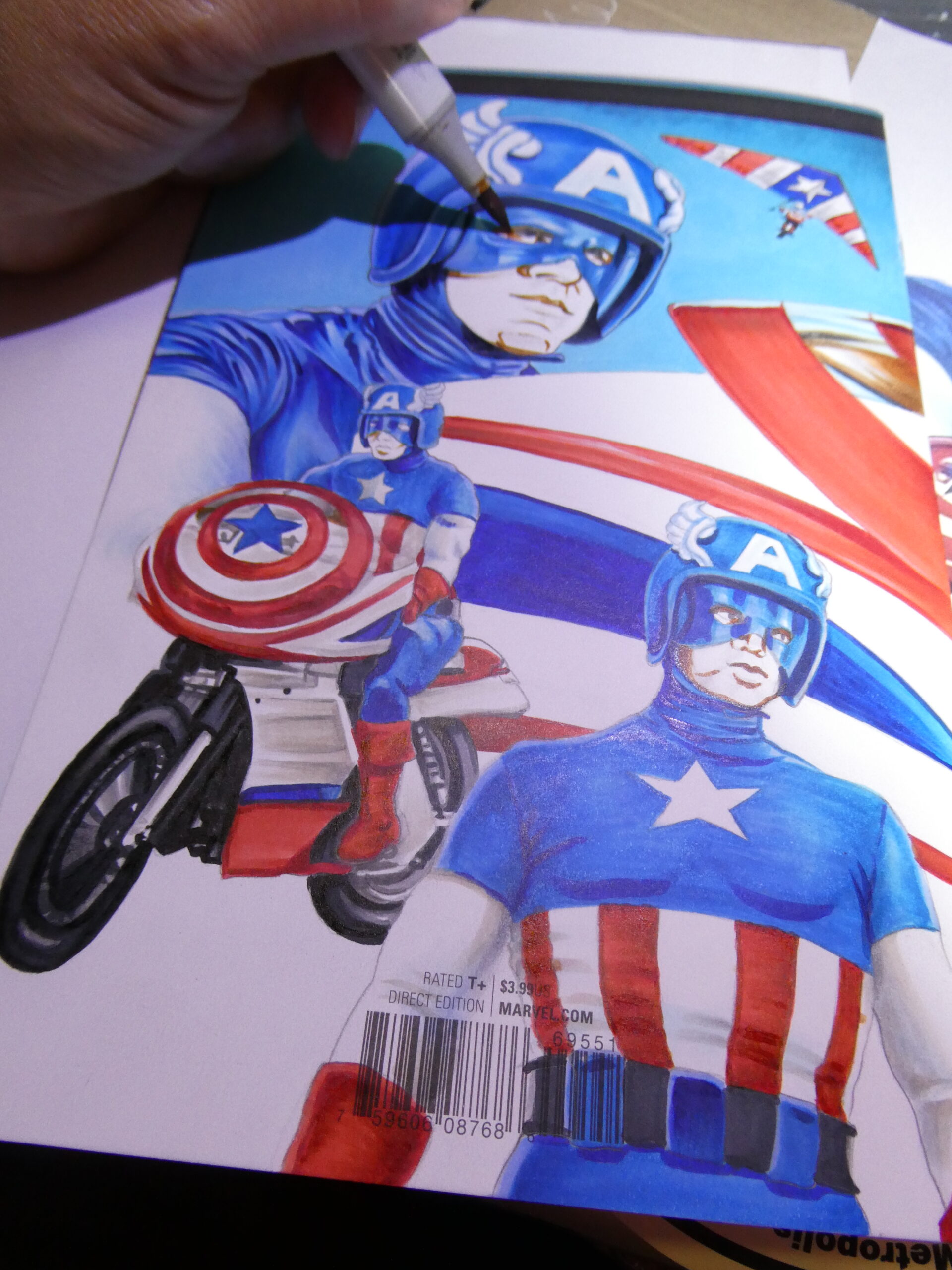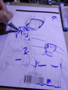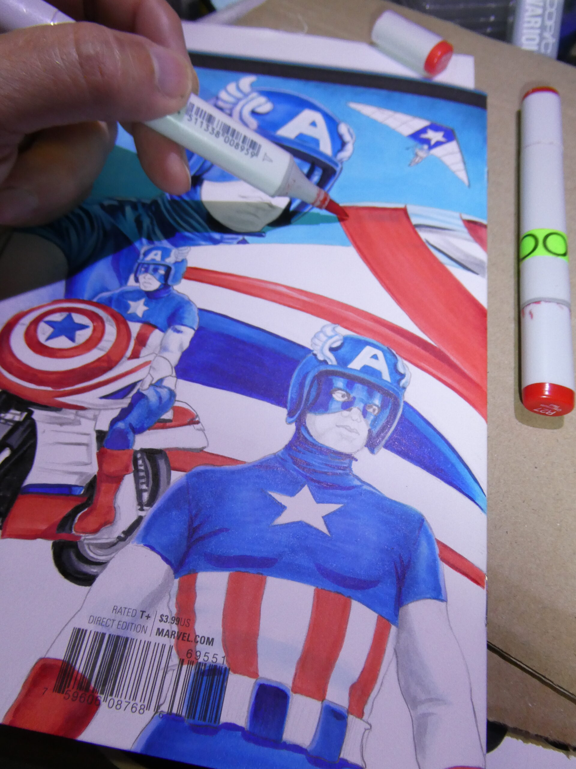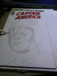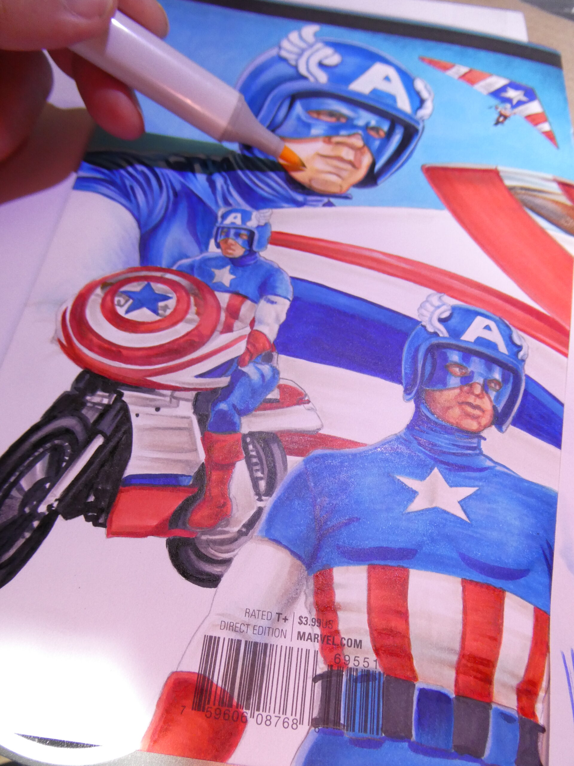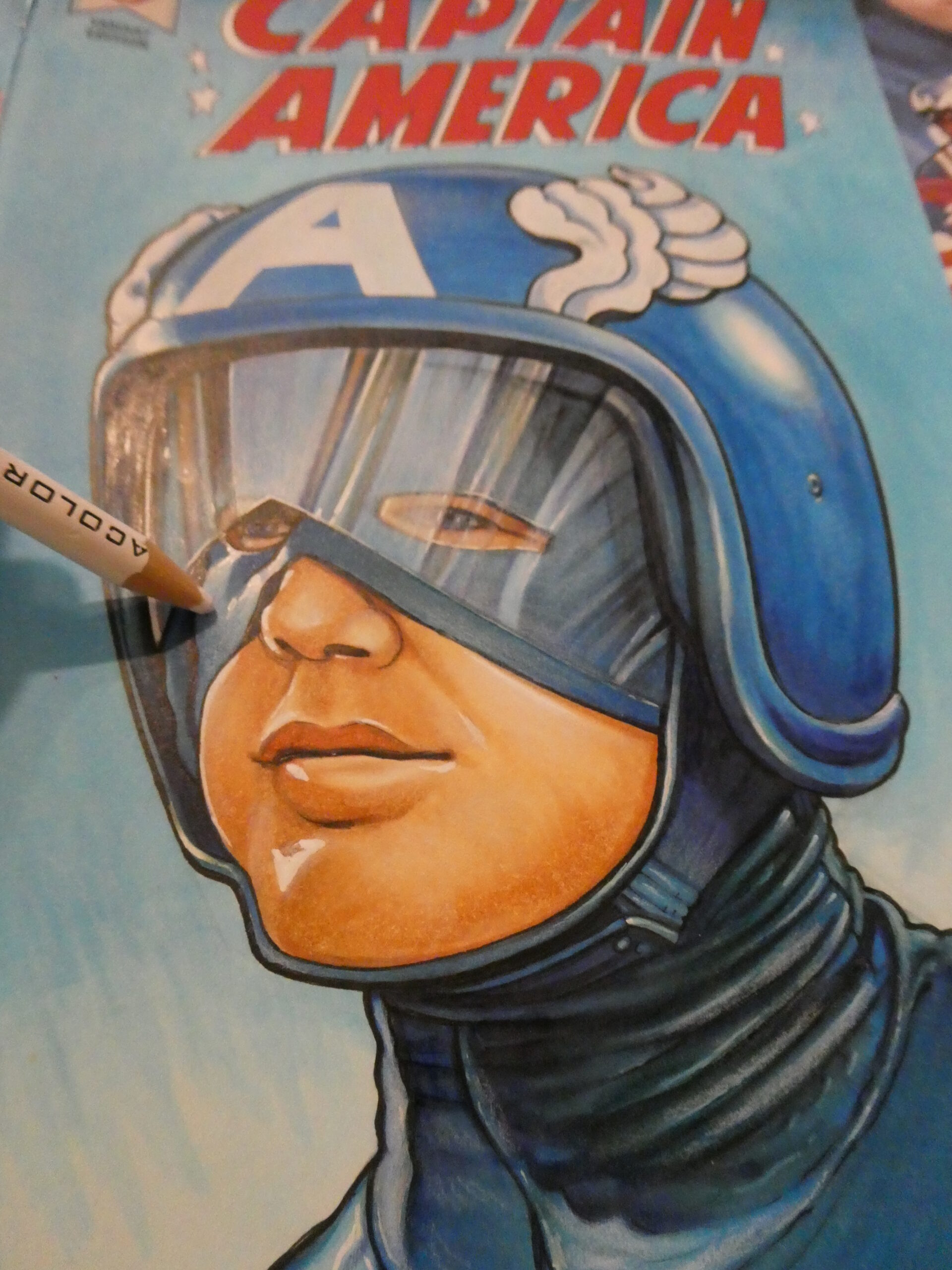 I started off in pencil on a blank variant Marvel Comics “Captain America” #695 sketchcover. I sized the image in Photoshop, printed it out, traced the basics of the face/helmet using an LED lightsheet, and then drew in the details freehand. I like to use either a click pencil or just a #2 yellow pencil. Once the pencil drawing was done I went in with a light blue marker to start filling in the background.
