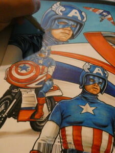 I did the same process for the back of the comic, including using Photoshop to size and arrange the images of Cap. I did change the left/center image of him on the motorcylce to his costume from the first movie to the second one. I wanted it to all be from the same TV flick.