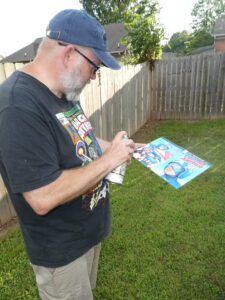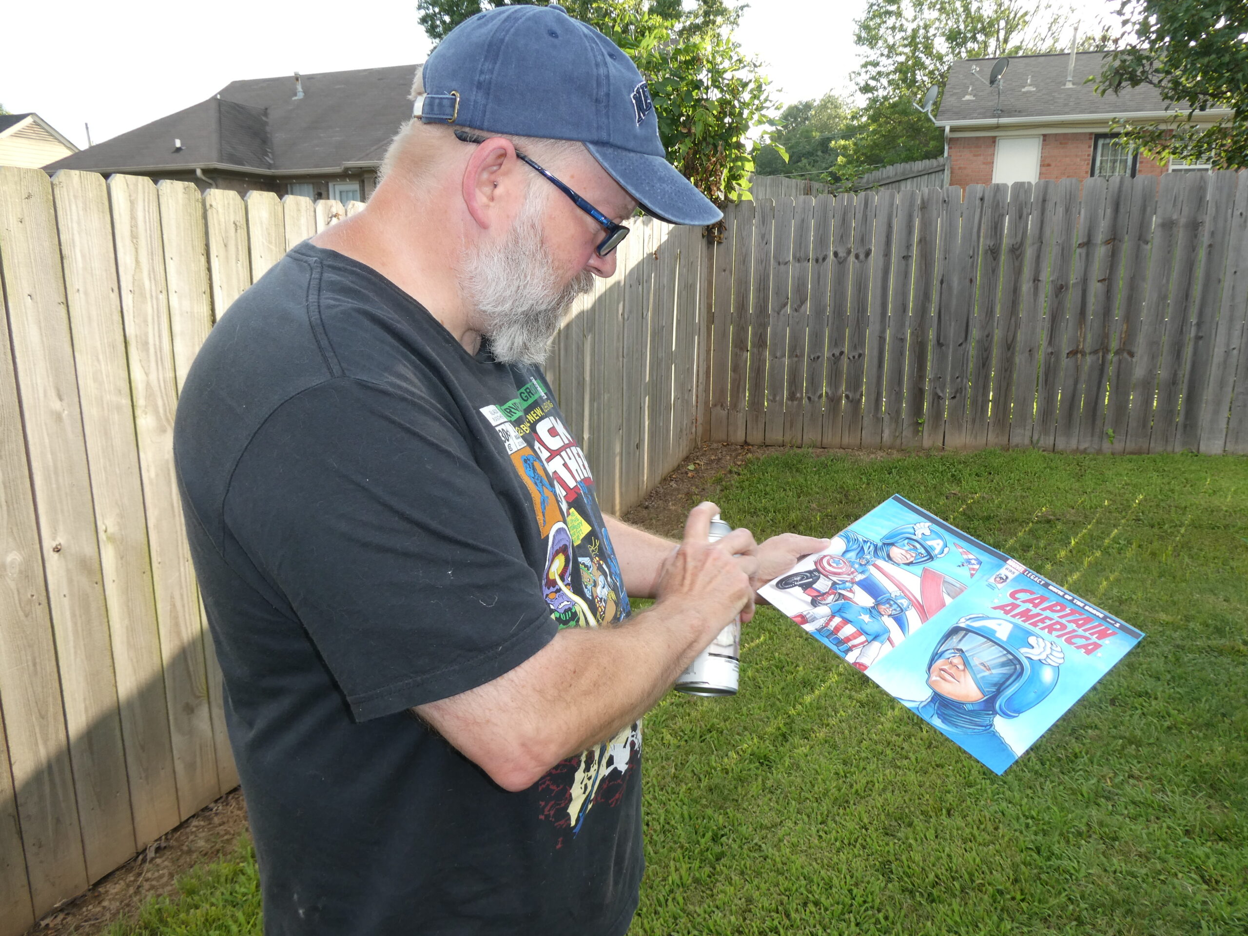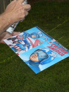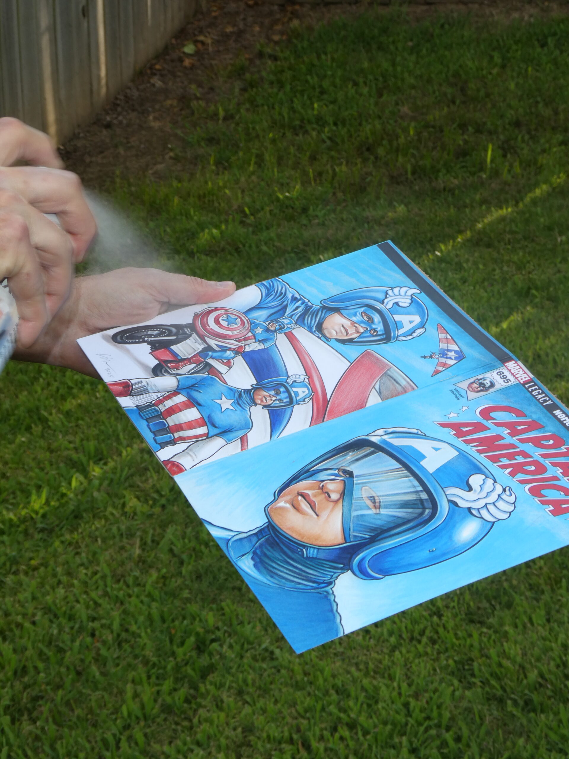 I recommend doing this outdoors, or someplace well ventilated. I usually spray back and forth about a foot away from the comic and do light overlapping passes.