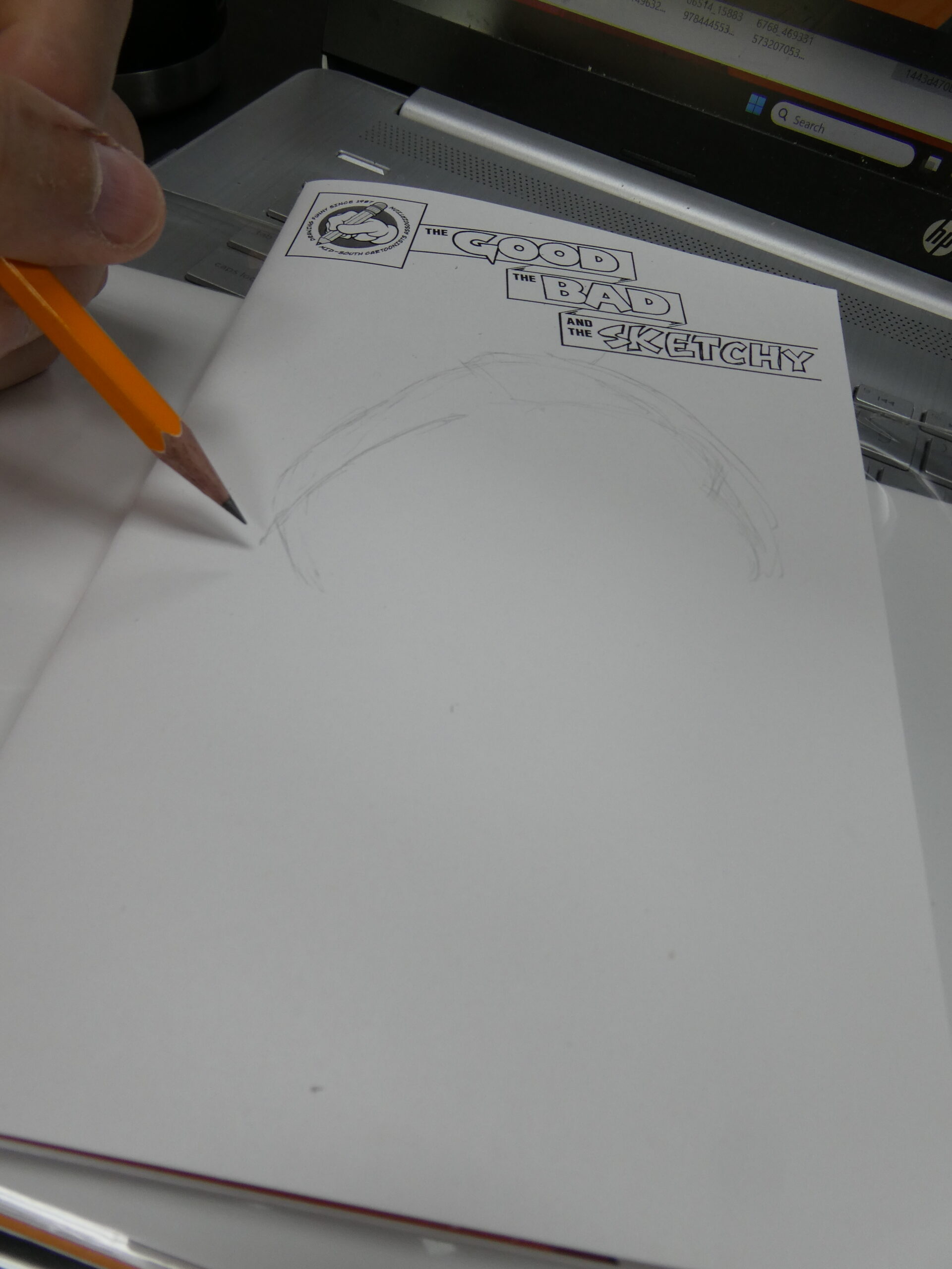 I started drawing this sketchcover with a yellow #2 pencil (“2, ah, ah, ahh..!”). Pencils havebeen my go to art tool since I was a kid watching Sesame Street, and they’re incredibly inexpensive! If I was going to do a pencil illustration I’d break out some of my nicer drawing pencils, but for this type of drawing a #2 does the job just fine for me. Occasionally I’ll use a cheap “click” mechanical pencil if that’s what’s handy.