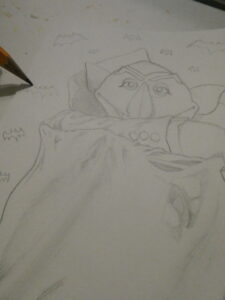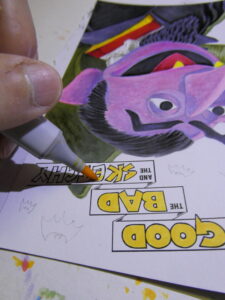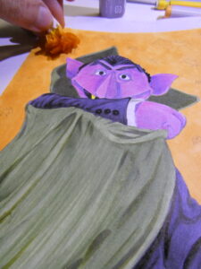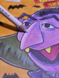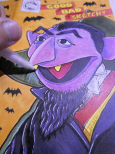 I then started to color in the masthead logo with red and yellow markers. I wanted it to stand out a bit, but not be glaring and take away the focus on the Count’s face.
