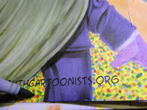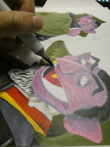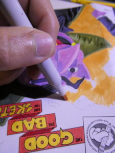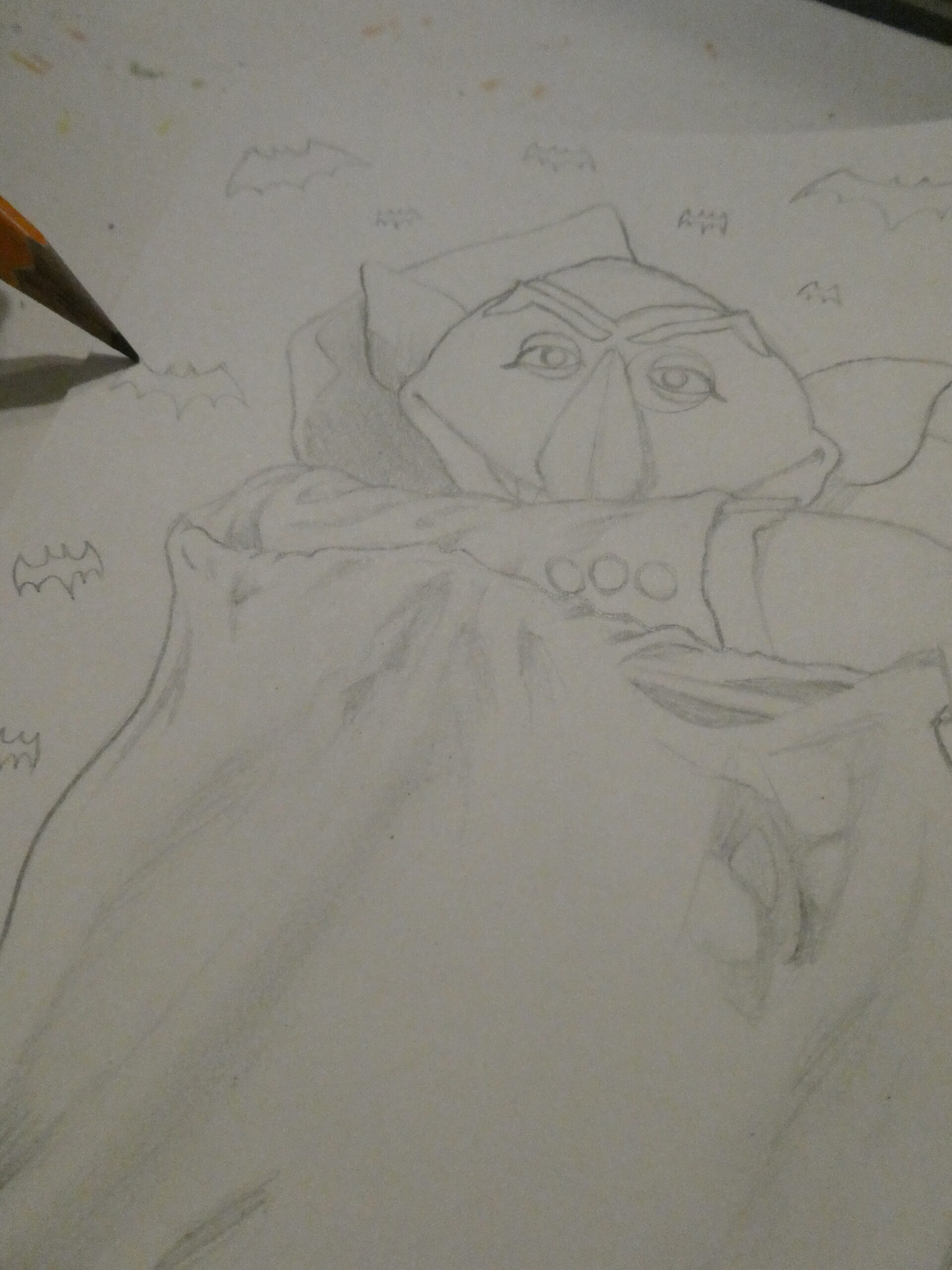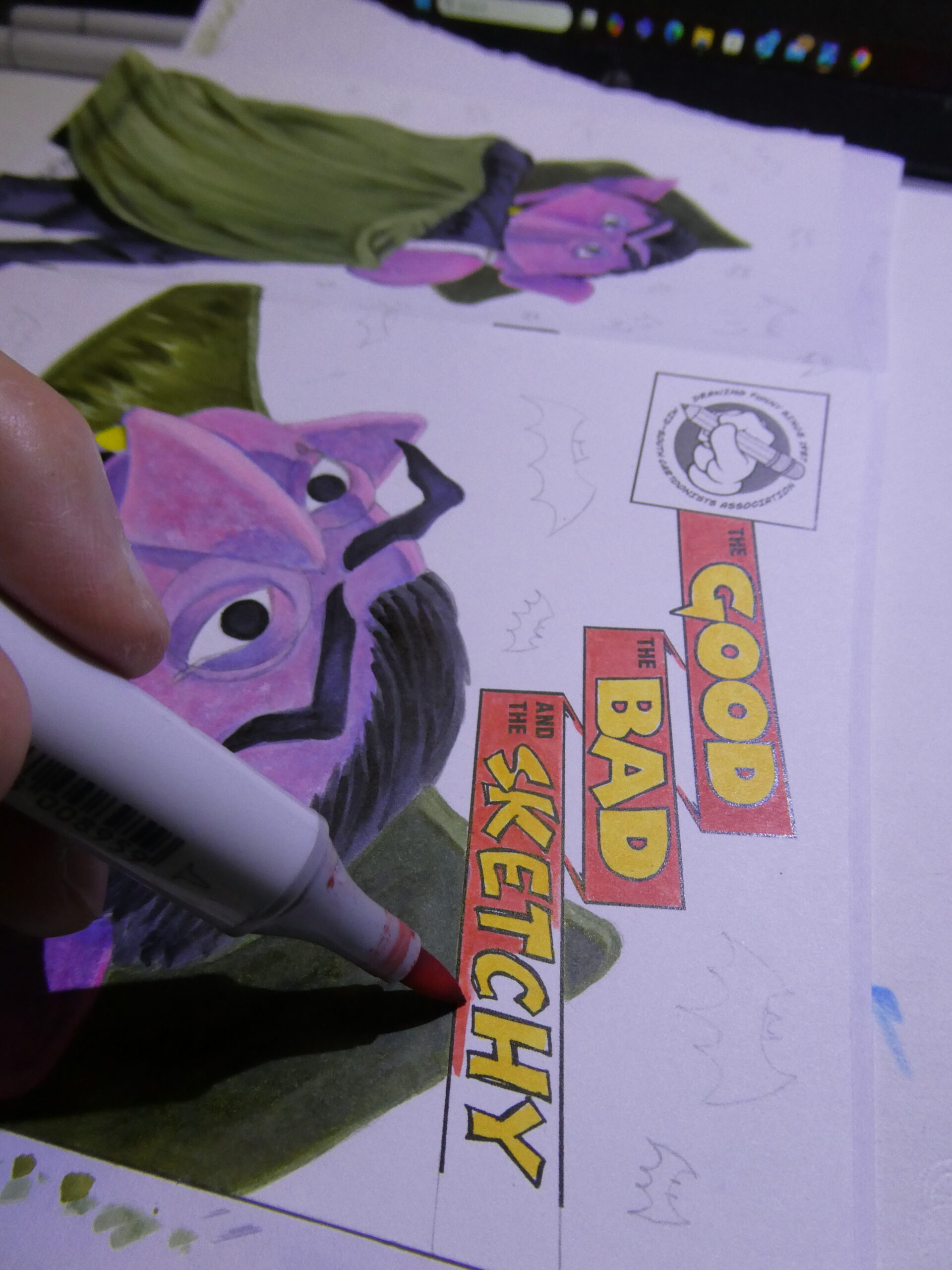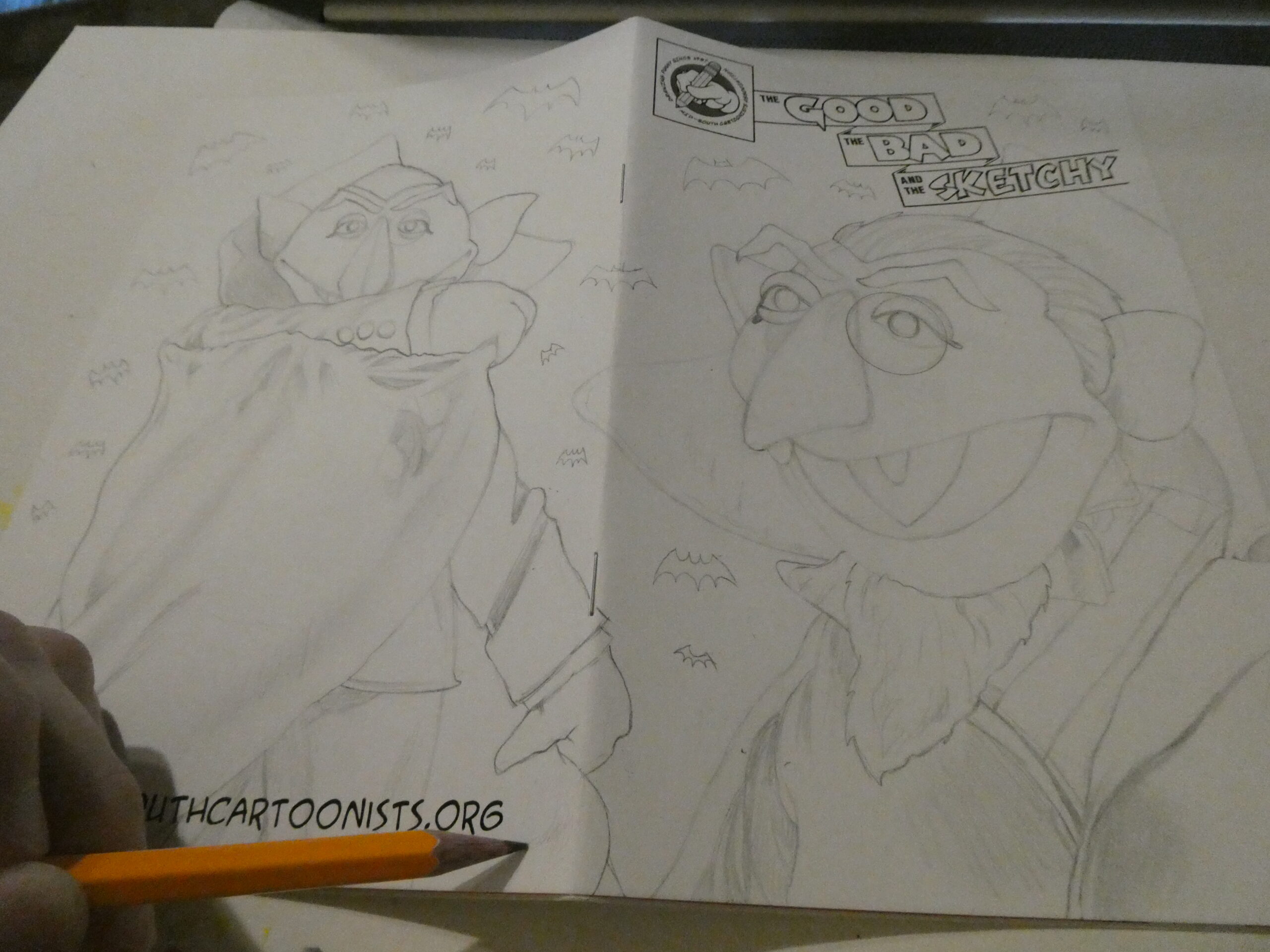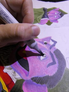 Then it was time to ink the black lines with a Pigma Micron pen. I did his outlines and all the background bats with an 03 sized pen nib. For the Muppets, I tend to go a bit thicker on my lines than if I was drawing a human. I’m not a big fan of my inking, and it’s probably the part of drawing I like the least.