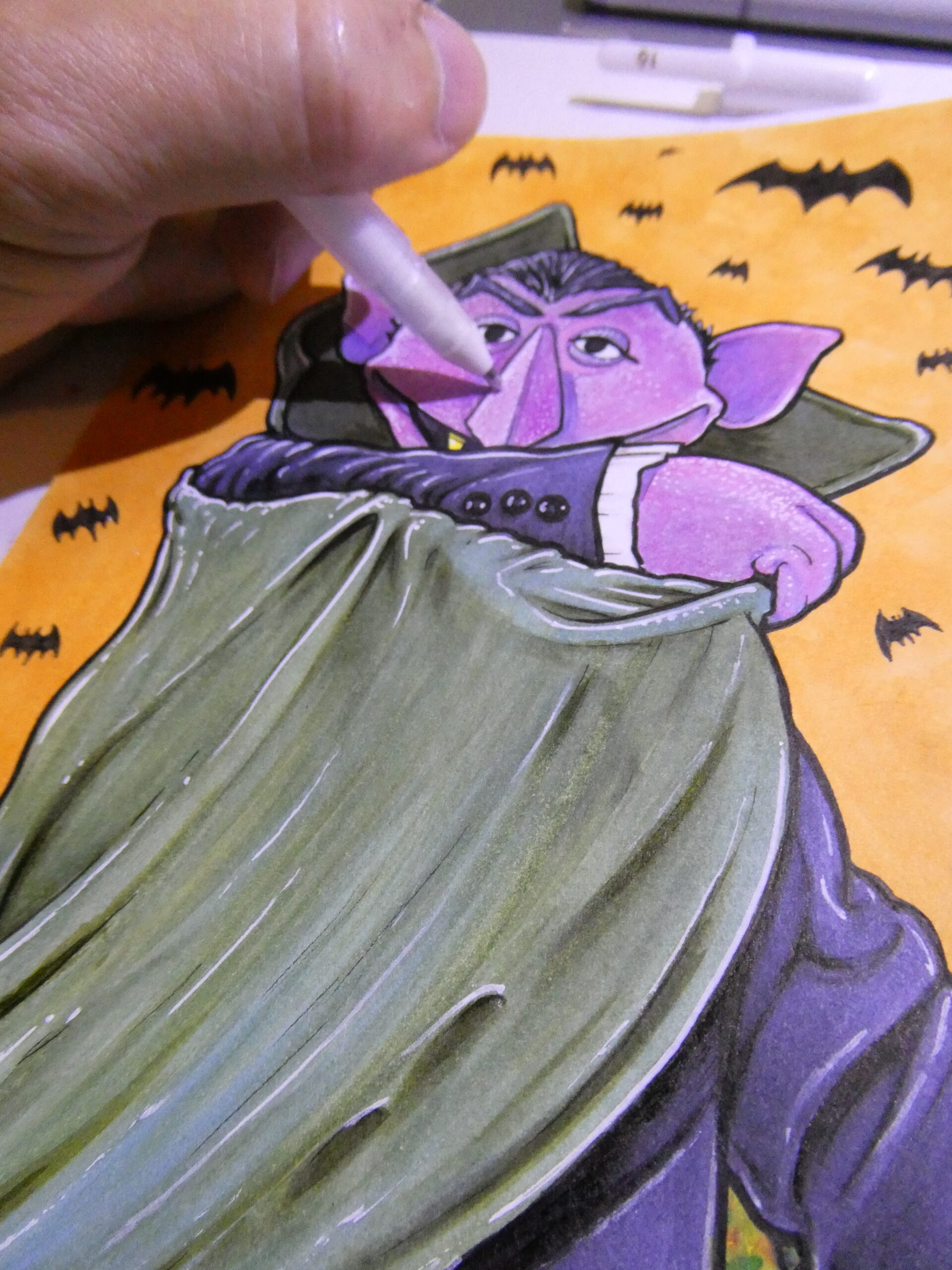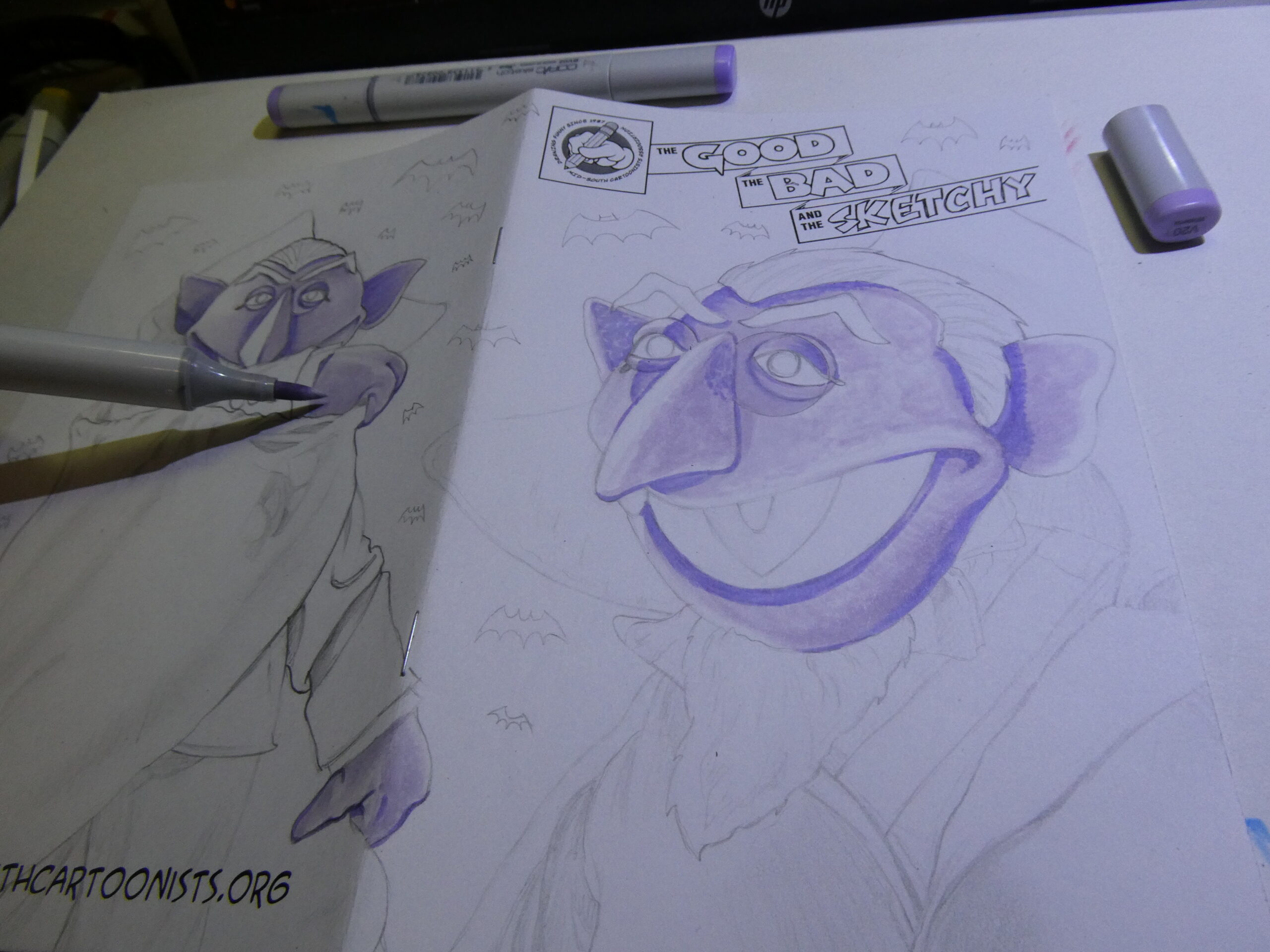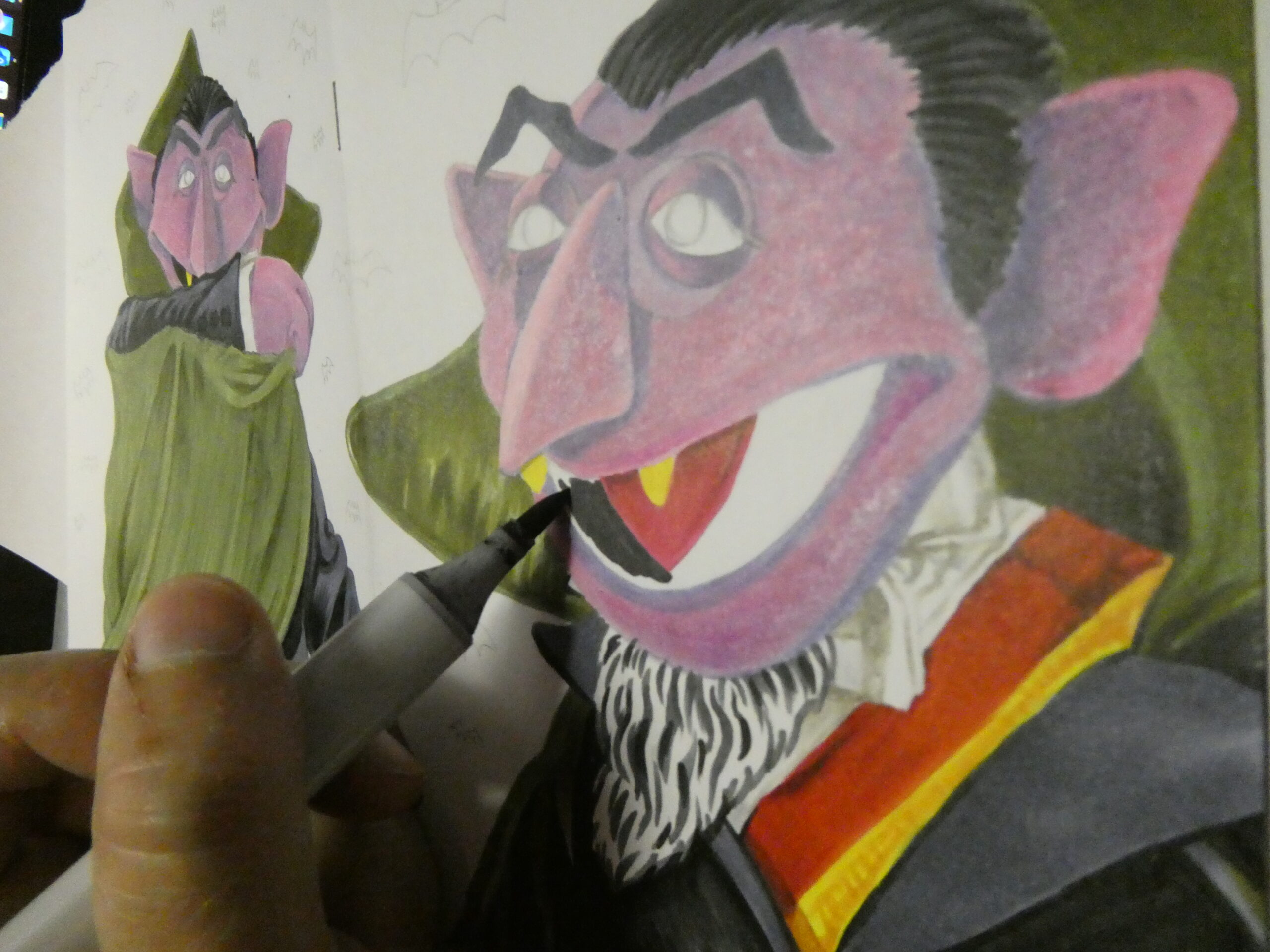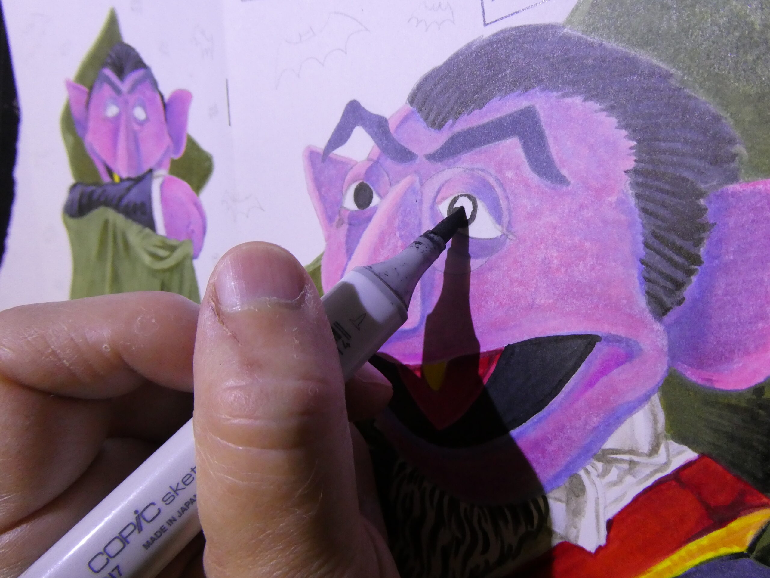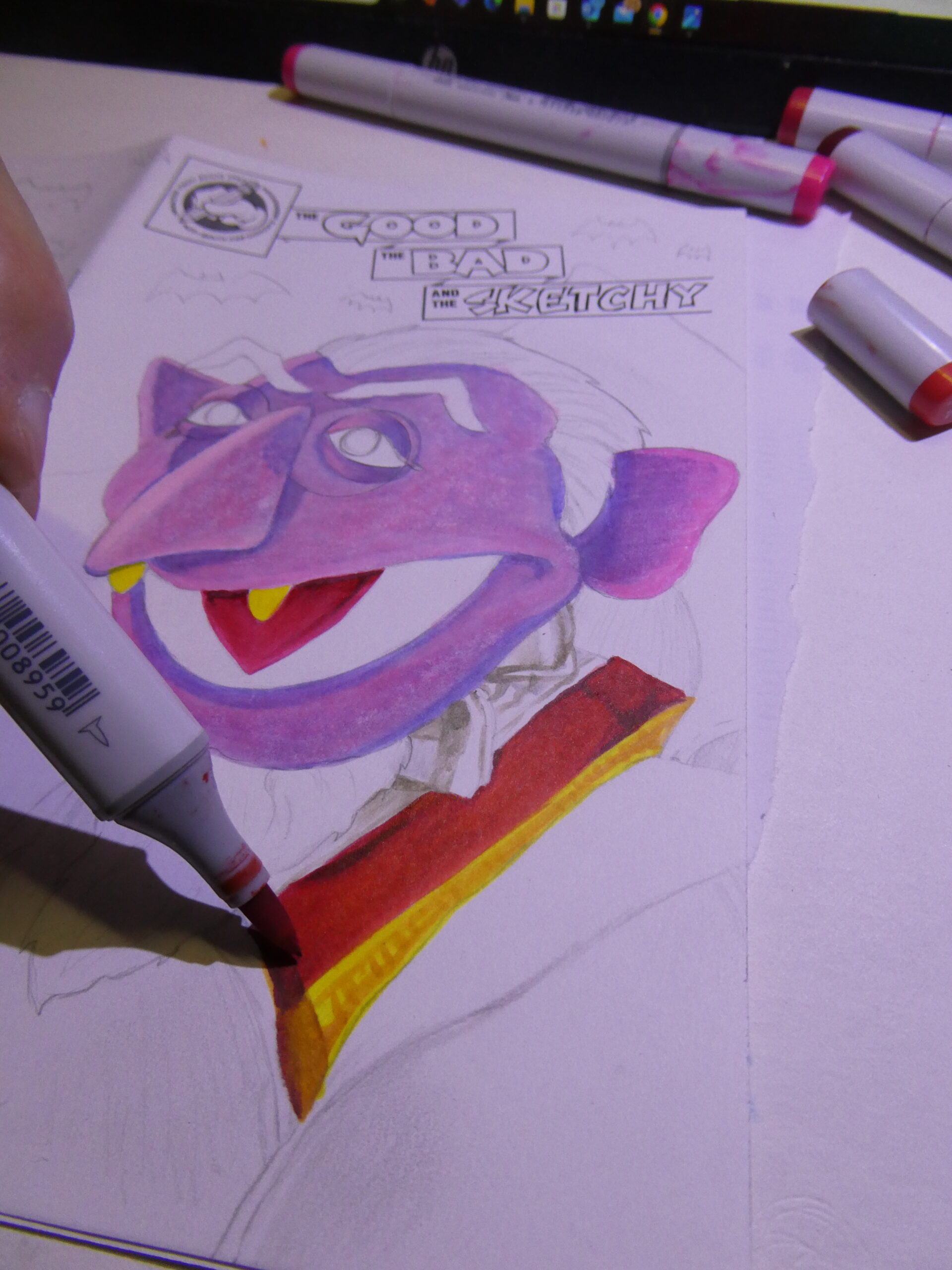 I used Copic markers to color this sketchcover. I’ve been collecting and using them for years now. For the Count I started out with a few different shades of violet/mauve/prune purple markers for his flesh- ugh, fleece.