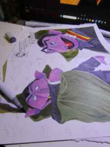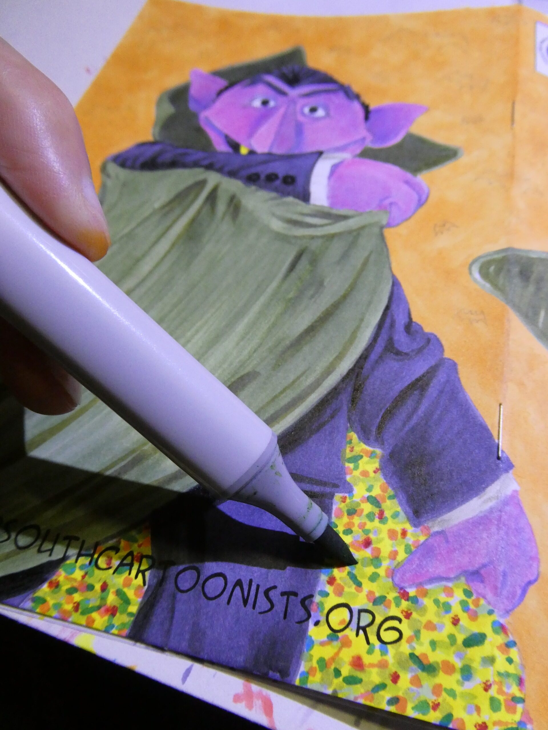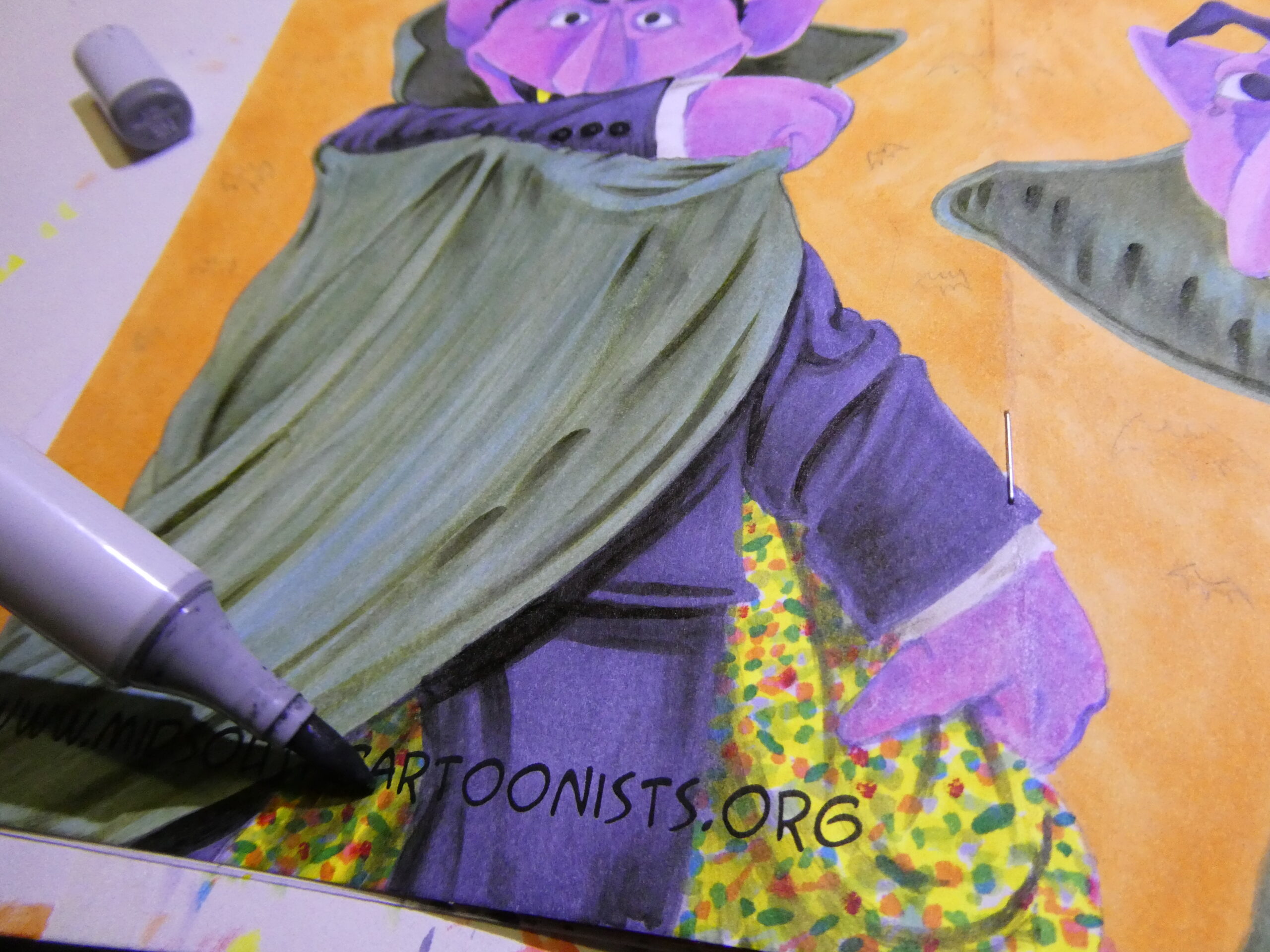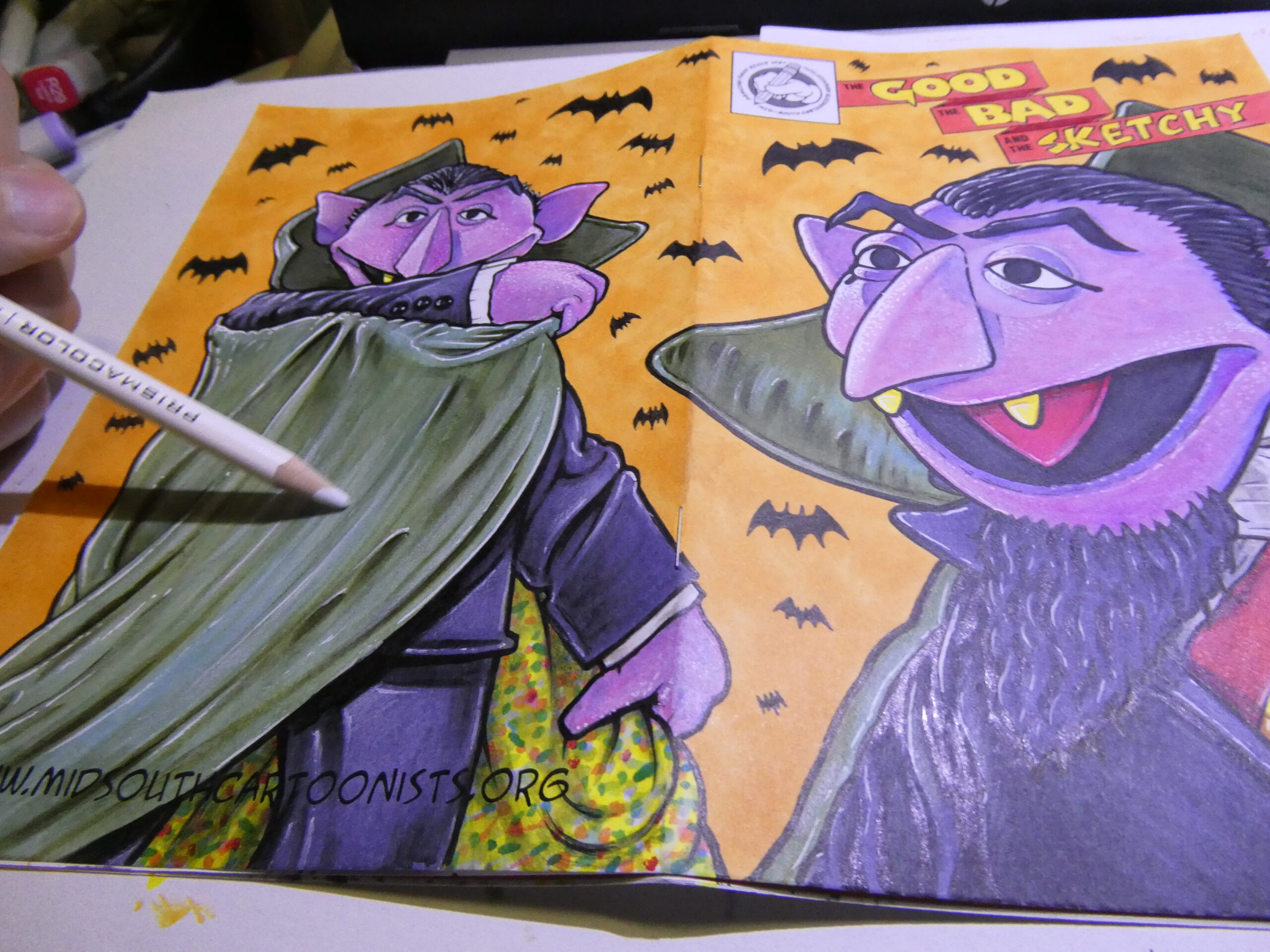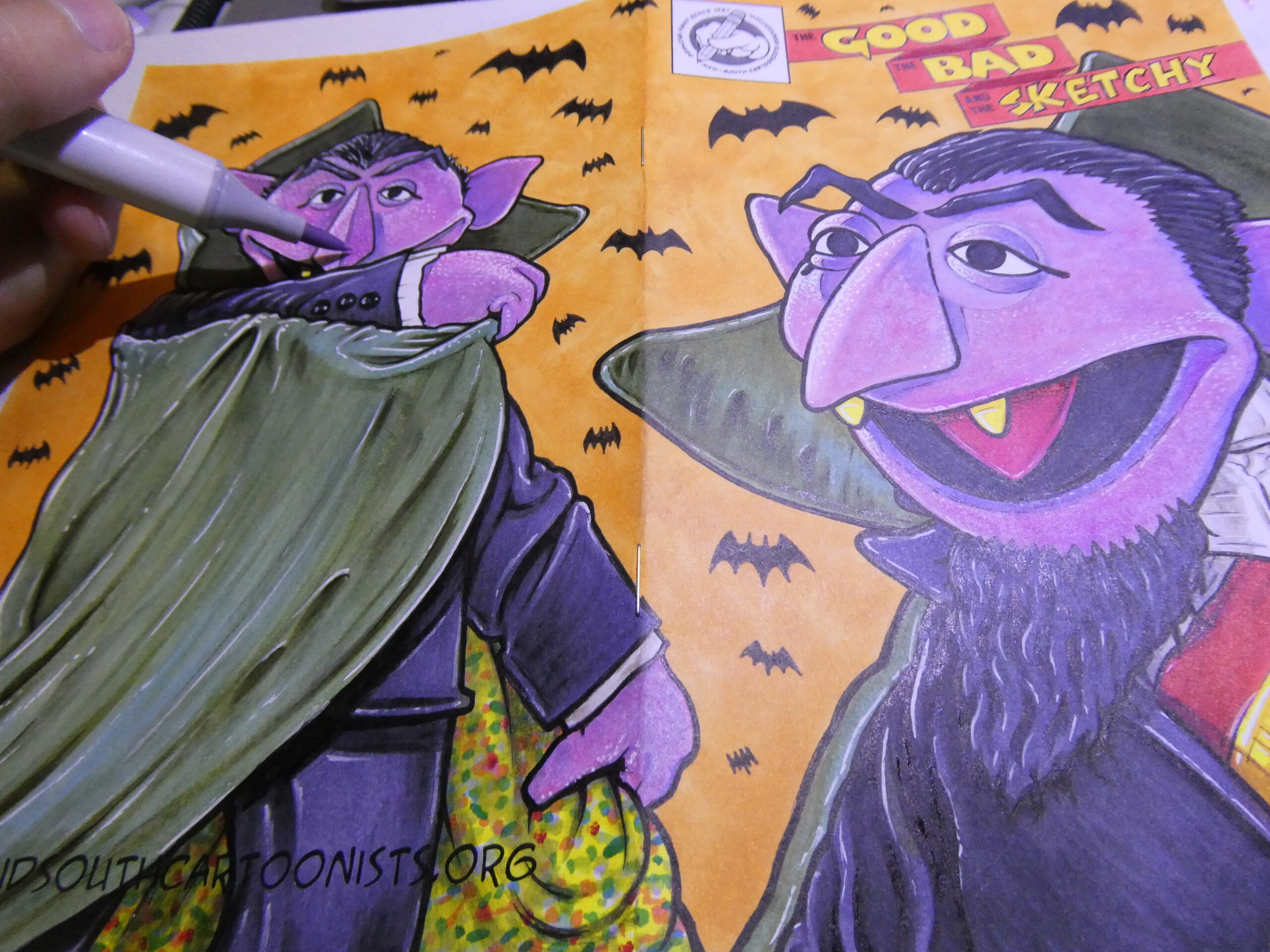 I used Copic markers to color this sketchcover. I’ve been collecting and using them for years now. For the Count I started out with a few different shades of violet/mauve/prune purple markers for his flesh- ugh, fleece.