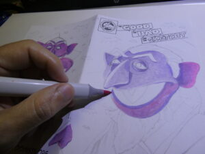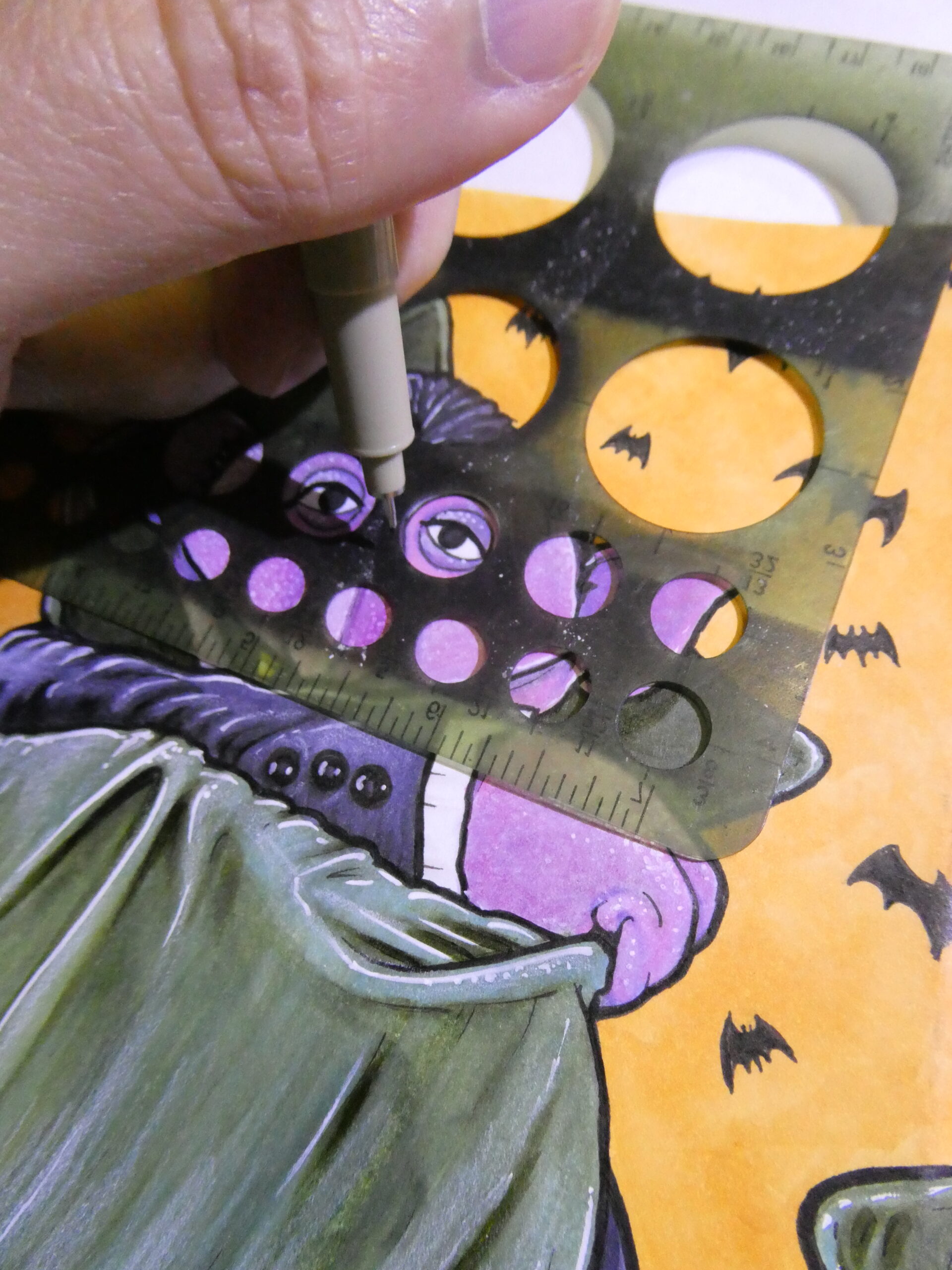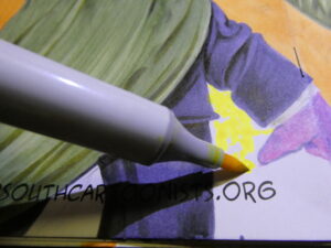 I used a Y38 honey golden yellow Copic marker to color in the background, and then took a YR61 bright orange Copic refill and some torn tissue to to add a bit of texture by dabbing it around on the paper. I’ve done this technique before on other covers and marker illustrations. It helps to add a bit of interest to the solid color background. You don’t have to color in the whole background. Just a bit of color around the figure can help it to stand out in your drawing. Sometimes a background with “high/low” spots can be interesting. If you’re not sure, just experiment and have fun. You can always do a test of your effect or color combinations on a separate sheet of paper before drawing the final background. For this one I wanted it to have a Halloween feel, and figured the orange would go well with the greens, greys, and purples.