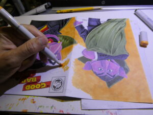 Next I used some reds, yellows and magenta to color his sash, tongue, and fangs. I then used different shades of grey for his suit, hair, and pupils. I also used a bit of grey to shade the greens on the cape. Again, I rarely use just one color to fill in an area on a marker drawing. I’ll at least do a base color and a darker shadow color- and either a lighter highlight color or white. If you can practice blending the colors that will help your work look more polished and professional.