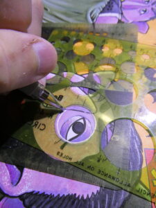 I gently went over areas like the bridge of his nose to blend and bring out the highlights with the white pencil. I then broke out a couple plastic circle templates to draw his monocle. I’ve had these and several others for years (some since high school) and have used them for everything from drawing cartoons and blueprints to airbrushing!