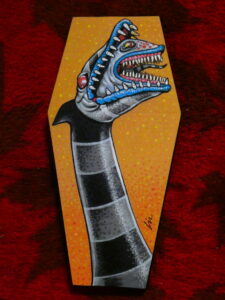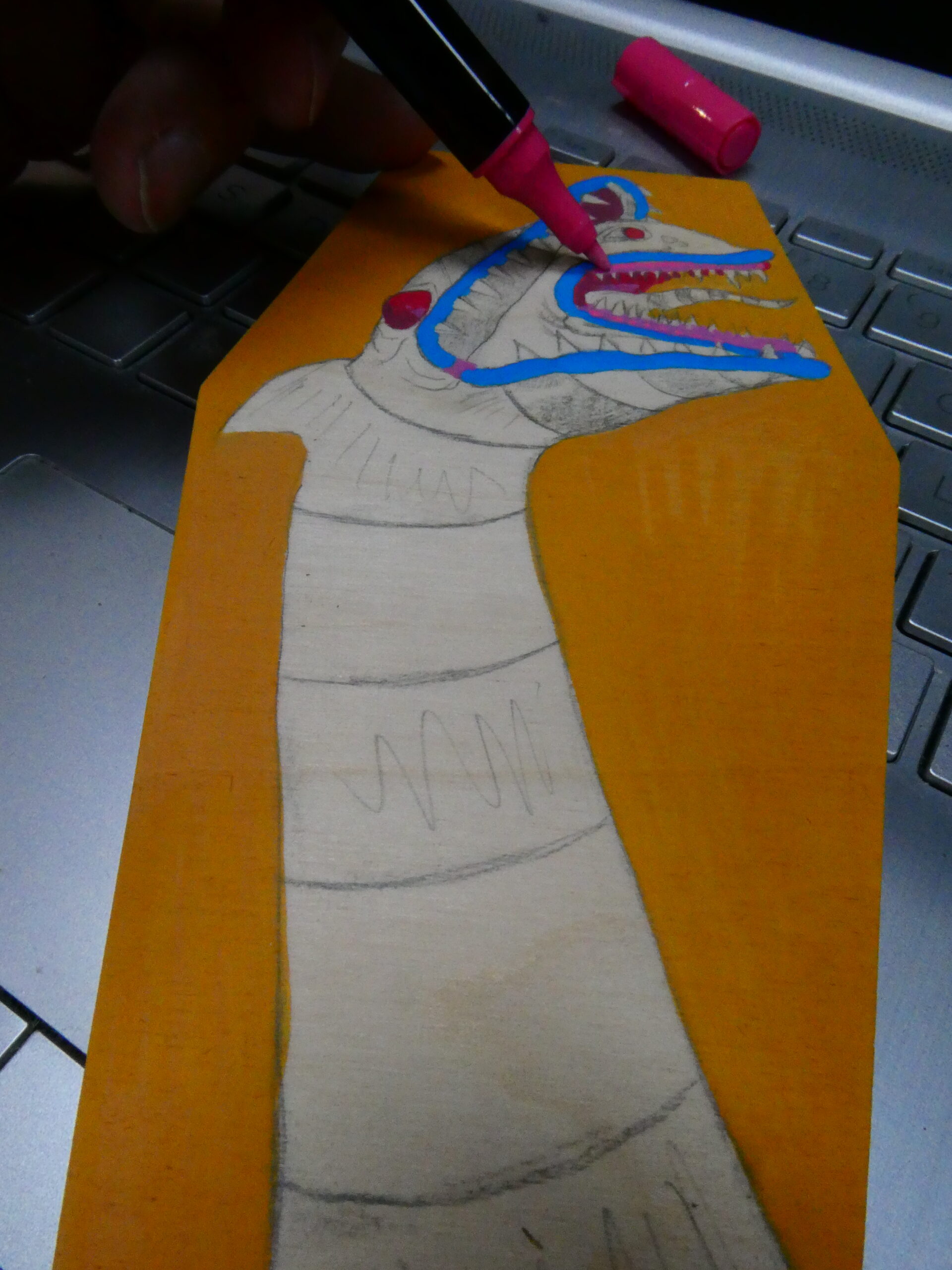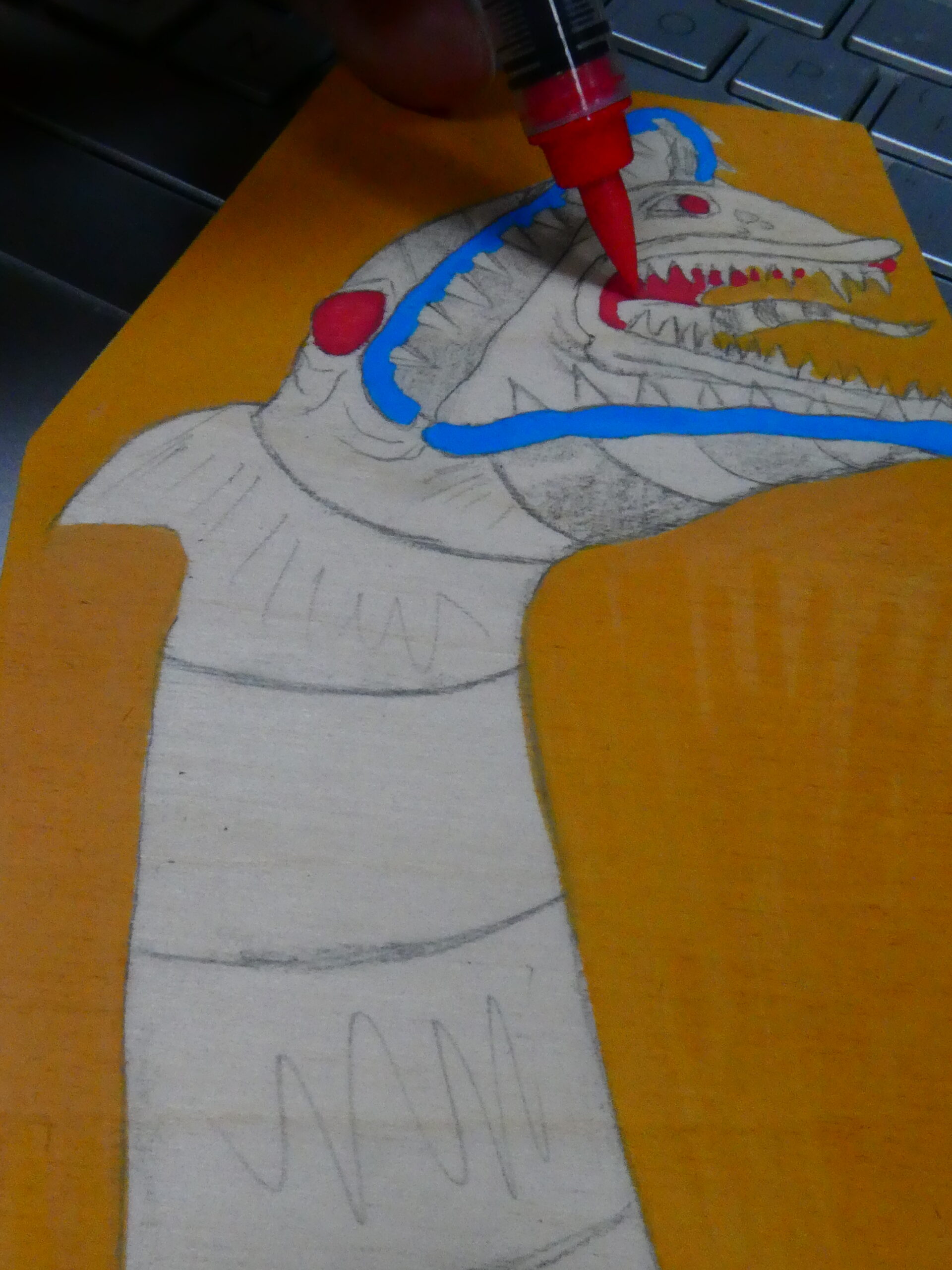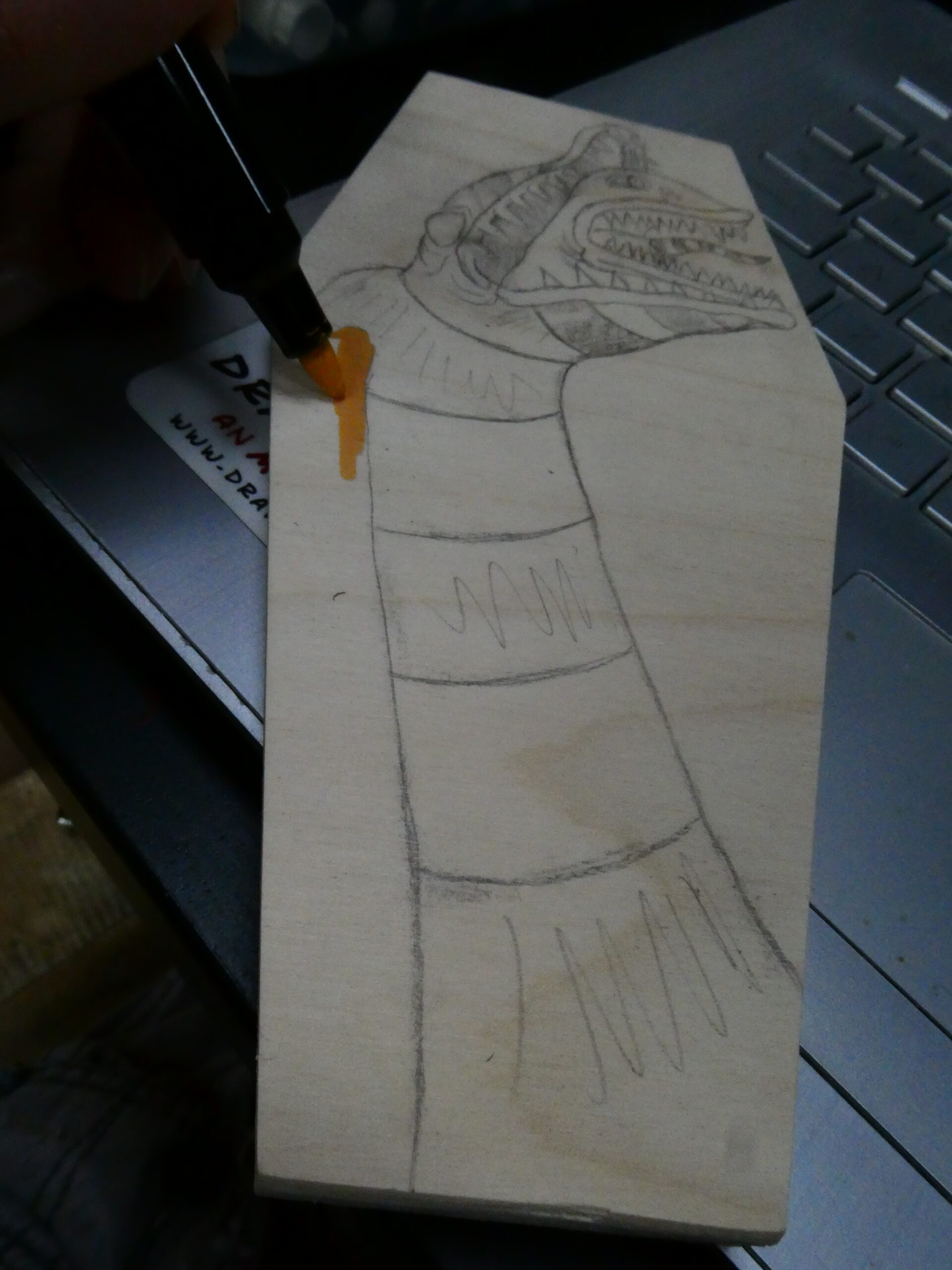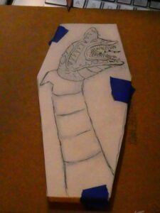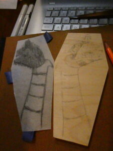 …I then flipped it over and sketched some graphite on the back of the paper with a yellow #2 pencil, flipped it back over, taped it to the coffin panel, and transferred the lines to the board by tracing over them. I removed the paper and started to color in the background with an orange acrylic Sharpie Creative Marker.