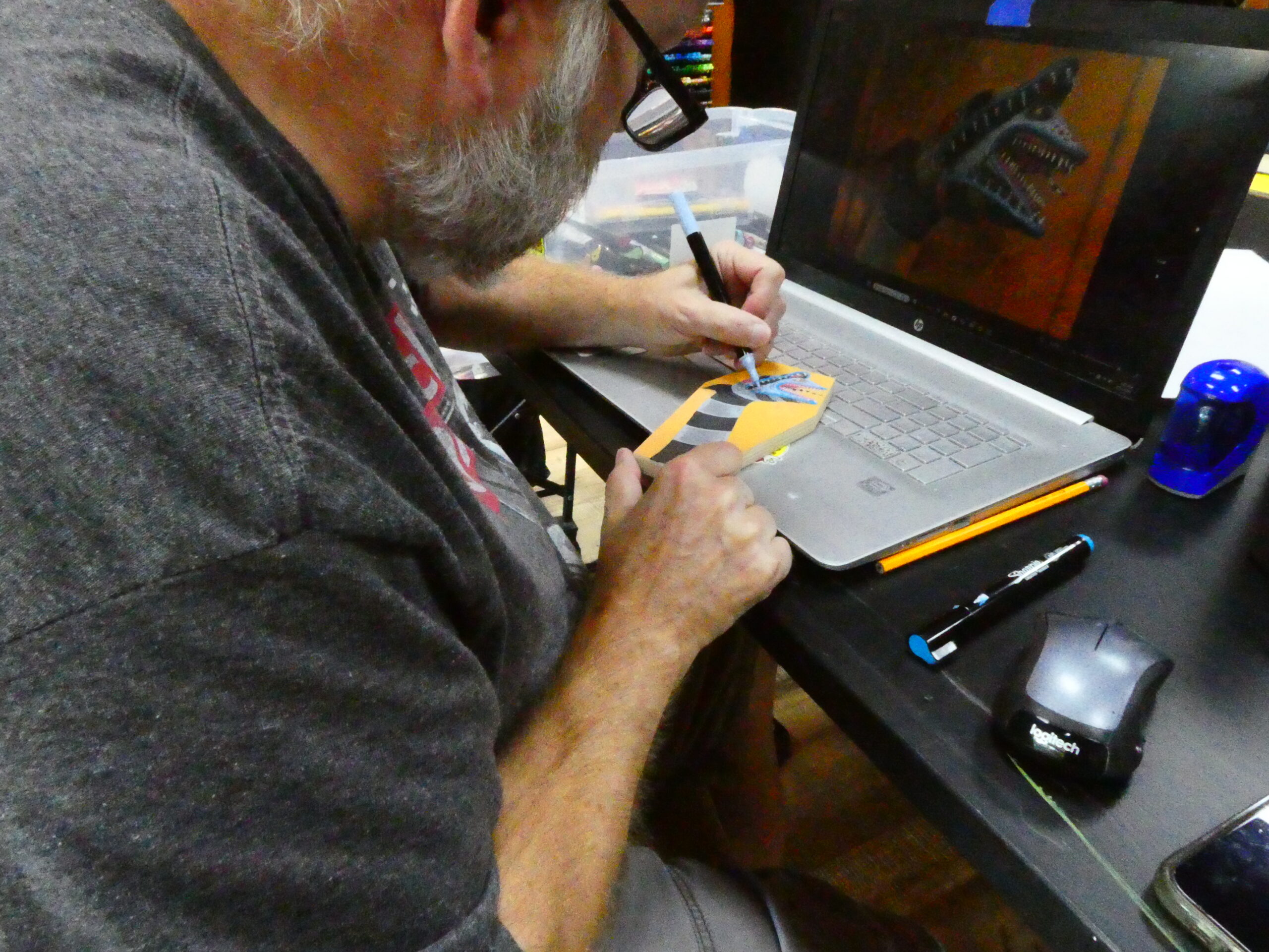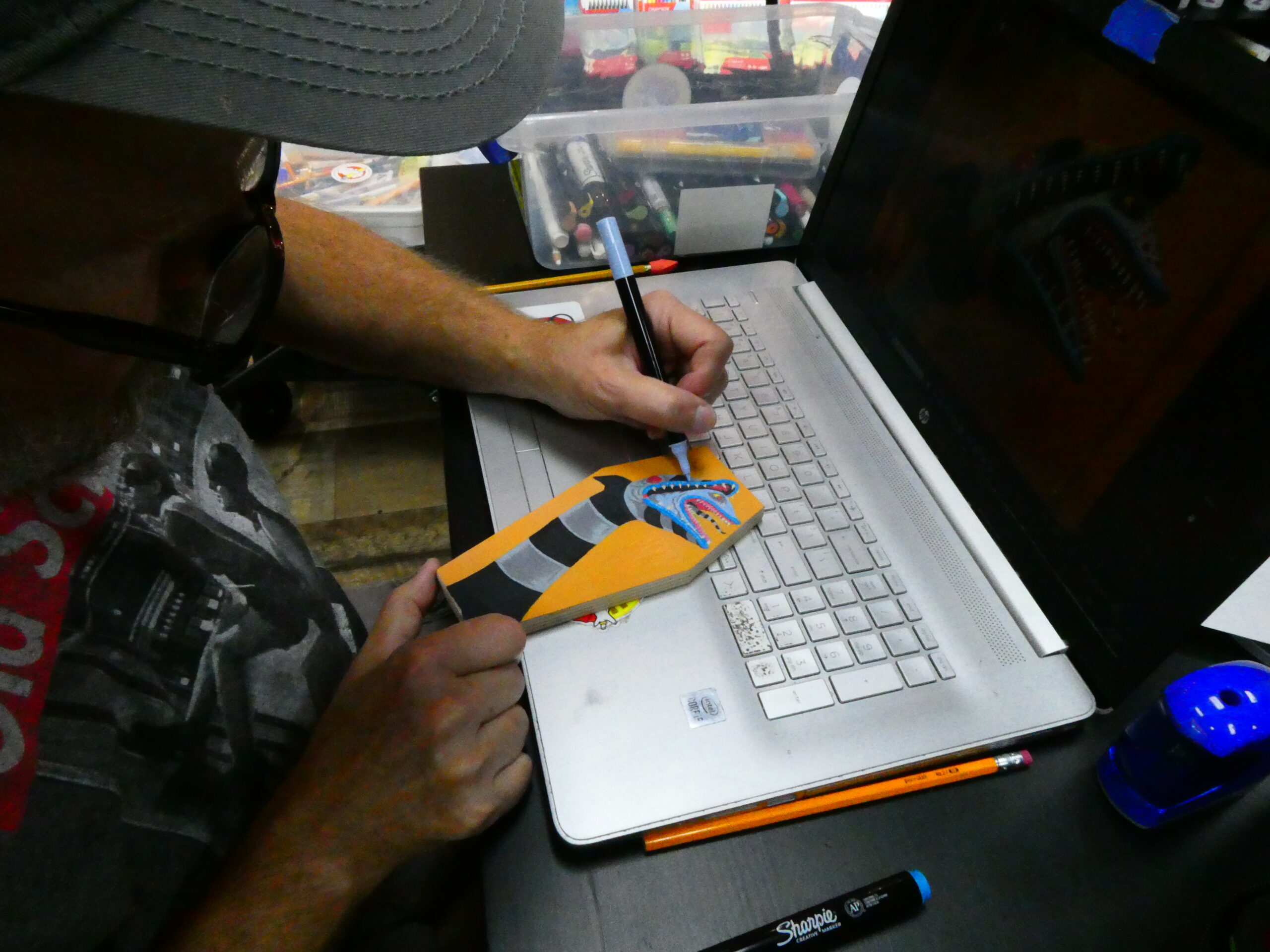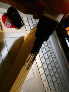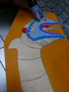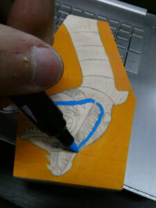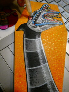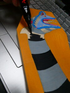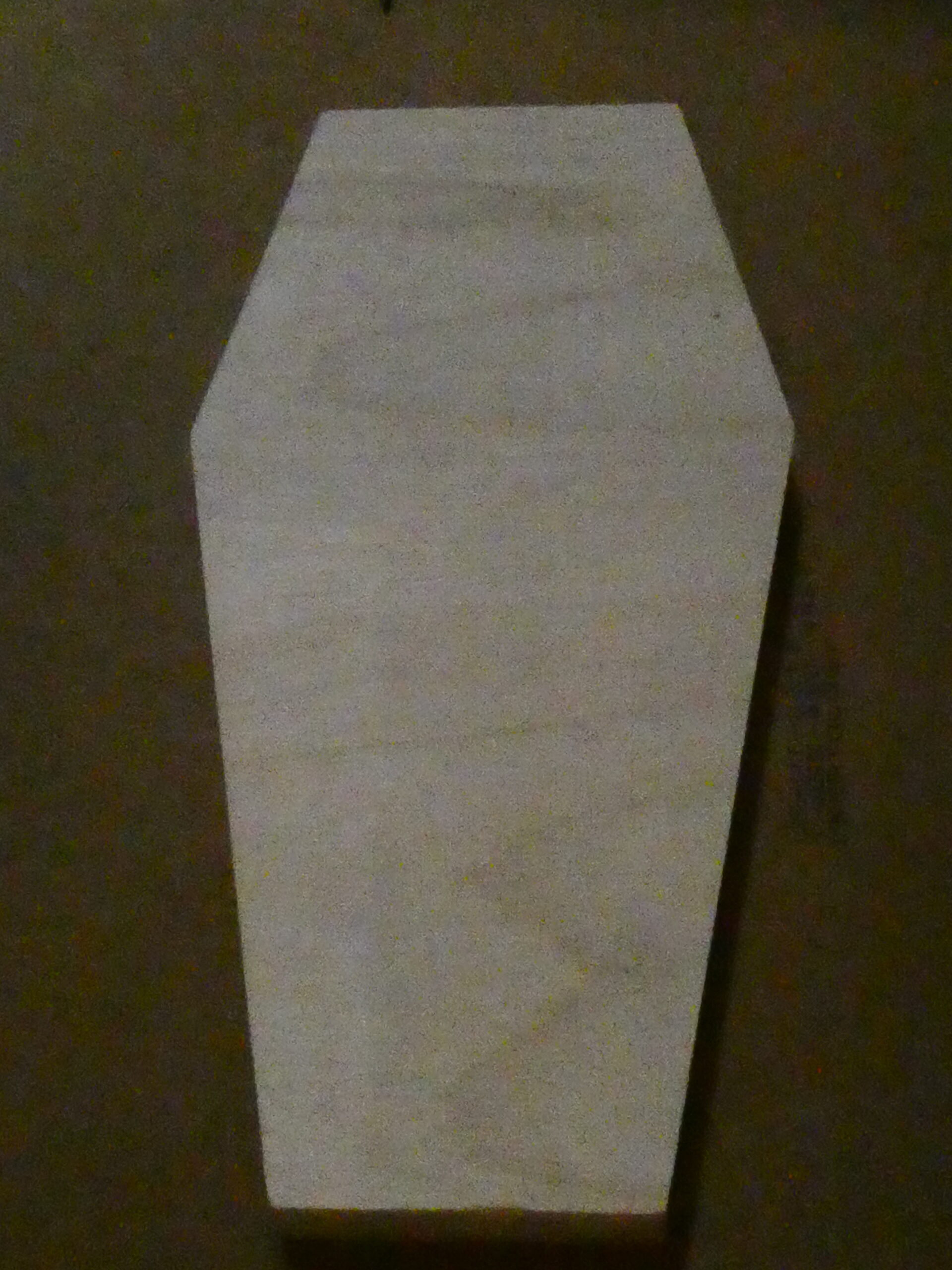 …I then flipped it over and sketched some graphite on the back of the paper with a yellow #2 pencil, flipped it back over, taped it to the coffin panel, and transferred the lines to the board by tracing over them. I removed the paper and started to color in the background with an orange acrylic Sharpie Creative Marker.