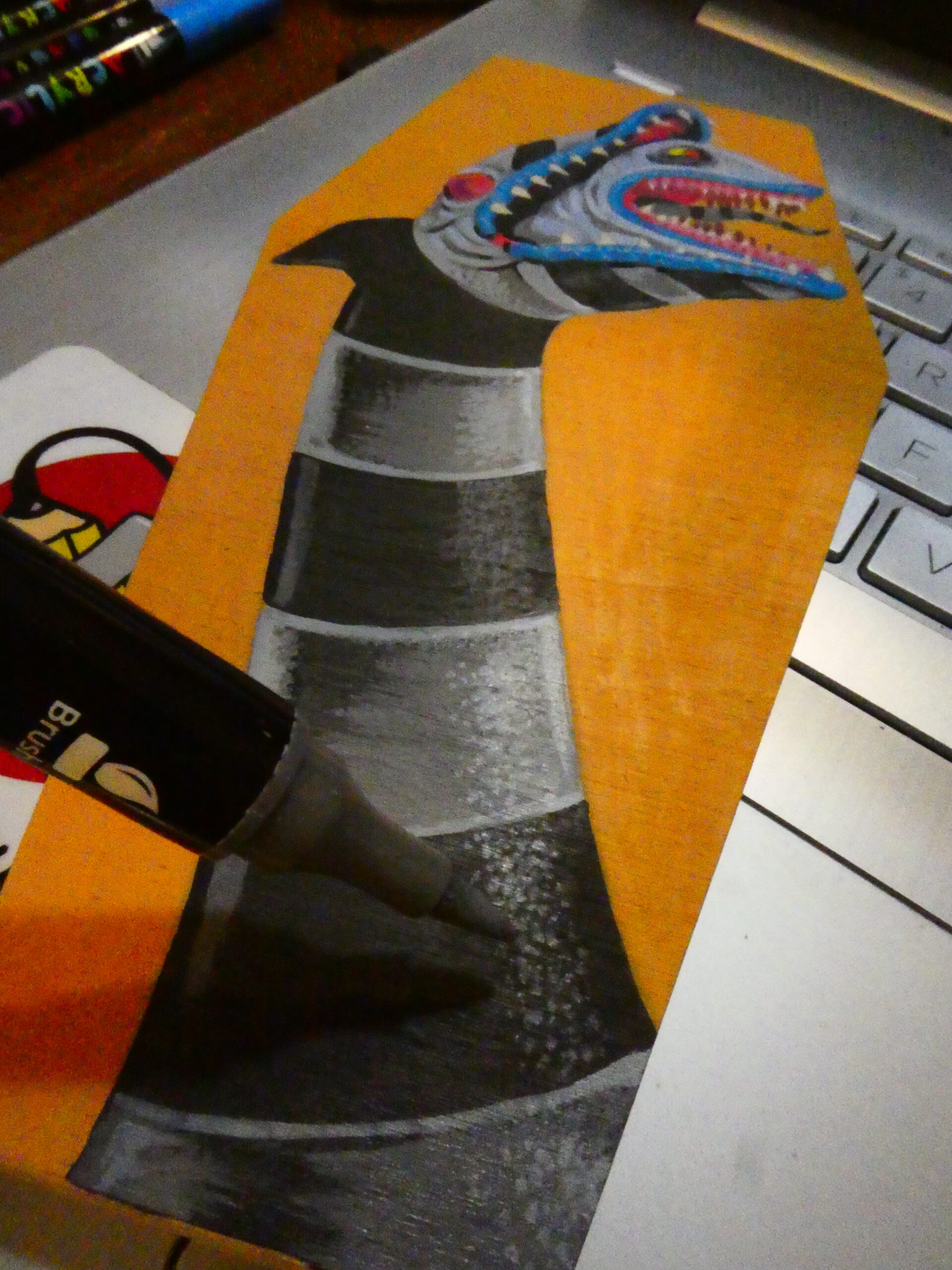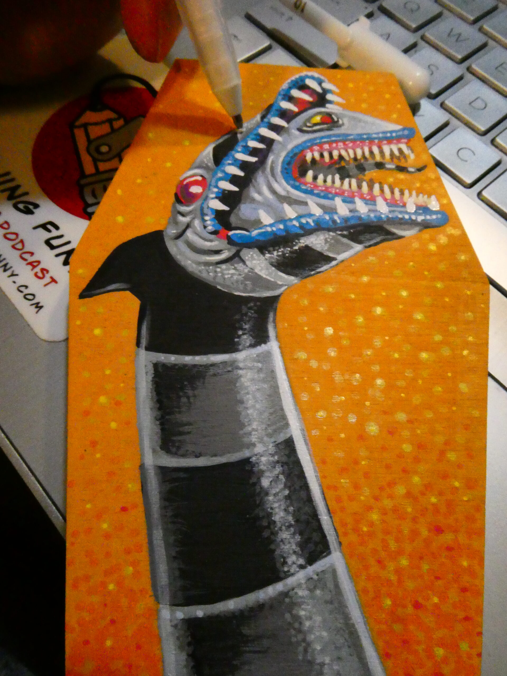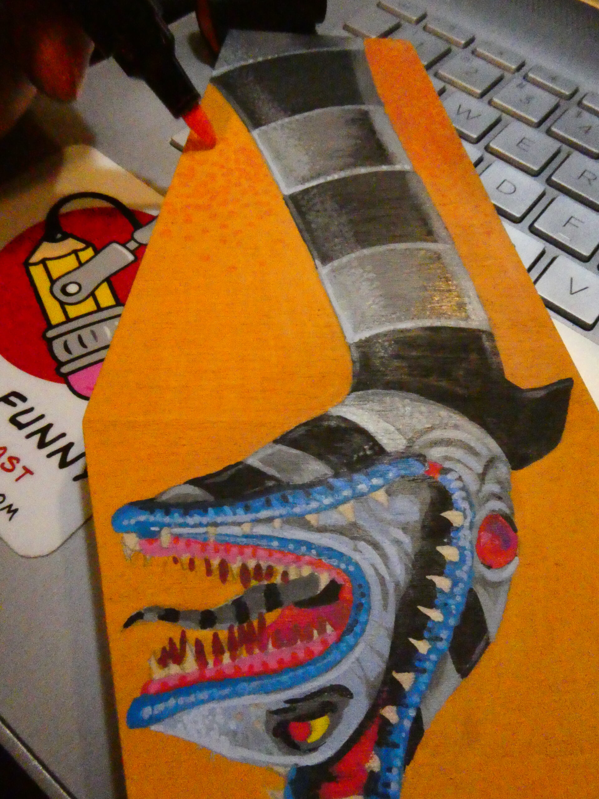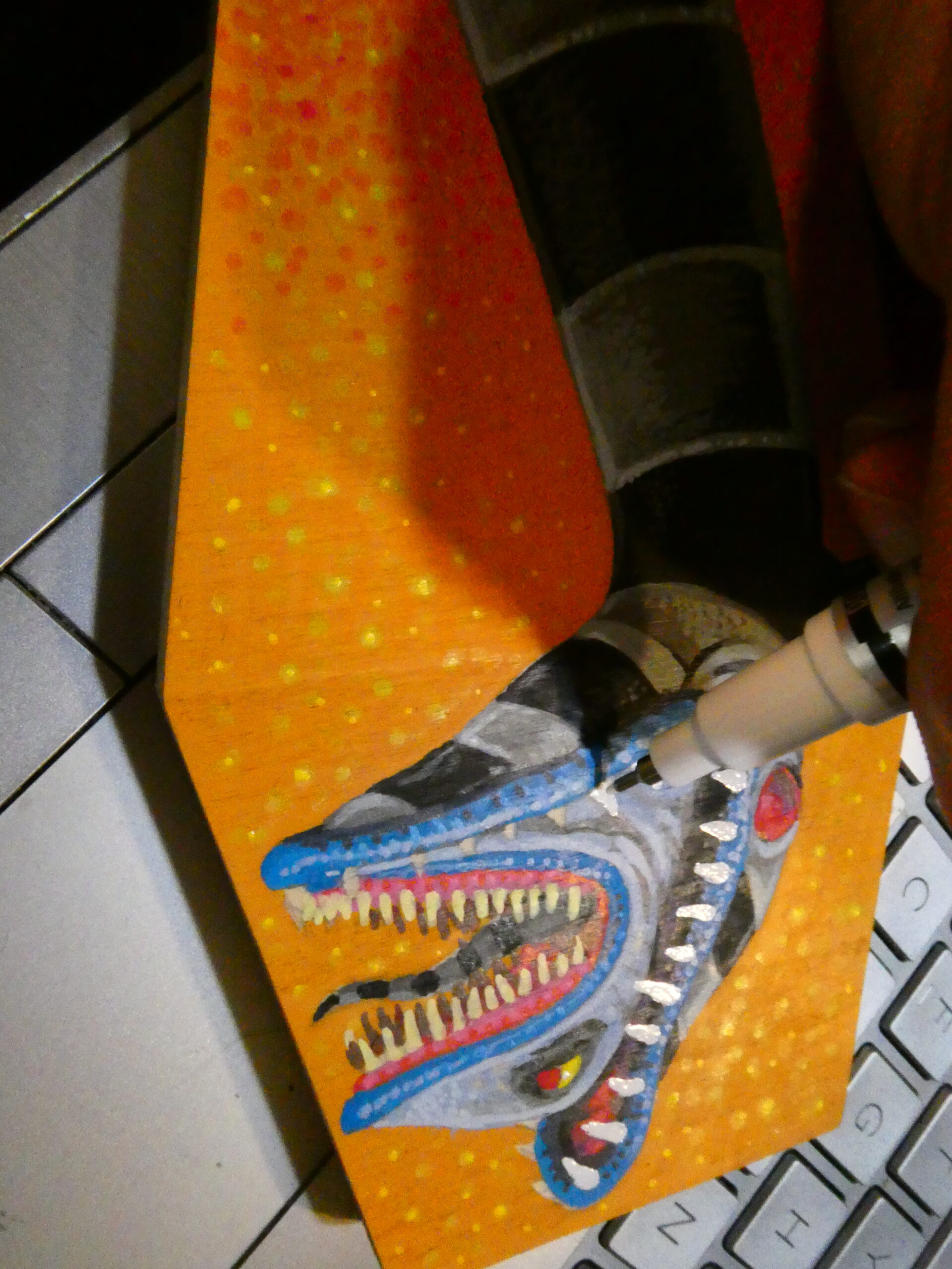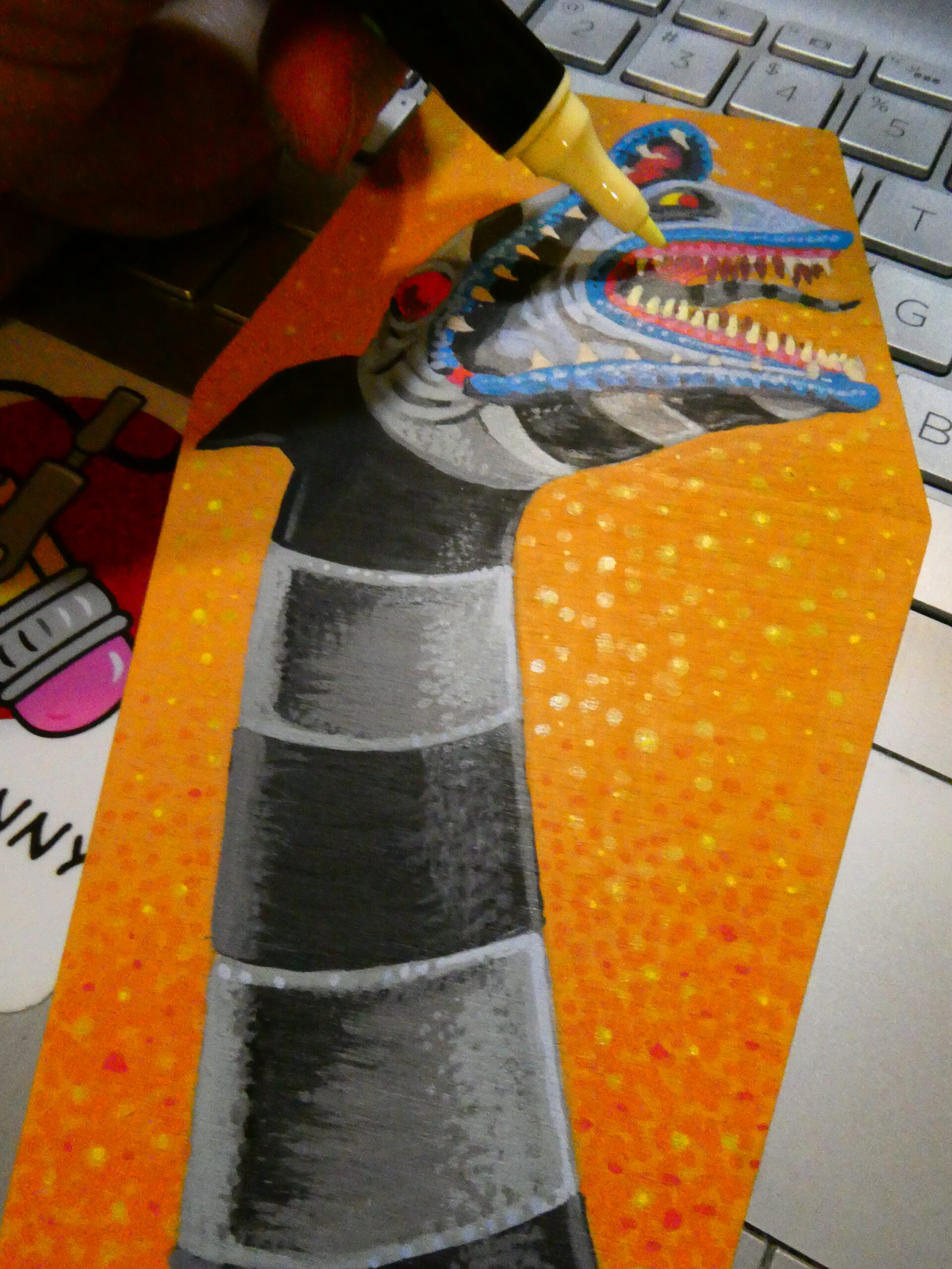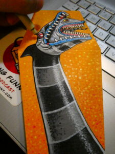 I did more stippling with red, orange, and yellow to give the background some texture, and used some yellow on the teeth and eyes.