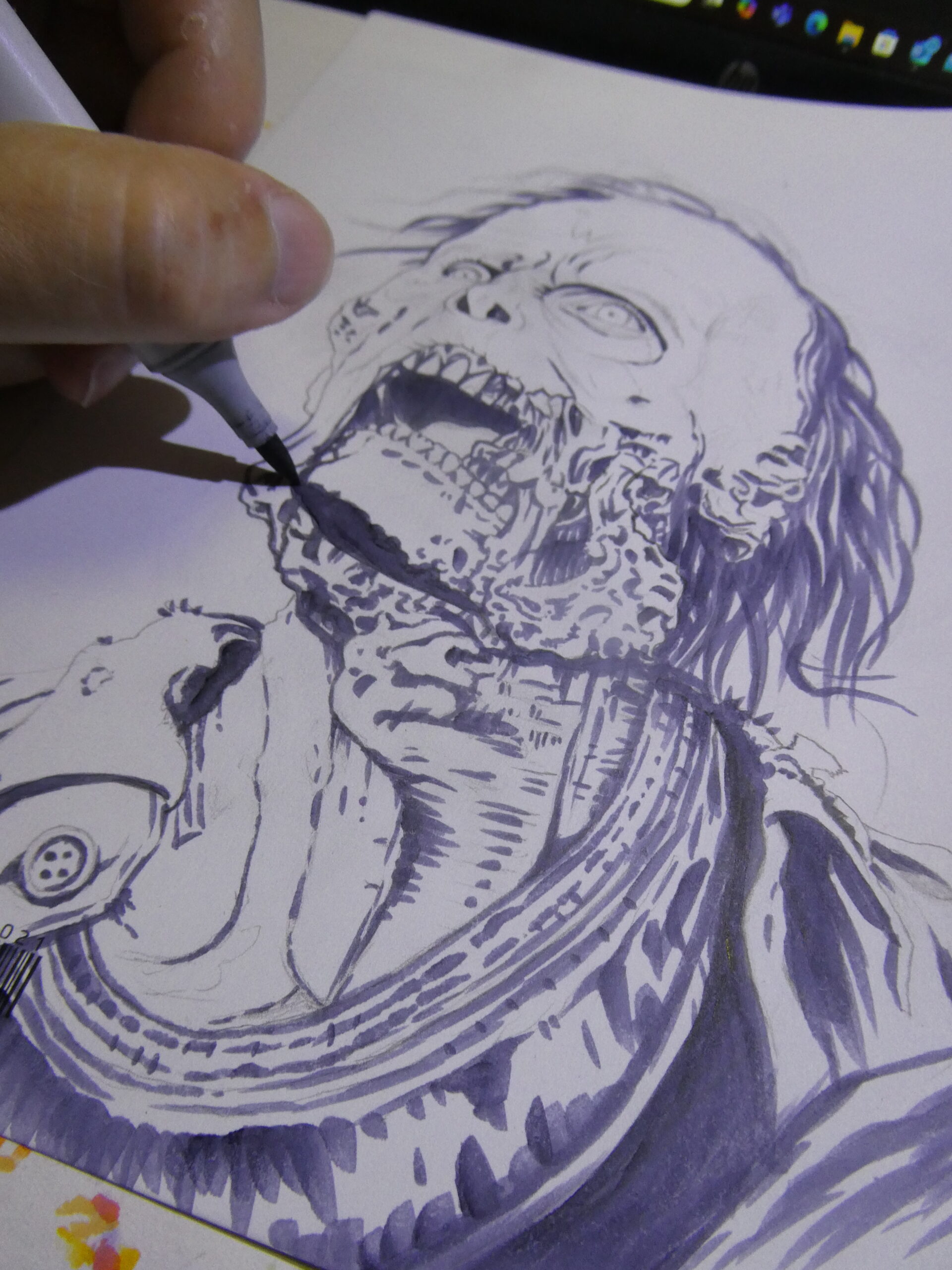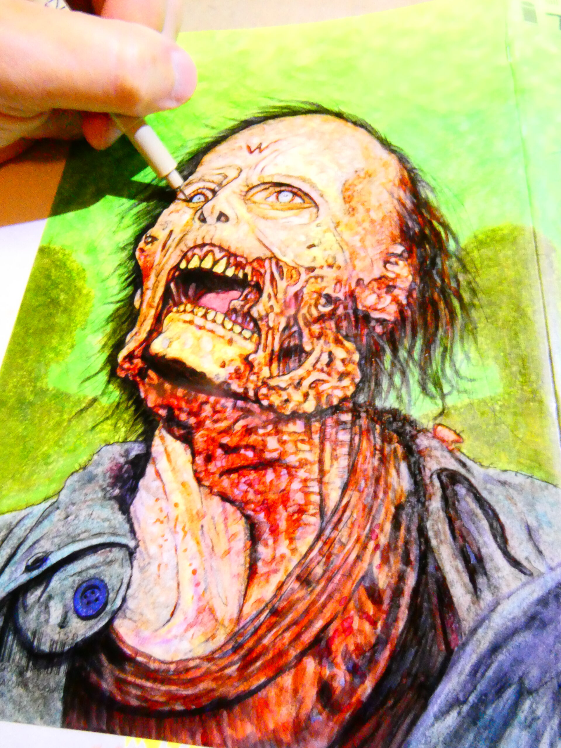Once the background was filled in I started back on the two zombies and their clothes with a few different shades of grey Copics.