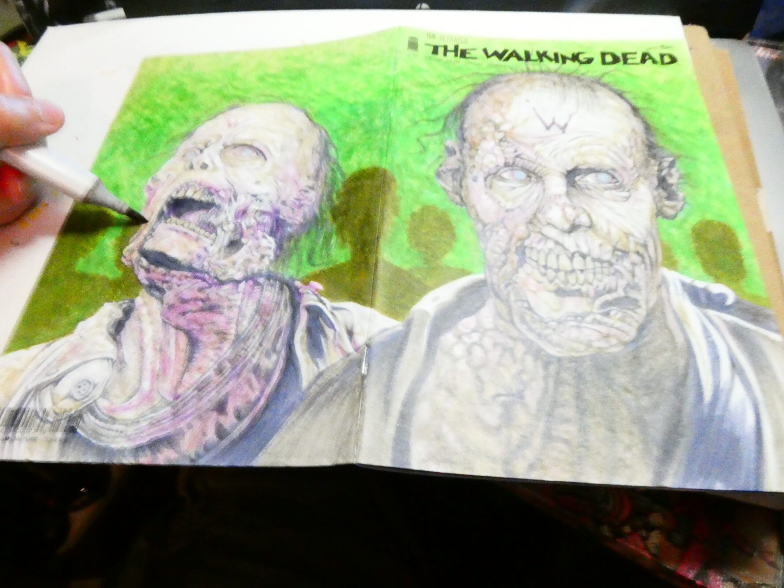 I needed a break from working on the two walkers, so I started filling in the background with different shades of green Copics, Letraset, and Prismacolor markers.