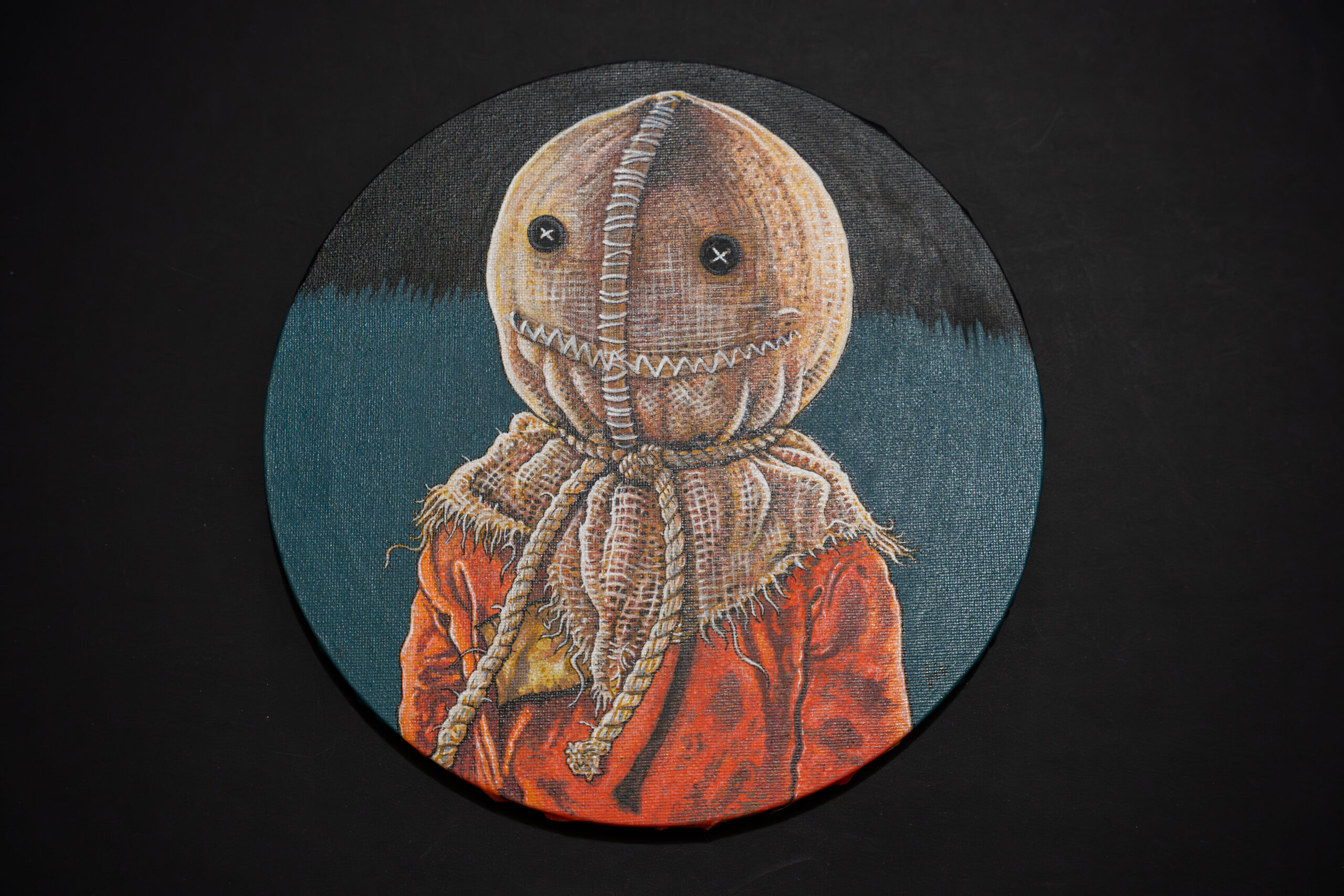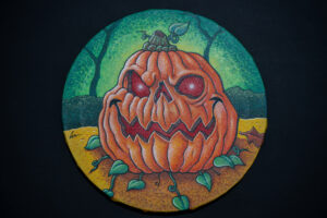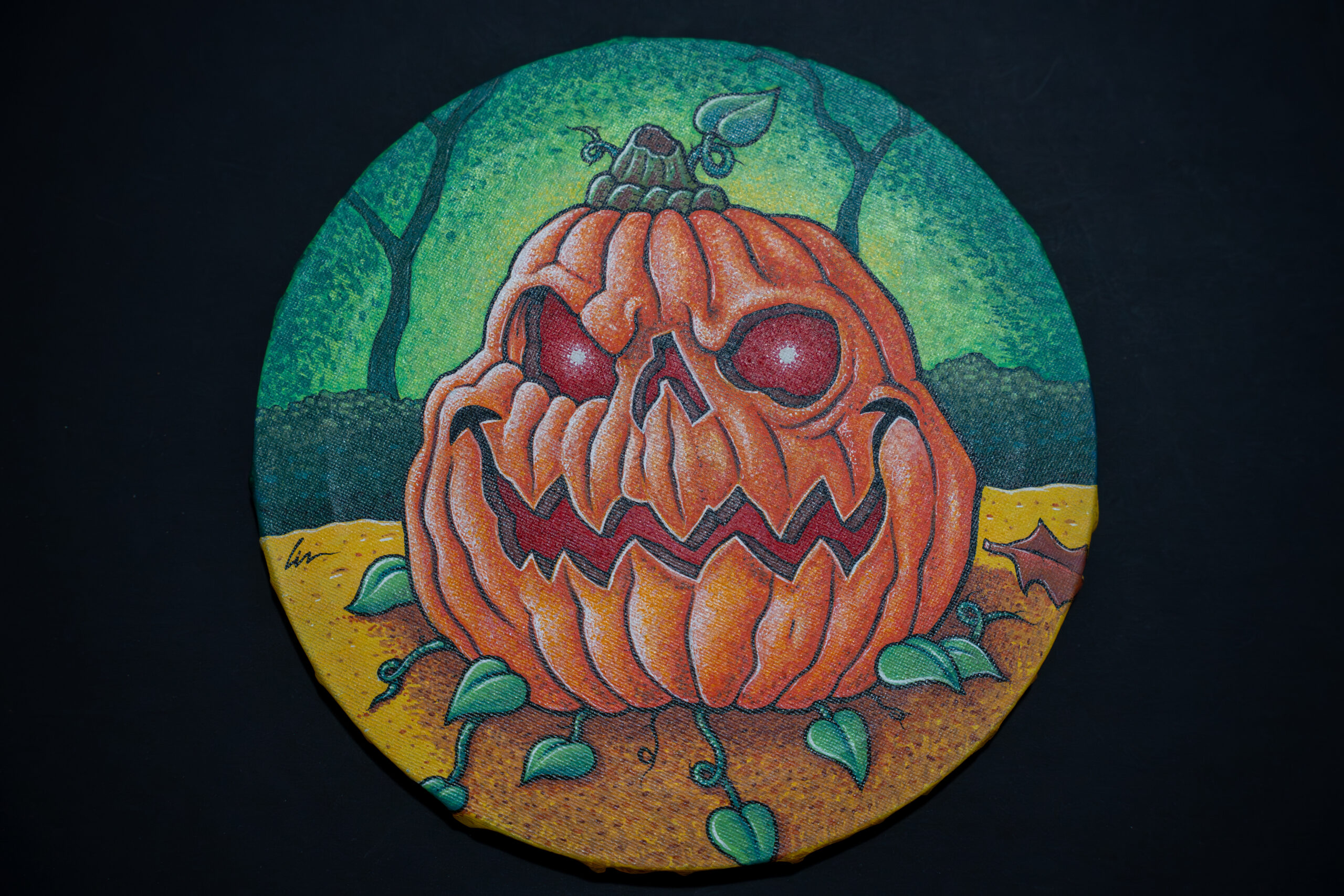 I have two of my new round acrylic marker paintings on 10″ canvases- a Sam/Trick ‘r Treat and a Jack-o-lantern/Pumpkin. They were at the “Drawn of the Dead” art show, but are now just $75 for Sam (from $100) and $50 (from $75) for the pumpkin painting.